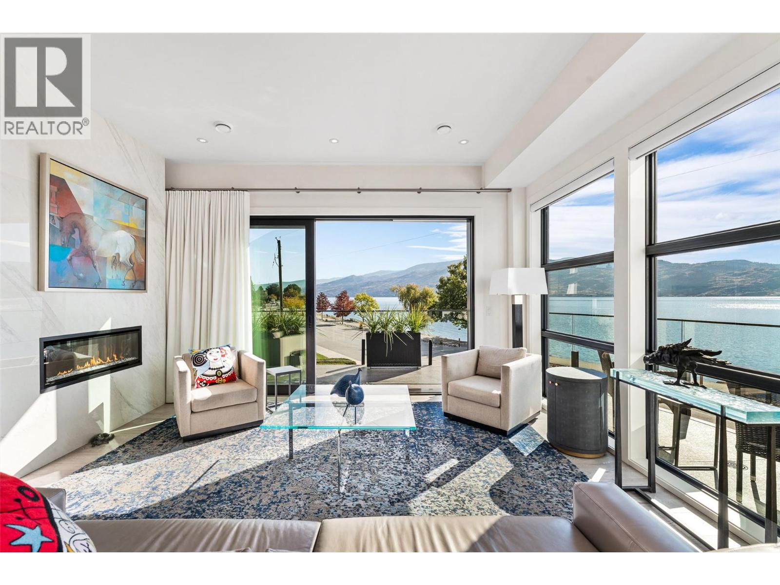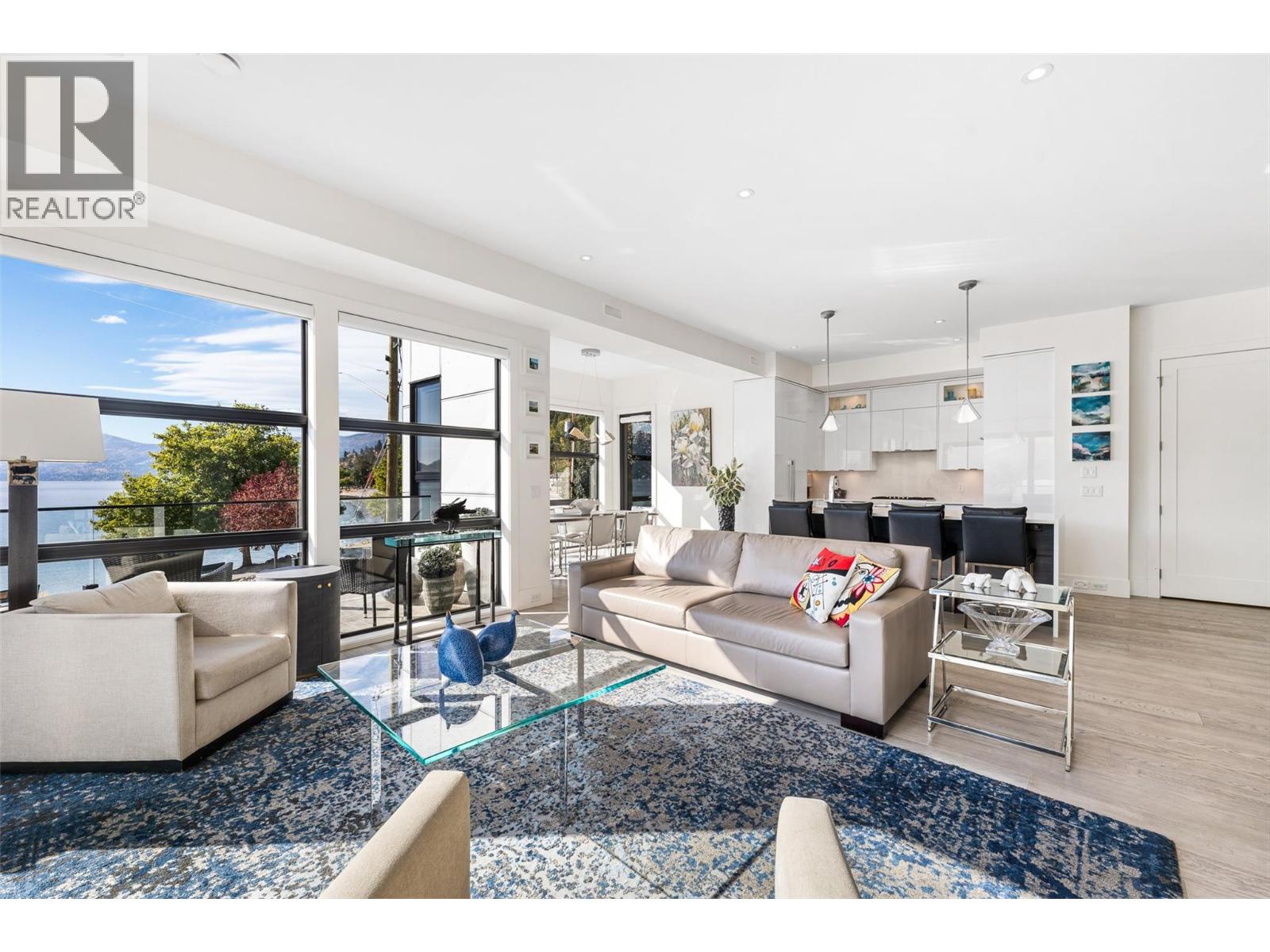 Set in the heart of Peachland’s vibrant waterfront, this architecturally striking residence by Lakepoint Homes offers refined design and a seamless connection to the Okanagan lifestyle. One of only seven exclusive homes, this end unit sits closest to the water, just steps from the beach, cafes and boutique shops along Beach Avenue. Soaring 10-ft ceilings and floor-to-ceiling Marvin windows flood the interior with natural light, while wide-plank white oak floors and a floating glass staircase add a sense of understated sophistication. The open-concept main level is ideal for entertaining, featuring a chef’s kitchen with Thermador appliances, quartz surfaces, and a statement island that flows into the dining and living areas, framed by panoramic lake and mountain views. Expansive sliding doors open to a wrap-around deck with glass railings, extending your living space outdoors. A private elevator connects all three levels, including the tranquil upper floor where the primary suite offers two walk-in closets, a spa-inspired ensuite, and access to two serene view decks. An additional bedroom with an adjacent bath, office, and laundry complete the layout. The double garage provides abundant storage, epoxy floors, and EV charging. With multiple, distinct outdoor living spaces and meticulous attention to detail throughout, this home embodies elevated lakeside living in one of Peachland’s most charming waterfront communities. (id:58842)
