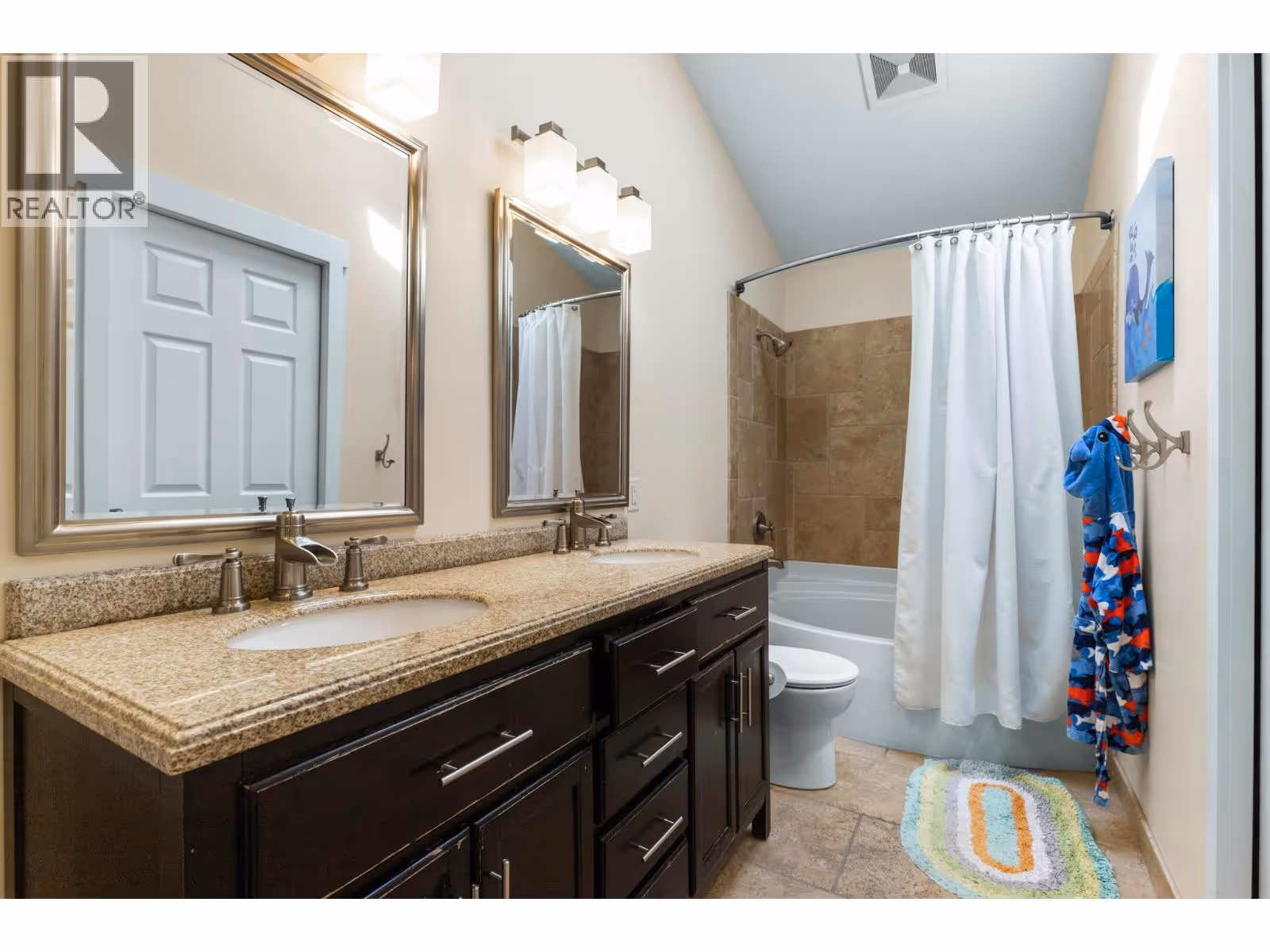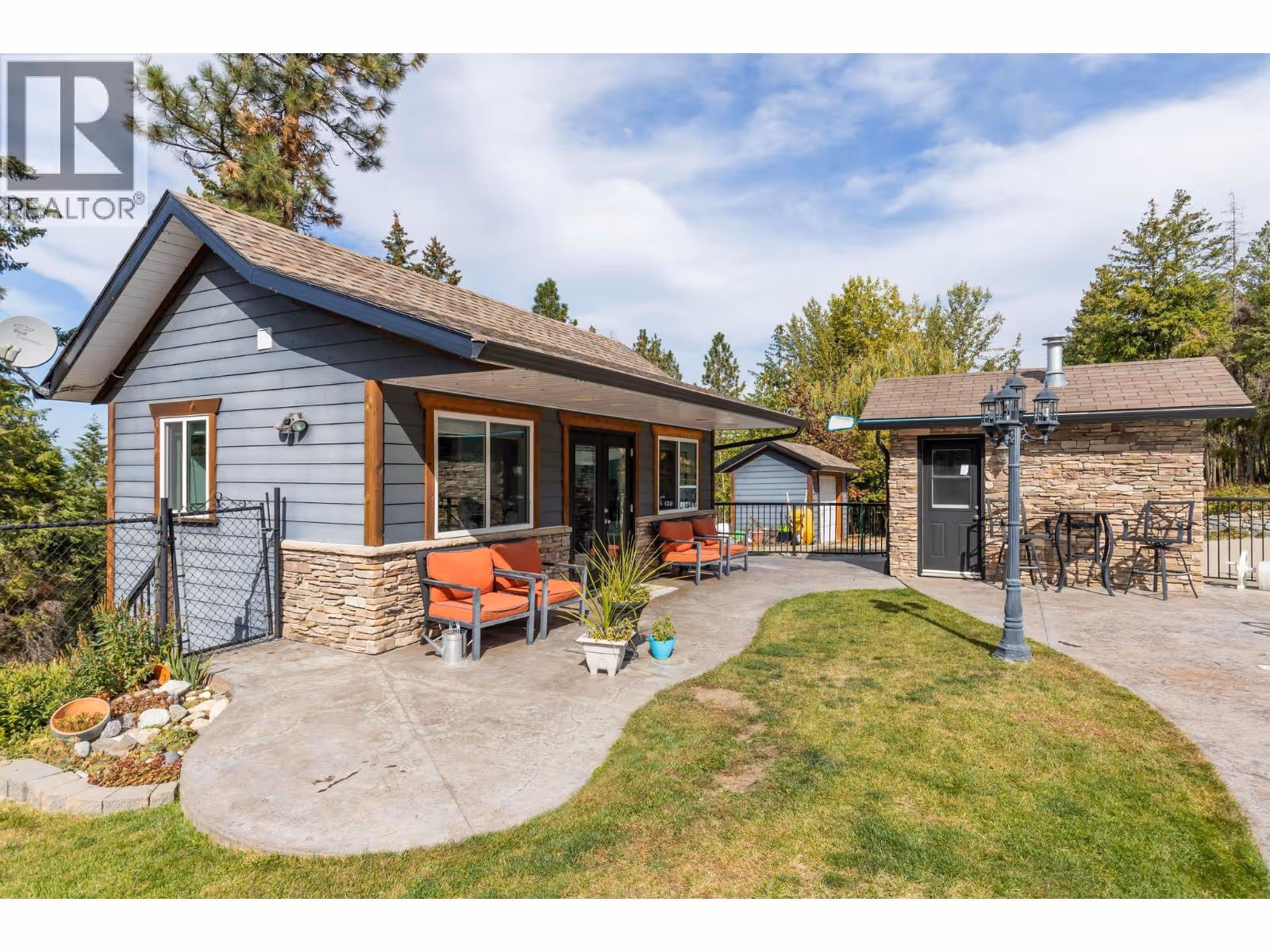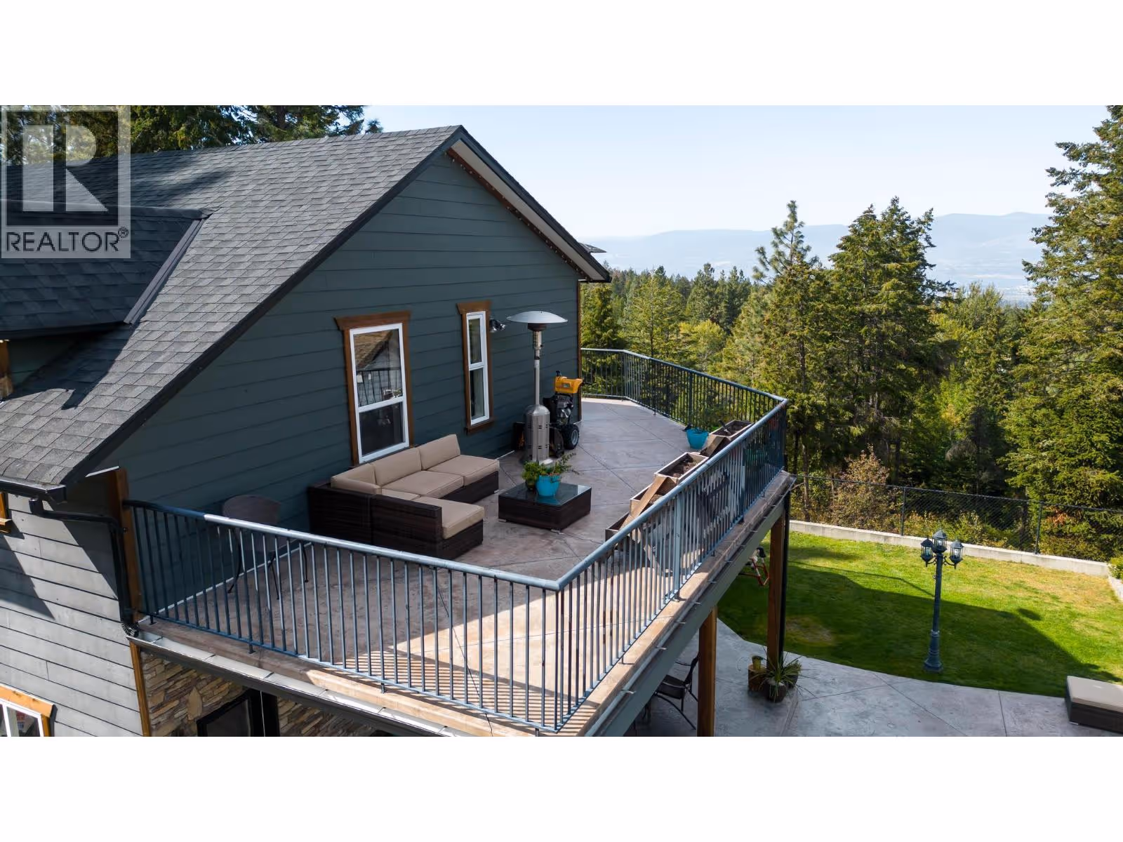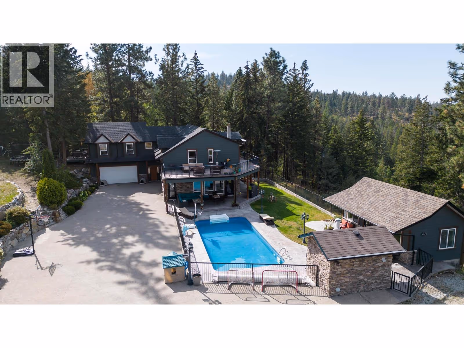 Welcome to this exceptional 9.9 acre property in sought after South East Kelowna, featuring a 3,600+ sq ft home, detached 4 car garage, pool, and more. The lower level offers a welcoming foyer, double garage, spacious family room with fireplace, one bedroom, full bathroom, and access to a large patio. Upstairs, the family friendly floor plan includes a primary bedroom wing with walk-in closet and private ensuite, plus two additional bedrooms with a shared full bath. The open concept kitchen and living area boast vaulted ceilings, stainless steel appliances, marble countertops, and access to a wrap around balcony with stunning lake, city, and valley views. Outdoor living is a dream with an expansive in-ground pool, concrete deck, and a pool house complete with kitchen, full bathroom, and guest accommodations— ideal for inlaws, visitors, or short term rental opportunities. A large gym space adds to the versatility of this property. The 9.9 acres offer privacy, elbow room, and ample space for children, pets, and recreational parking. A charming creek runs through the property, enhancing the peaceful setting. This is a rare opportunity to own nearly 10 acres in South East Kelowna with a spacious home, detached garage/workshop, pool, guest quarters, gym, and panoramic views. (id:58842)