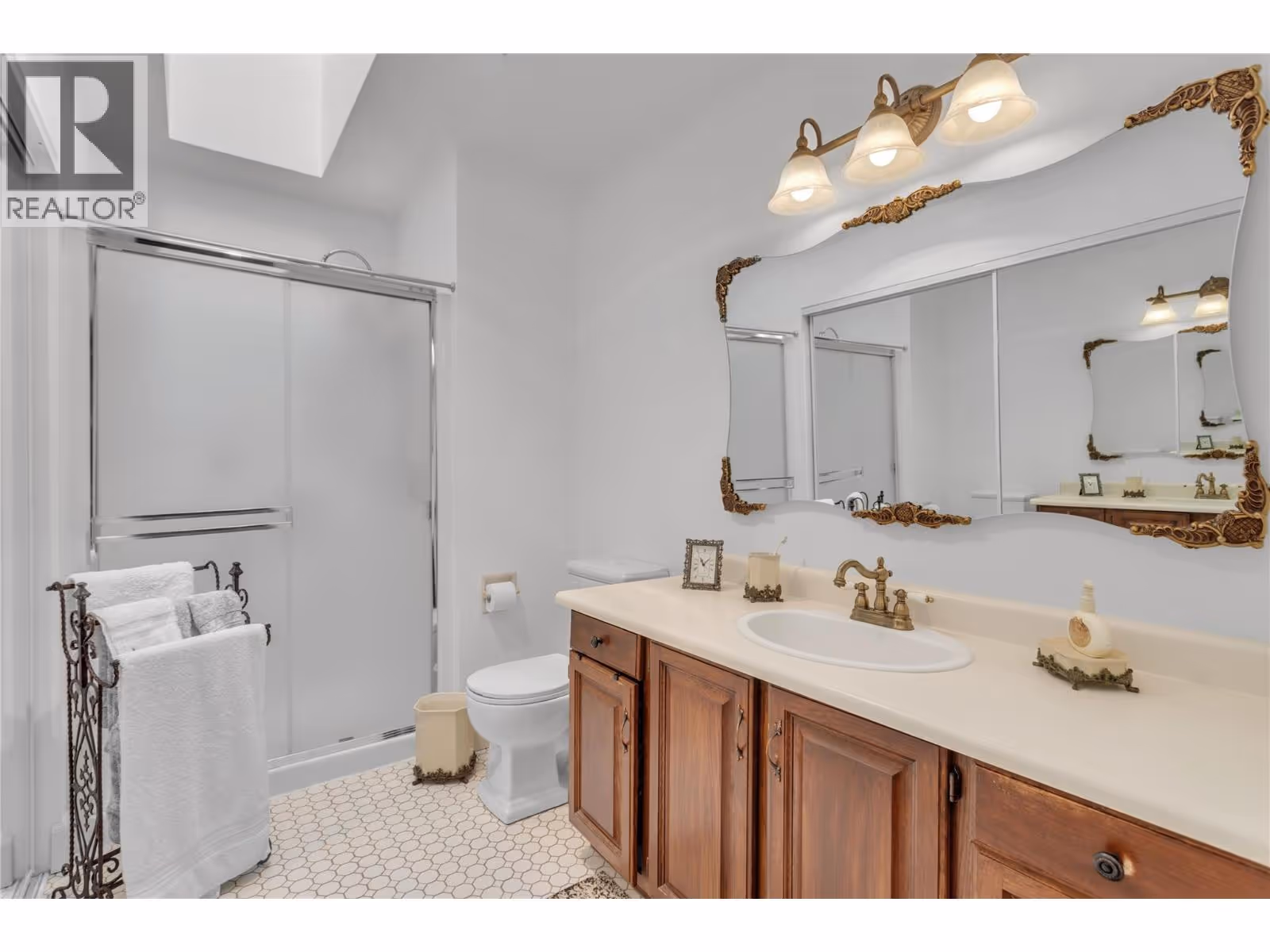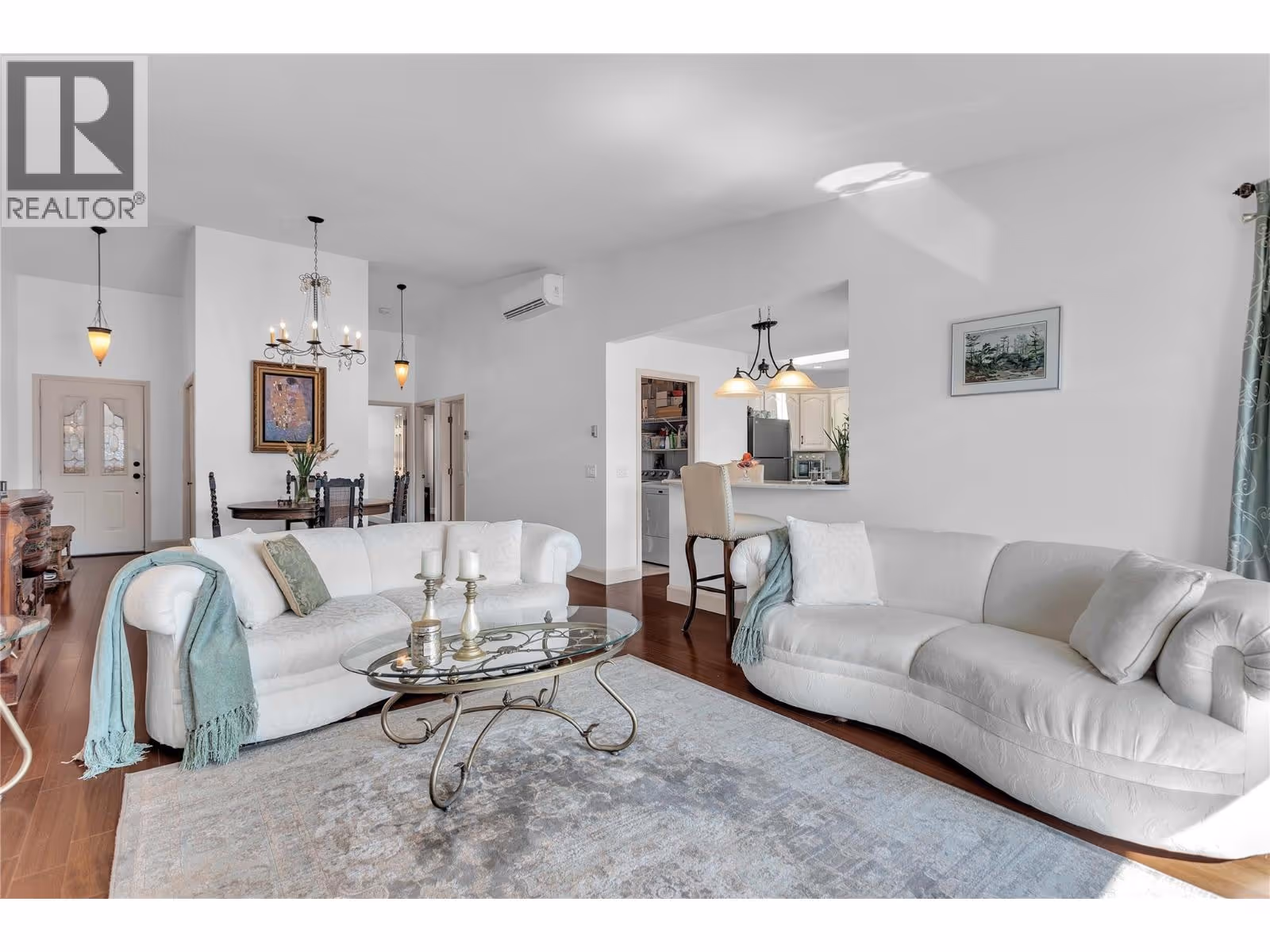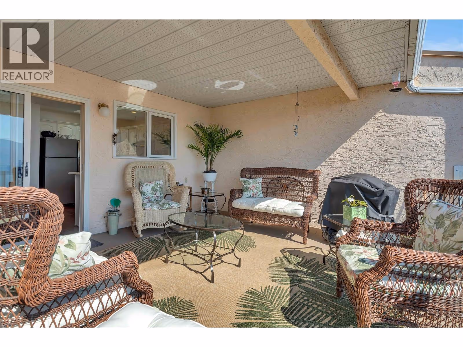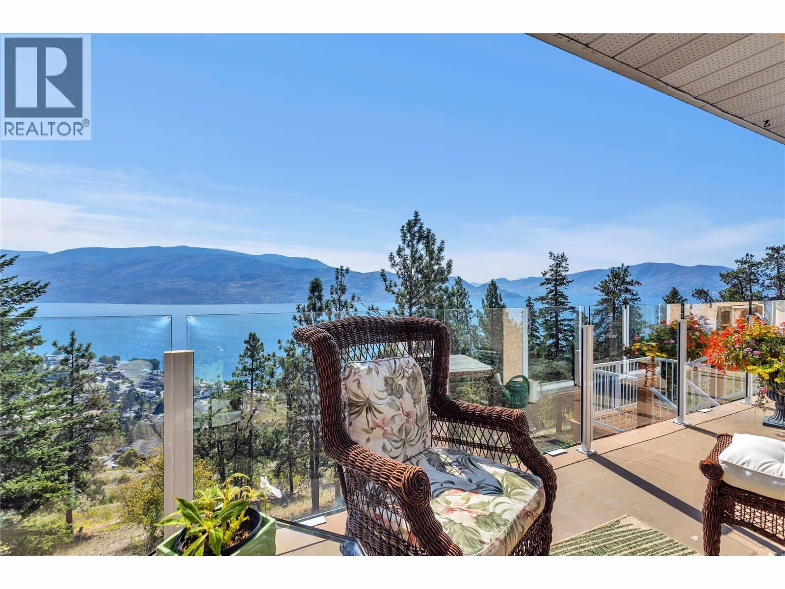 TOP-FLOOR TOWNHOME WITH INCREDIBLE LAKE VIEWS! Welcome to this bright and beautifully updated 2-bedroom, 2-bathroom townhome in Chateaux on the Green, where lake views steal the show from the kitchen, living room, and covered deck. The open layout features vaulted ceilings, cozy in-floor radiant heat, a gas fireplace, and a stylish kitchen with quartzite countertops and newer appliances. The spacious primary bedroom includes its own ensuite, while the second bedroom is perfect for guests, a home office, or a quiet reading space. Step outside to a covered deck with upgraded glass railings—an ideal spot for your morning coffee or relaxing with a glass of wine in the evening. This home also includes air conditioning, covered parking, a separate storage room great for golf gear, (with a new 9-hole course coming soon just across the street.), in-unit laundry, and plenty of visitor and RV parking. With no age restrictions, pet-friendly rules, and 30-day minimum rentals allowed, it’s a perfect blend of comfort, convenience, and laid-back Okanagan living. Call today to book your private showing! (id:58842)