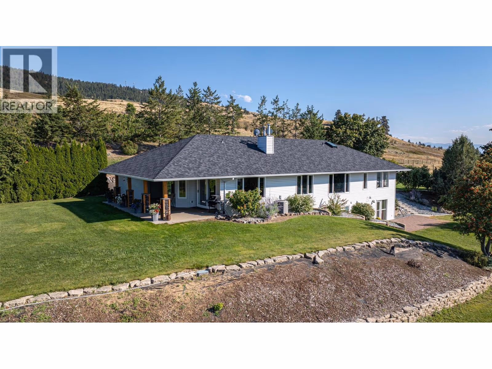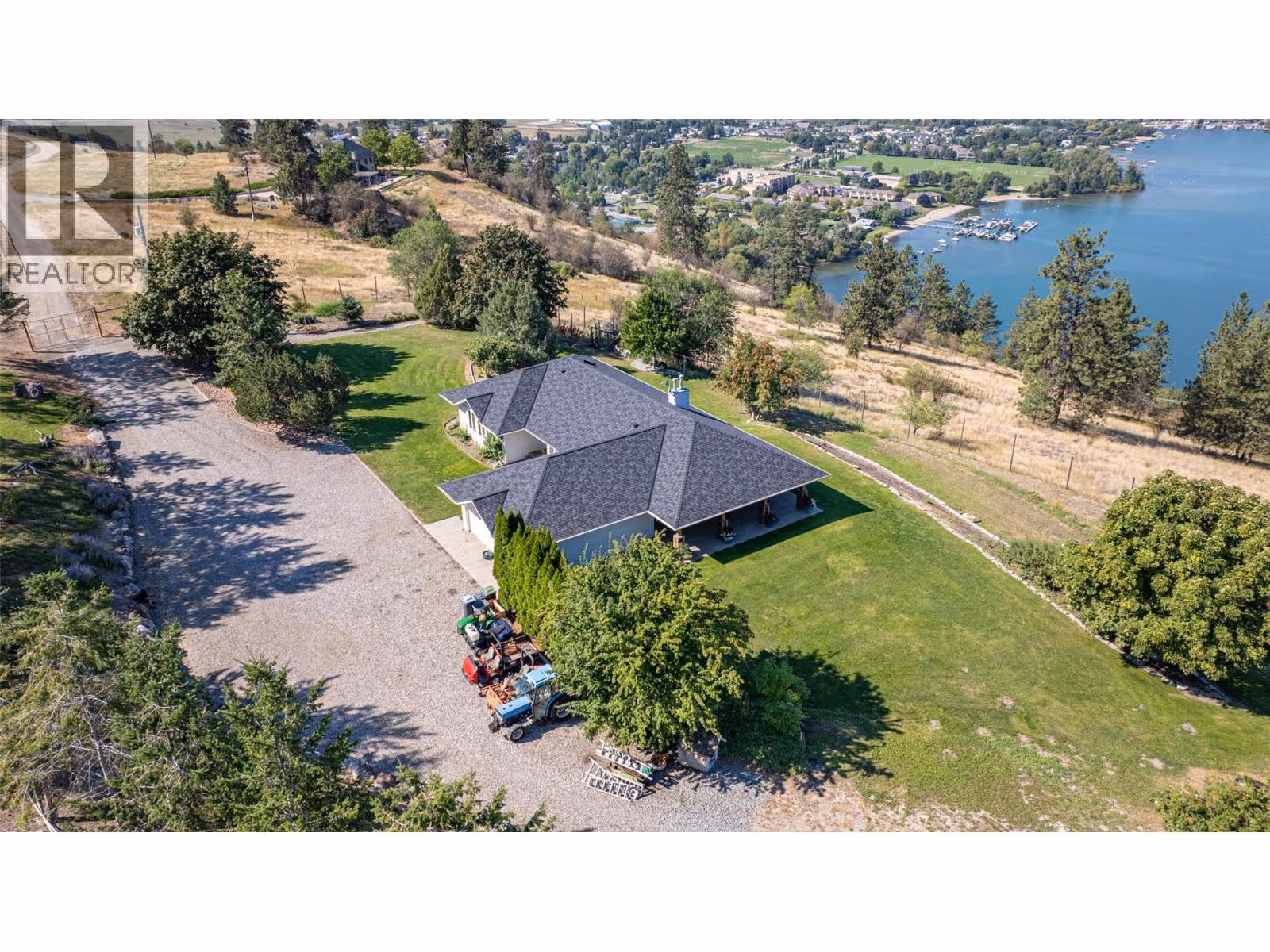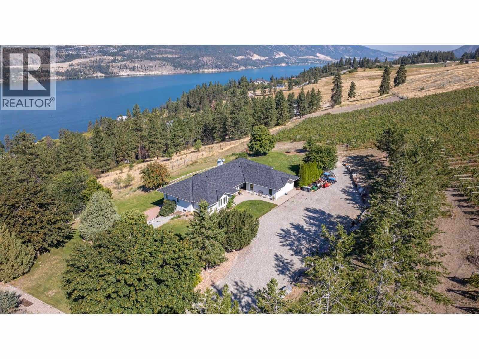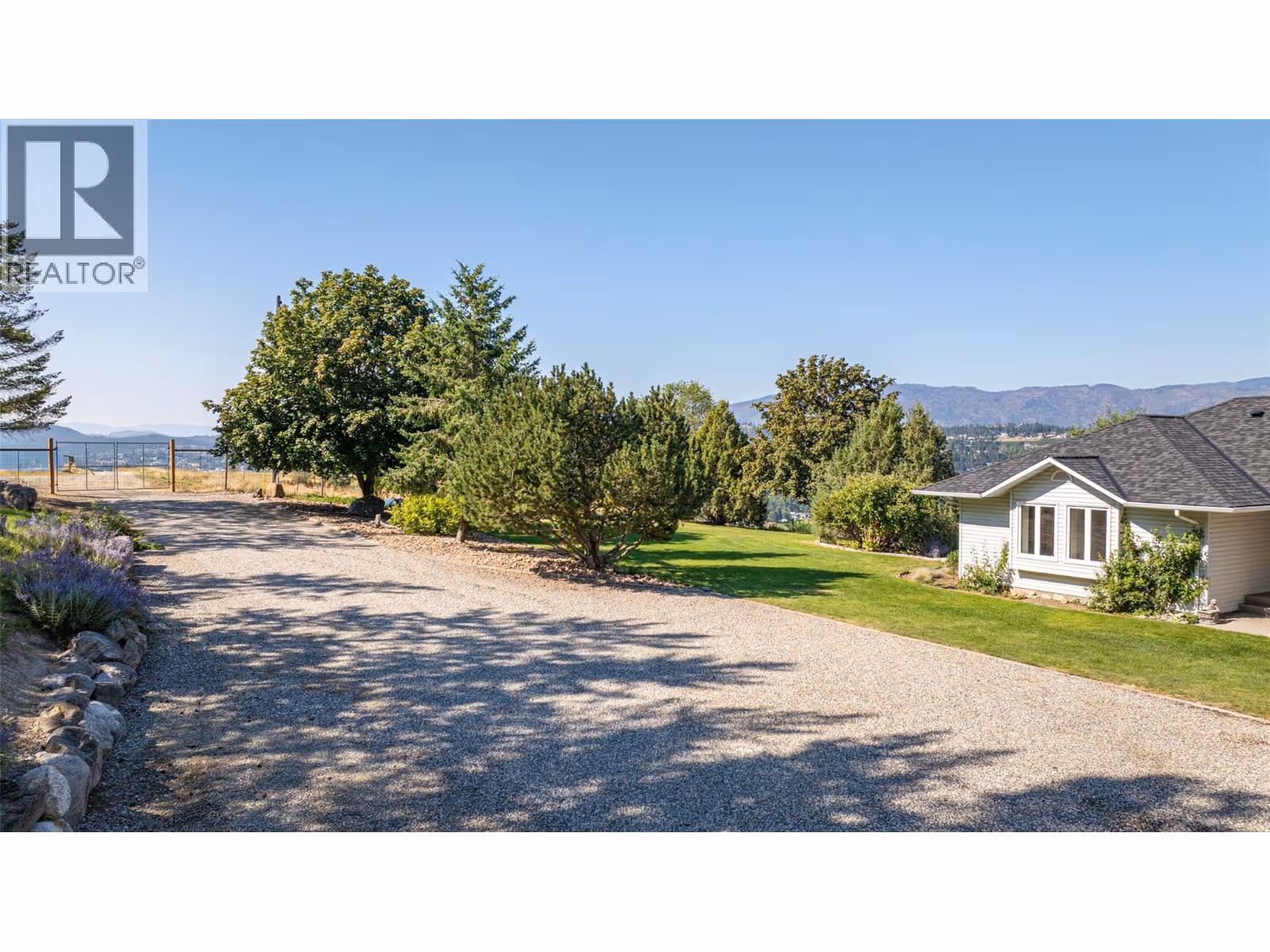 Come and enjoy the remarkable Valley views from this private 10 acre property overlooking Wood Lake. Large 4 bed/3 bath level entry rancher home with full walkout basement with self contained 1 bedroom suite. Backing onto a vineyard and located at the end of a no-through road this acreage allows you the privacy everyone desires with the convenience of being only 5 minutes to shopping, dining, rail trails and public beaches. The main level of the home has open kitchen / family room featuring a decorative gas fireplace and direct access to the covered patio to enjoy your morning coffee. Down the short hall is the dining room, sunken living room with vaulted ceilings along with ample windows to enjoy those views. At the south end of the home is the primary bedroom with a 3 pce. ensuite bath. 2 other bedrooms are located across the hall. Downstairs is the bright 1 bed/1 bath in-law suite with private rear entrance, vacant and ready for family or guests. Also on this lower level is a large family room, laundry, mechanical room with 200 amp service, gas furnace with central A/C. There is a detached, insulated double garage with covered breezeway 23'x23'. Easy maintenance mature landscaping and lawns surround the home with the convenience of underground sprinklers. Water is supplied by Alto Utilities with additional supply from a drilled well located at the bottom of the property off Oyama Rd. Access to the property at the end of Darlene Rd. (id:58842)