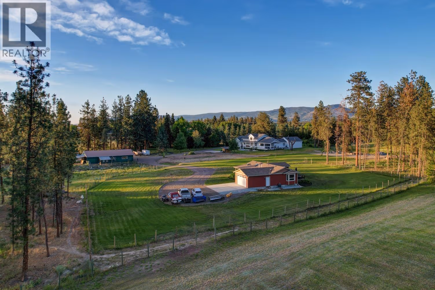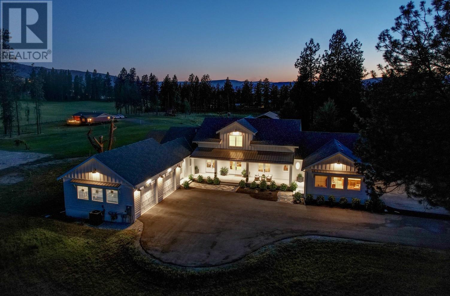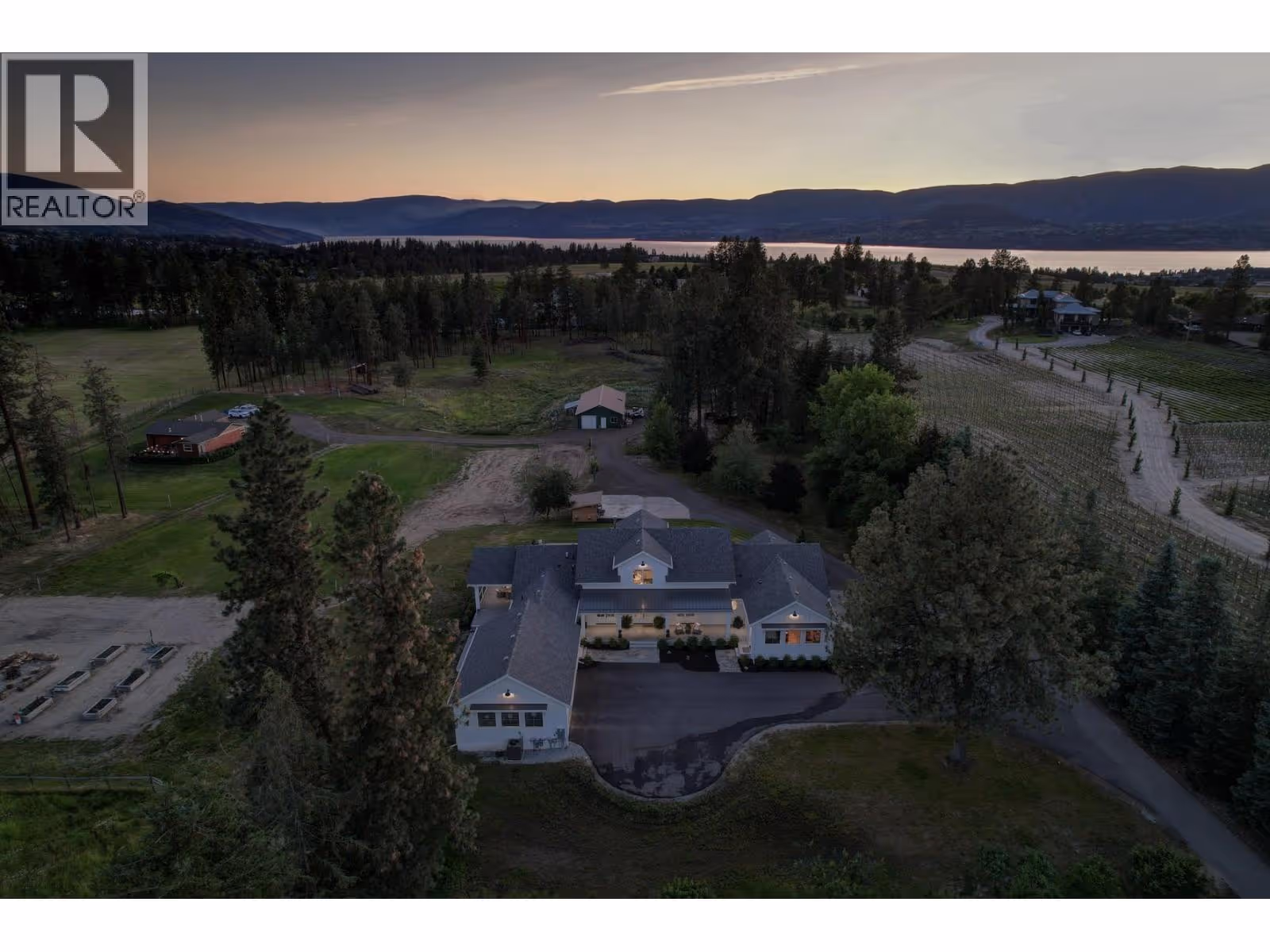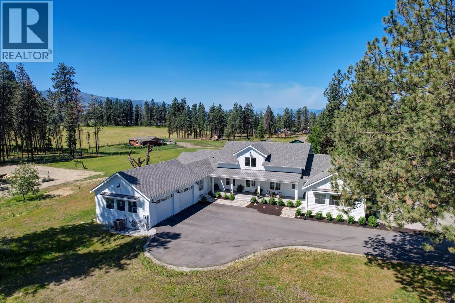 Picturesque & peaceful 12 acres in South East Kelowna. You will LOVE this near new MODERN farmhouse that blends timeless country elements with modern design and offers convenient one-level living. Finished with the utmost attention to detail & quality throughout including oak plank hardwood flooring, quartzite counters, brass hardware, custom tile work. The main living spaces are open & bright flowing seamlessly from the kitchen, dining & great room lending itself to creating family-oriented spaces for gathering and hosting. Great room features a custom cast, wood-burning fireplace with vaulted ceilings. A highlight of this home is the gourmet kitchen with professional appliances, an over-sized island and expansive windows bordering the kitchen capturing the stunning acreage views. Primary suite is a tranquil retreat with a show stopping en suite featuring a soaking tub, large white tiles extending up the walls, an open shower, gorgeous wood vanity. Multiple points of access open to the patios and wrap around porch. Separate access to the One bedroom suite. Basement is perfect for a home theater. Enjoy the backyard oasis with a pool and lounging area. Property offers a SECOND detached 2 bedroom home, + huge detached workshop, fenced for livestock & small orchard with variety of fruit trees. Incredible location with a close proximity to trails for hiking, biking, and horseback riding. Ideal setting for those in search of the tranquility of acreage living. (id:58842)