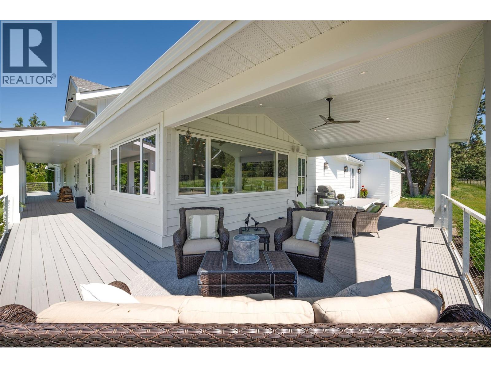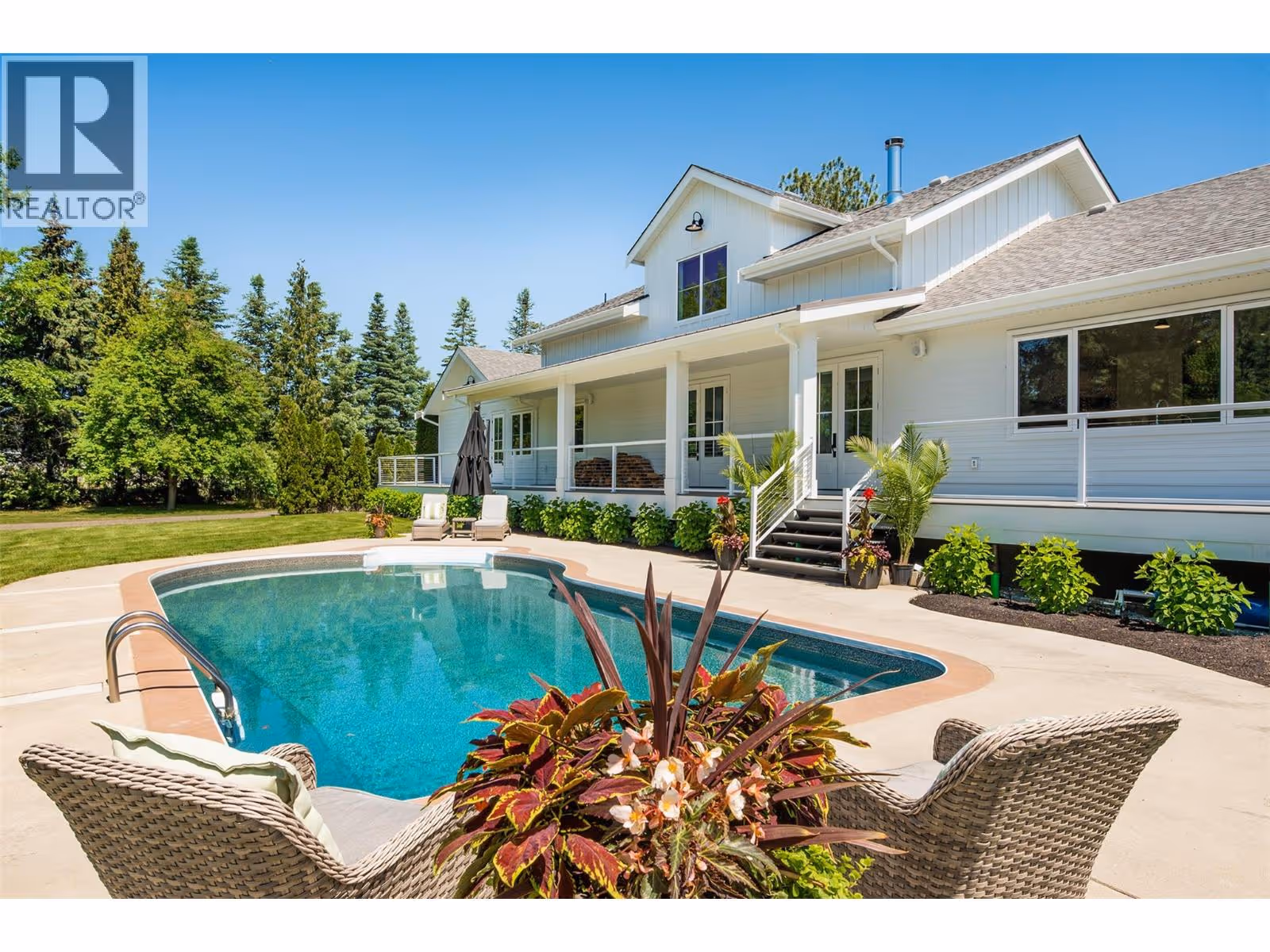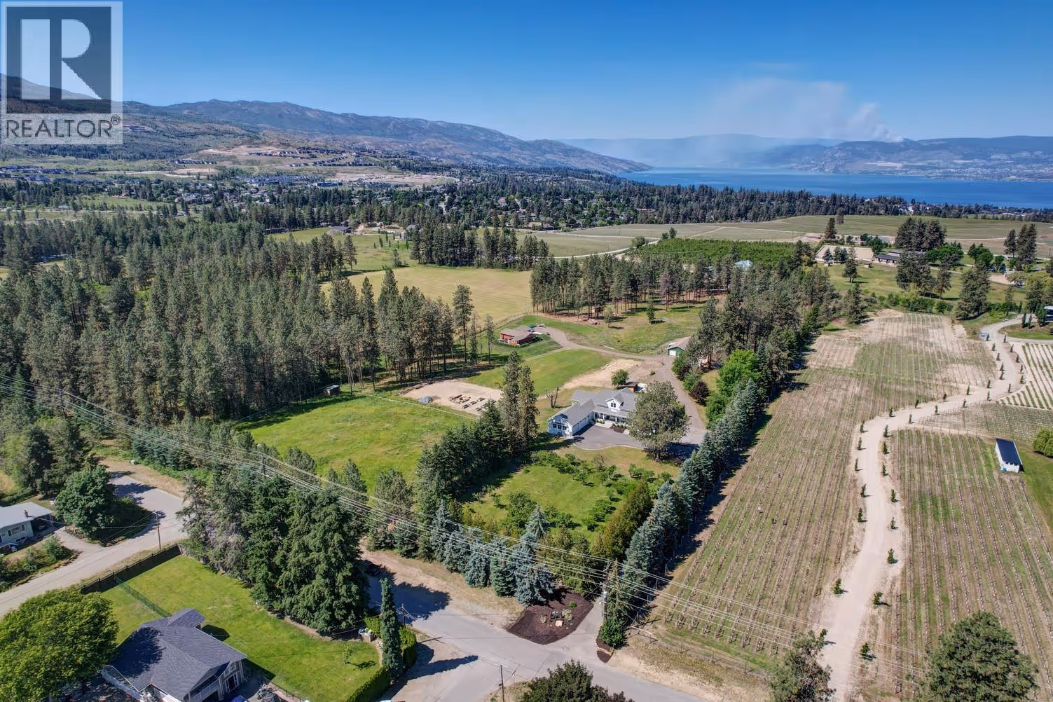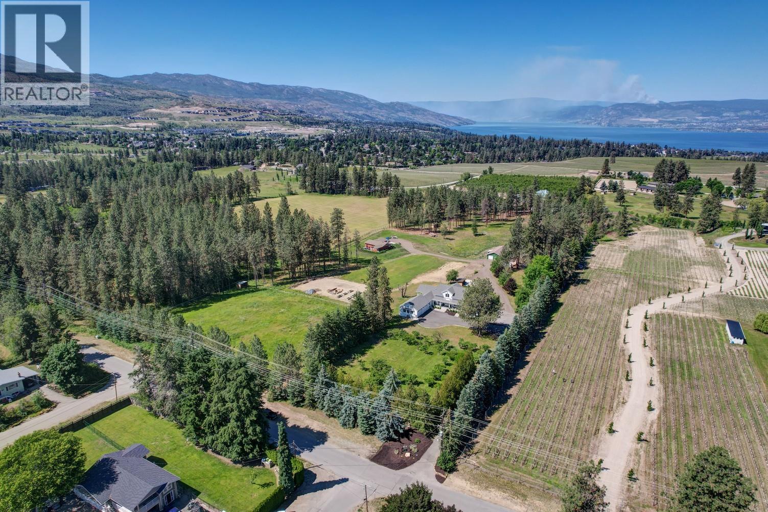 Picturesque & peaceful 12 acres in South East Kelowna. You will LOVE this near new MODERN farmhouse that blends timeless country elements with modern design and offers convenient one-level living. Finished with the utmost attention to detail & quality throughout including oak plank hardwood flooring, quartzite counters, brass hardware, custom tile work. The main living spaces are open & bright flowing seamlessly from the kitchen, dining & great room lending itself to creating family-oriented spaces for gathering and hosting. Great room features a custom cast, wood-burning fireplace with vaulted ceilings. A highlight of this home is the gourmet kitchen with professional appliances, an over-sized island and expansive windows bordering the kitchen capturing the stunning acreage views. Primary suite is a tranquil retreat with a show stopping en suite featuring a soaking tub, large white tiles extending up the walls, an open shower, gorgeous wood vanity. Multiple points of access open to the patios and wrap around porch. Separate access to the One bedroom suite. Basement is perfect for a home theater. Enjoy the backyard oasis with a pool and lounging area. Property offers a SECOND detached 2 bedroom home, + huge detached workshop, fenced for livestock & small orchard with variety of fruit trees. Incredible location with a close proximity to trails for hiking, biking, and horseback riding. Ideal setting for those in search of the tranquility of acreage living. (id:58842)