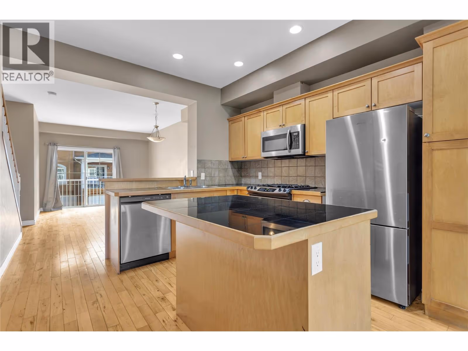 Parkside Villas - a well maintained gated community adjacent to Ben Lee Park and close to amenities. Bright and spacious 3-bedroom, 3-bathroom townhouse. Open concept main floor with island kitchen with gas range and stainless steel appliances. Dining/great room with corner gas fireplace and access to the landscaped backyard and patio with gas hook-up. Oversized living room with sliding glass doors to front deck. Upstairs, the spacious primary bedroom includes a walk-in closet and a 3-piece ensuite plus two additional generous-sized bedrooms and a second full bathroom plus laundry. Tandem garage accommodating two vehicles or the extra space can be modified to use as a home gym or recreation area. Amazing location; a short drive to schools, UBCO, YLW Airport, Walmart, Costco, and other shopping and amenities. The complex is pet-friendly, allowing up to two dogs or cats of any size, and rentals are permitted. The roof was recently replaced in 2024, and the strata fee includes water and snow removal. (id:58842)