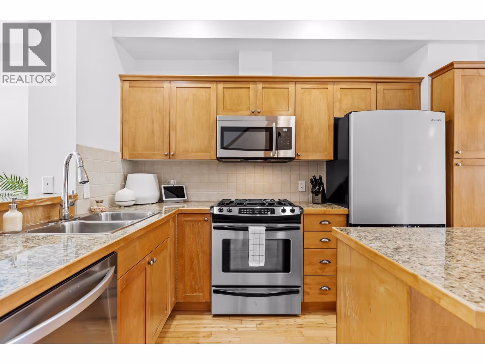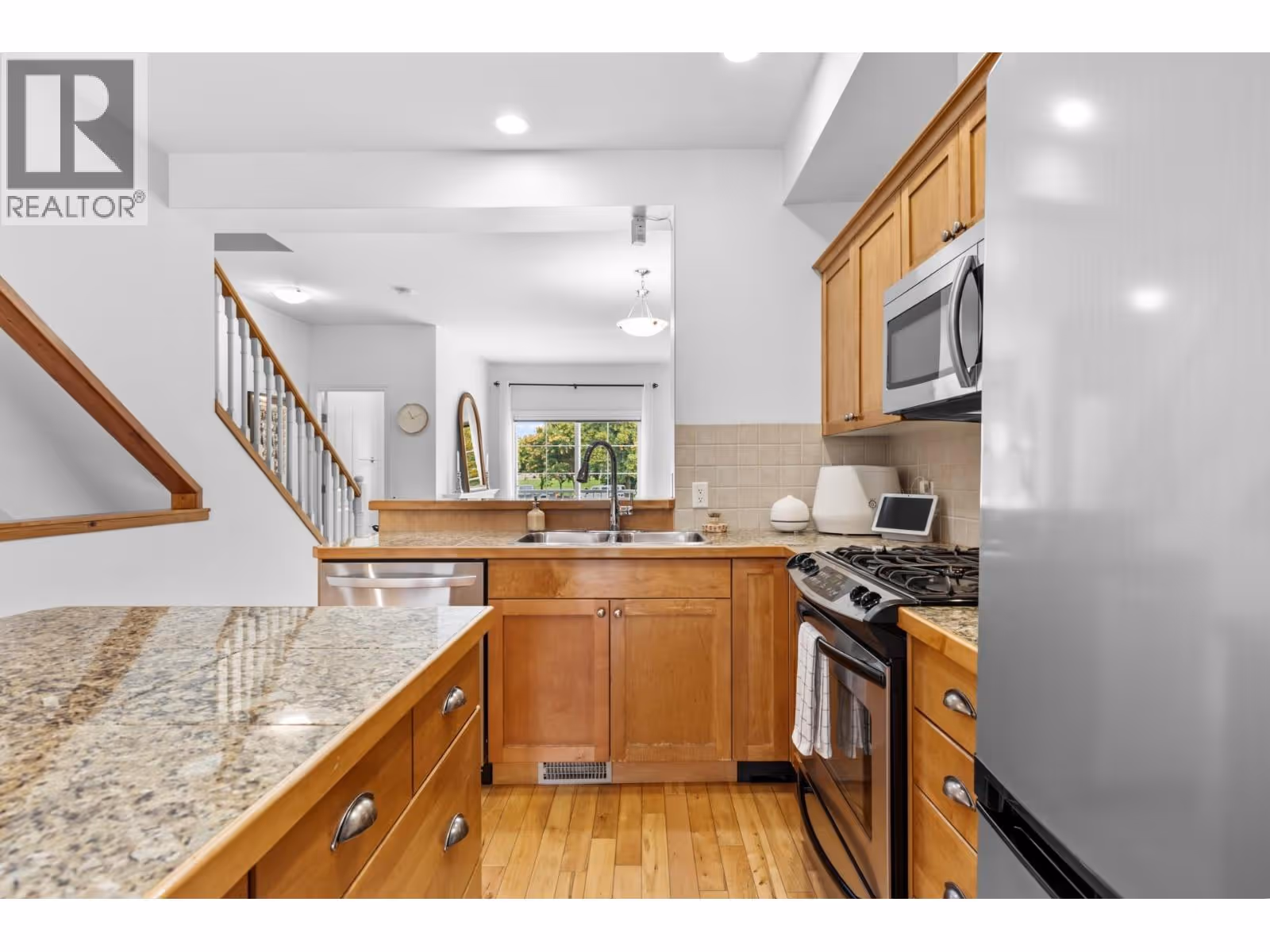 Welcome to Parkside Villas! This 3 Bed, 3 Bath townhome offers the perfect blend of comfort, style, and convenience. Step inside to find beautiful finishes throughout, including granite countertops, a gas range, and a cozy gas fireplace. The dining area overlooks the backyard greenspace, while the bright living room is filled with natural light and features a Romeo & Juliet balcony that offers beautiful views of Ben Lee Park. Upstairs, all 3 bedrooms and laundry are conveniently located on the same floor, making family living a breeze. This home also boasts a tandem garage plus 1 additional parking spot in the driveway. The backyard greenspace has been extended, providing even more room to relax and enjoy. Bonus: 2 dogs are allowed with no size restrictions! The location is ideal—Parkside Villas sits next to one of Kelowna’s best community hubs, Ben Lee Park, offering a water park, walking trails, skateboard park, basketball courts, and is dog-friendly. A truly wonderful place to call home! (id:58842)