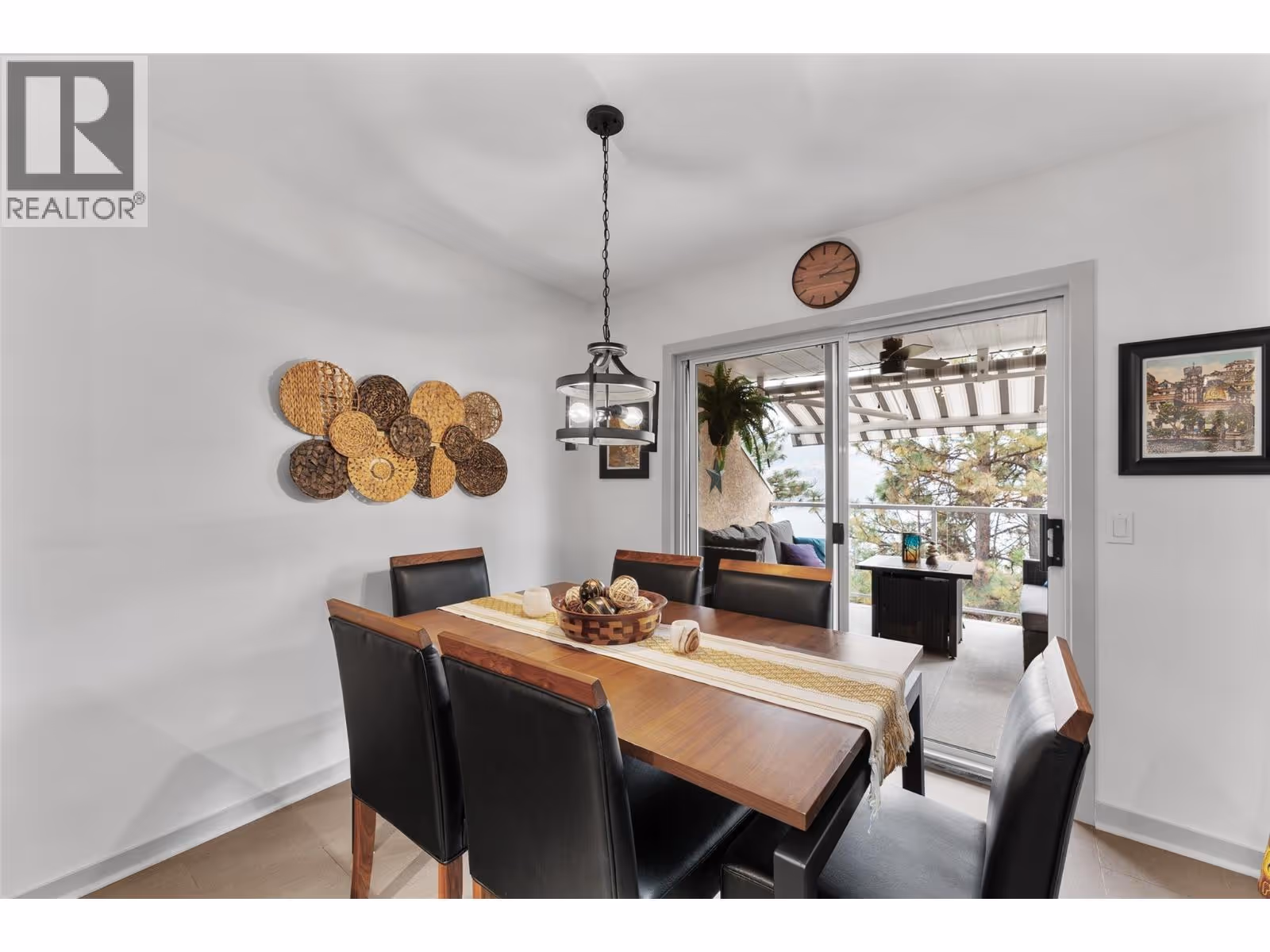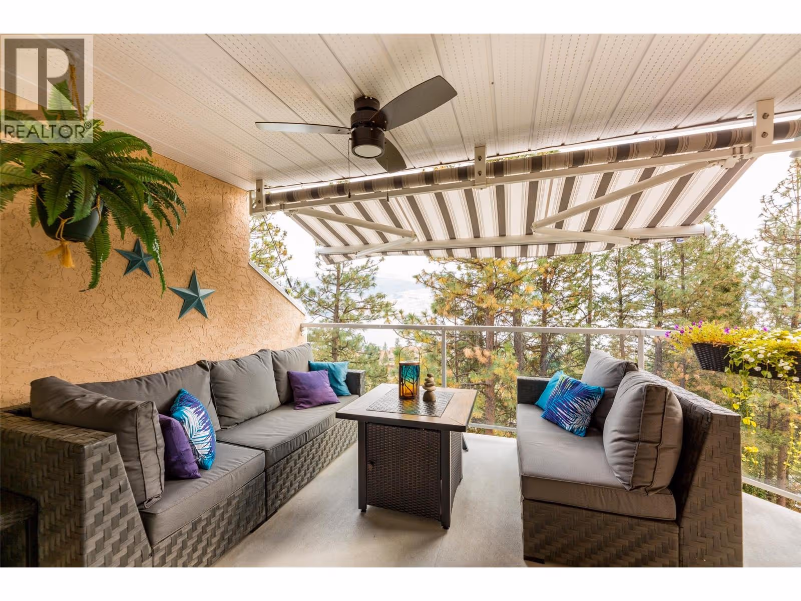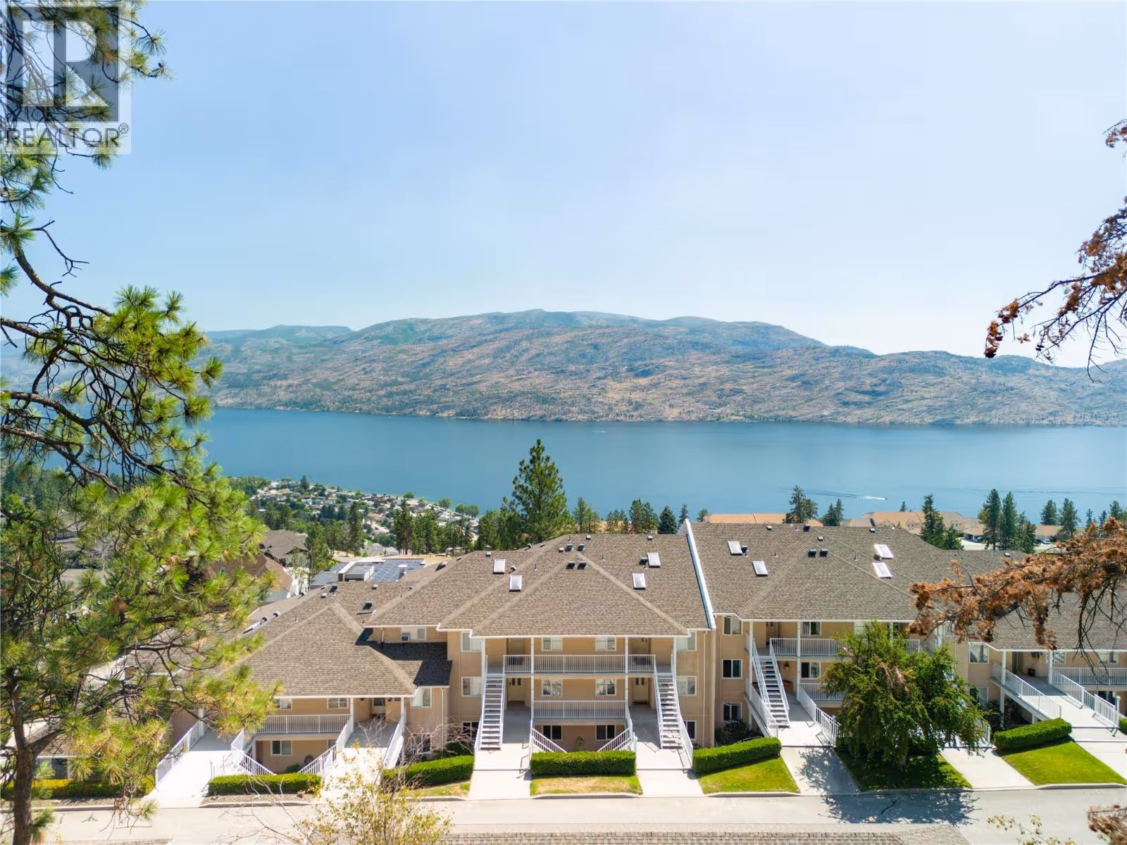 Enjoy panoramic lake and mountain views from this 2 bed/2 bath townhouse perched above Peachland, surrounded by nature and hiking trails for the ultimate Okanagan lifestyle. Perfect for downsizing to one-level living, a starter home, vacation getaway, or anyone seeking quiet serenity among the pines—yet only 5 minutes to shopping and the lakefront. The expansive sundeck with glass railings, BBQ space, and new drop-down awning (2023) is ideal for morning coffee or evening wine. Inside, the open kitchen boasts stainless steel appliances, granite counters, and modern cabinetry, flowing into the dining and living areas with vaulted ceilings, skylights (2024), and breathtaking views. Stay comfortable year-round with a new heat pump (2023), ceiling fans, radiant in-floor heating, and a cozy gas fireplace. The primary suite offers a walk-in closet and 3-pc ensuite. Additional highlights include ample storage, covered parking with locker, and low strata fees that include heat, water, and gas. Pet-friendly community amenities feature RV parking, rec room with kitchen, games tables, and fitness area. A proposed golf course nearby adds future appeal. (id:58842)