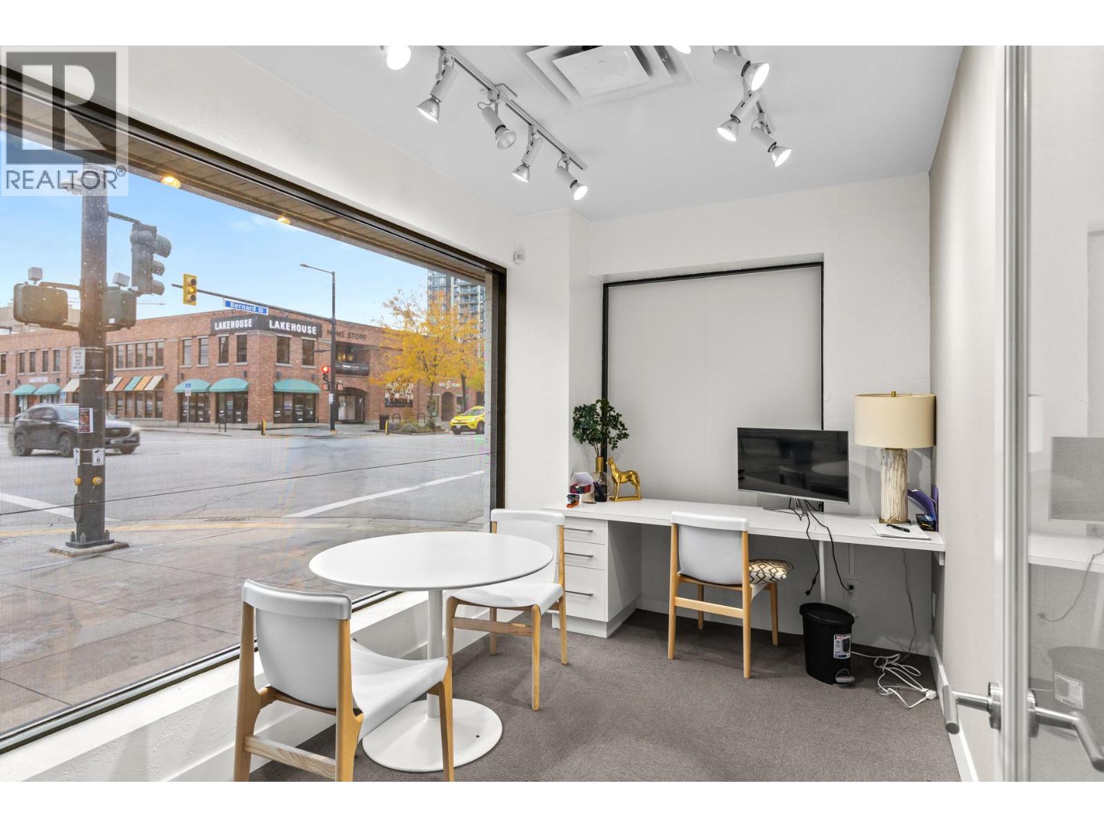 Fully improved retail premises in the heart of Downtown Kelowna. Currently operating as a presentation centre, this space offers prominent exposure along Bernard Avenue, excellent signage opportunities, and high-quality interior finishes throughout. Available by way of sublease through July 31, 2028, the premises offers an open-concept layout complemented by private offices and an in-suite washroom. With abundant natural light and a clean, contemporary design, the space is well suited for a variety of retail or professional uses. Located on the corner of Bernard Avenue and Ellis Street, the property sits among established downtown businesses and in close proximity to major new developments such as the upcoming UBCO Downtown Campus and numerous restaurants, cafe's, and professional services. This is a rare opportunity to occupy an outfitted space in downtown Kelowna’s most active retail and transportation corridor. Metered street parking available. (id:58842)