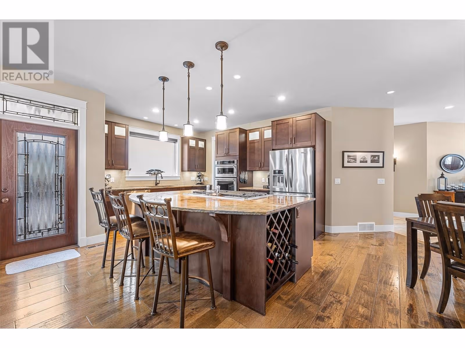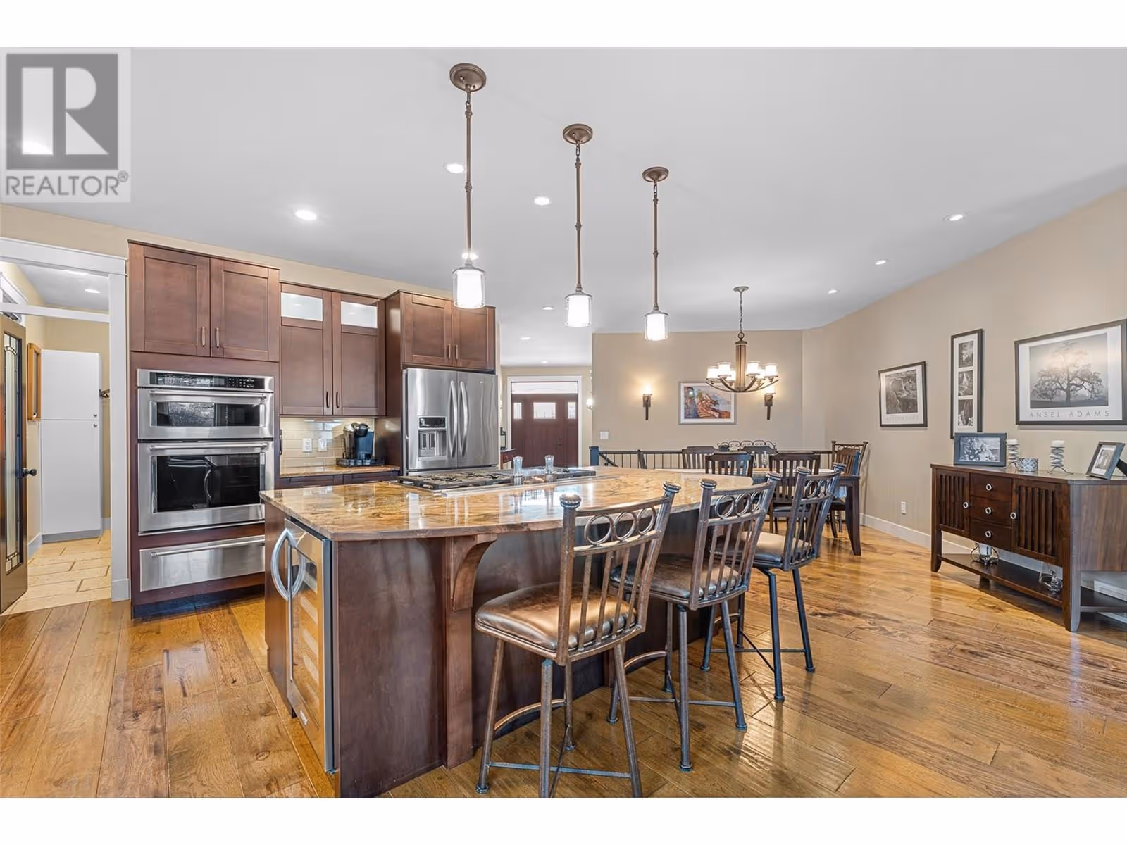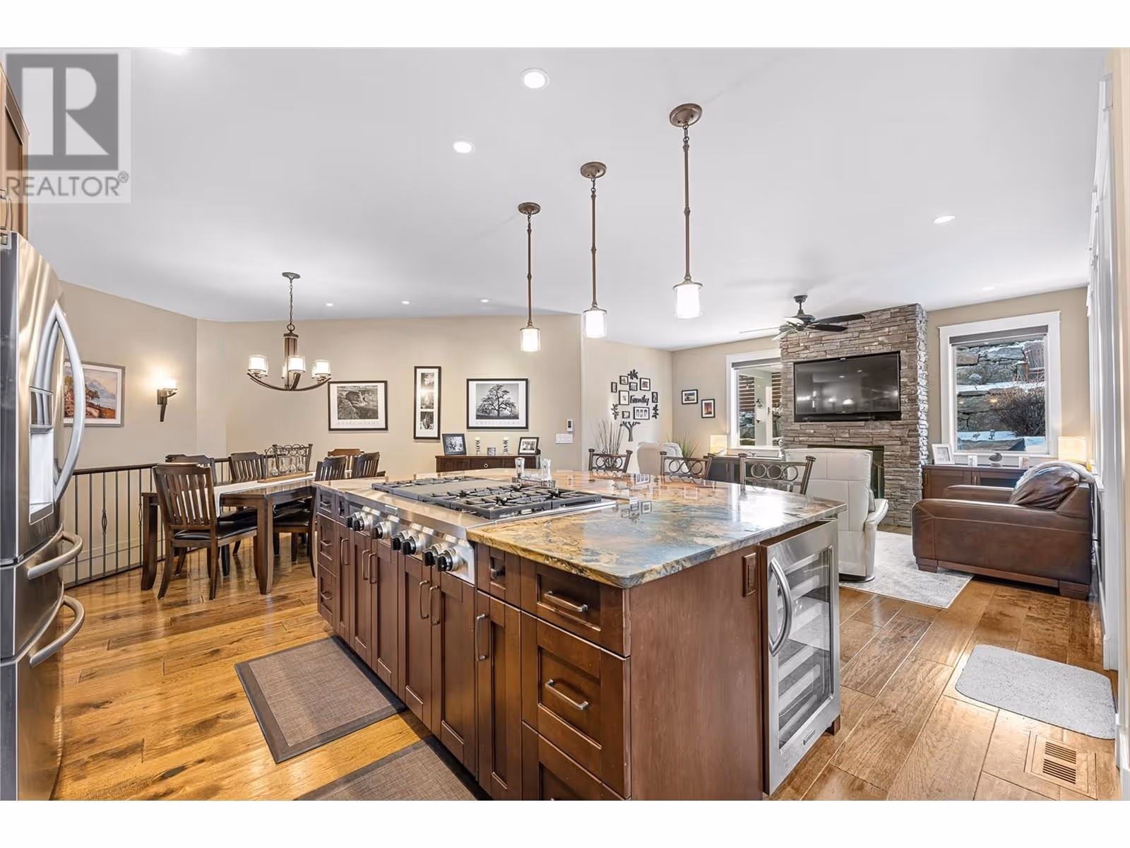 Nestled in the heart of Upper Mission’s coveted Ponds community, this custom-built 4-bed + den residence offers the perfect blend of elegance and comfort. Steps from Canyon Falls Middle School and Mission Village, this home is surrounded by scenic hiking/biking trails and just minutes from world-class wineries, beaches, top-tier schools, and vibrant local amenities.Designed for luxury living and seamless entertaining, the open-concept main floor is adorned with hardwood floors, 9-ft ceilings, and a stone-surround gas fireplace that anchors the inviting living space. The gourmet kitchen is a chef’s dream with stainless steel appliances, a KitchenAid 6-burner gas cooktop with griddle, built-in ovens, a warming drawer, beverage fridge, and a custom island with a built-in wine rack. A walk-in pantry with roll-out shelves adds effortless organization. The main-floor primary retreat boasts a spa-inspired ensuite with heated floors, a soaker tub, and a jetted rainfall shower. An additional main-floor bedroom offers flexibility as a home office or guest suite. Downstairs, the bright and spacious lower level is perfect for family living, featuring a large rec room, 3 beds, a full bath, and direct access to the 2 car garage with high ceilings. Outdoors, enjoy a private patio, rock retaining walls, and stunning lake views. The perfect backdrop for morning coffee or evening gatherings. This home offers both luxury and practicality in one of Kelowna’s most desirable neighborhoods. (id:58842)
