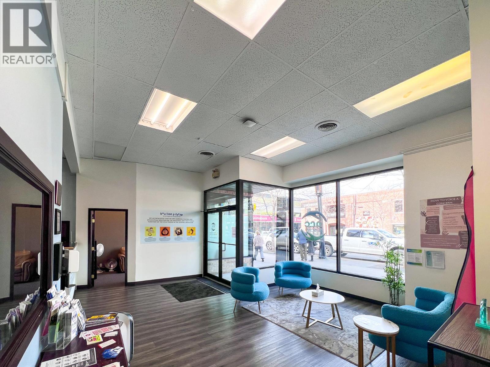 Establish your presence on iconic Bernard Avenue in the heart of downtown Kelowna. This rare opportunity offers approximately 6,000 SF of ground floor retail/office space with outstanding frontage and visibility along one of the city’s most dynamic commercial corridors. Currently configured for office use, the premises include approximately 19 private offices, two large boardrooms, a spacious open reception area, and accessible washrooms, providing a functional, turnkey layout for professional users. A second-floor component adds further versatility with three additional offices and access to a rooftop balcony — a unique feature that enhances both client engagement and team environment. The building façade has been recently upgraded with an attractive culture brick design, delivering strong curb appeal and a refreshed street presence. While ideally suited for office, the layout also offers the potential to be reconfigured for alternative uses, including retail, subject to approvals. Combined with low net rents and low additional rents, this represents a strategic downtown opportunity where scale, flexibility, and value converge. (id:58842)