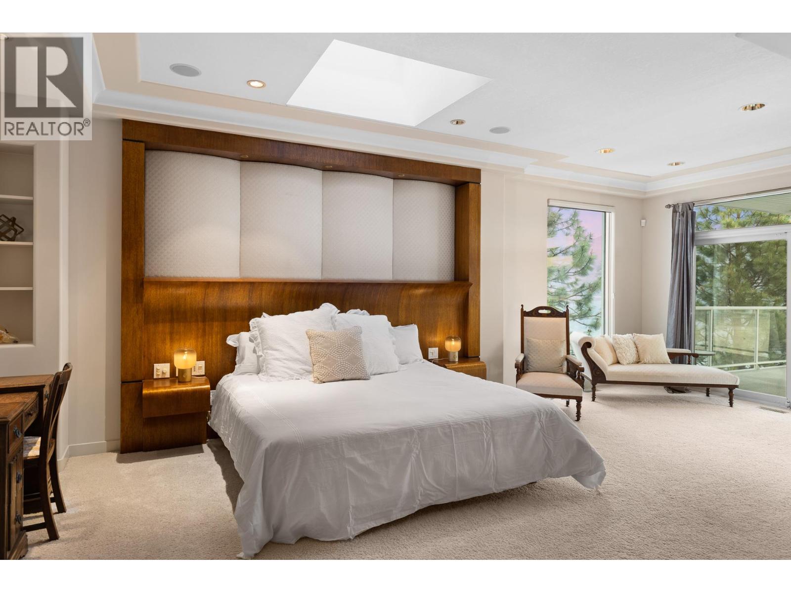 Extraordinary lakeshore generational estate offering over 500 feet of level beachfront on 2.17 acres of private, park-like grounds. Architecturally designed 8,300 square feet main residence with eight bedrooms and seven bathrooms, offering panoramic lake views from nearly every room. Featuring a Tuscan-inspired private theatre, games lounge, fitness room, and light maple kitchen with island, dual Sub-Zero refrigerators, and floor-to-ceiling windows capturing spectacular lake views. Four levels with generous decks, panoramic vistas from nearly every room, and a luxurious 800 square foot top-floor primary suite. Glass-enclosed entertaining wing with full butler’s kitchen, plus a private in-law/guest suite. At the water’s edge, a detached 1,638 square foot five bedroom, two bathroom beach house offers ideal guest accommodation with extensive storage for water toys. A charming rustic log lakefront cabin retreat tucked among the trees completes this exceptional property. Mature landscaping, expansive lawns, walking trails, multiple ponds, and a dramatic feature rock waterfall create a true resort setting. Pile-driven dock with lift, beach volleyball, and unobstructed 180-degree lake, valley, and mountain views. Ideally located just minutes to the Okanagan Connector and West Kelowna. A rare signature offering and the ultimate expression of Okanagan lakeshore living. Strong future potential for re-zoning into a mutlifamily waterfront development with full marina. (id:58842)