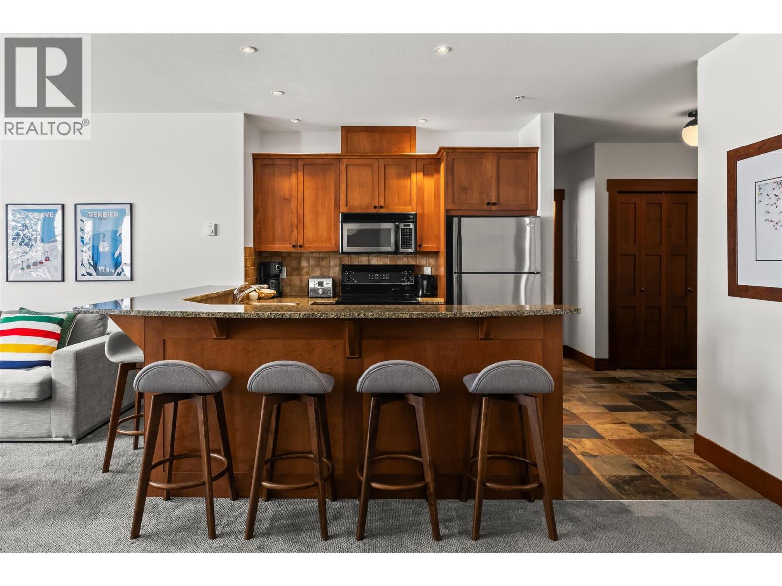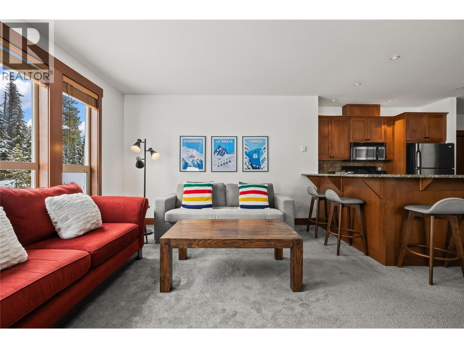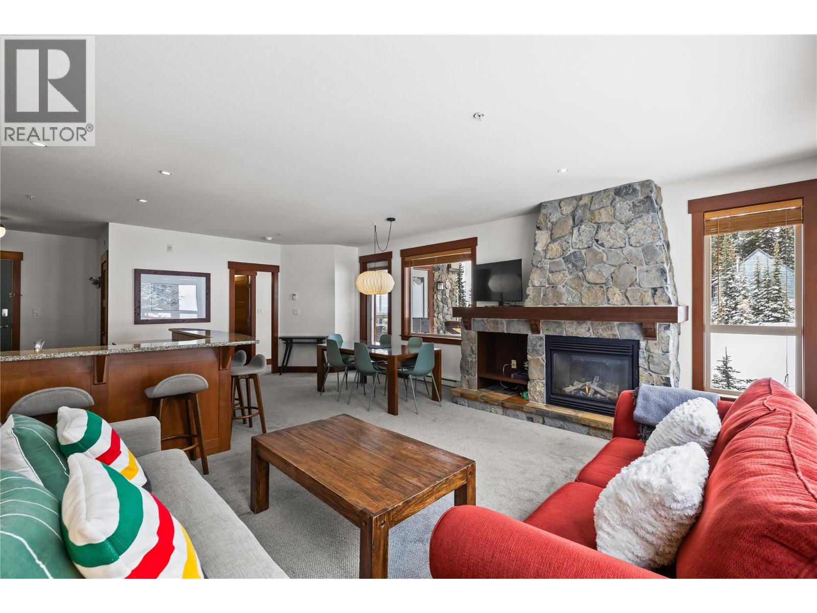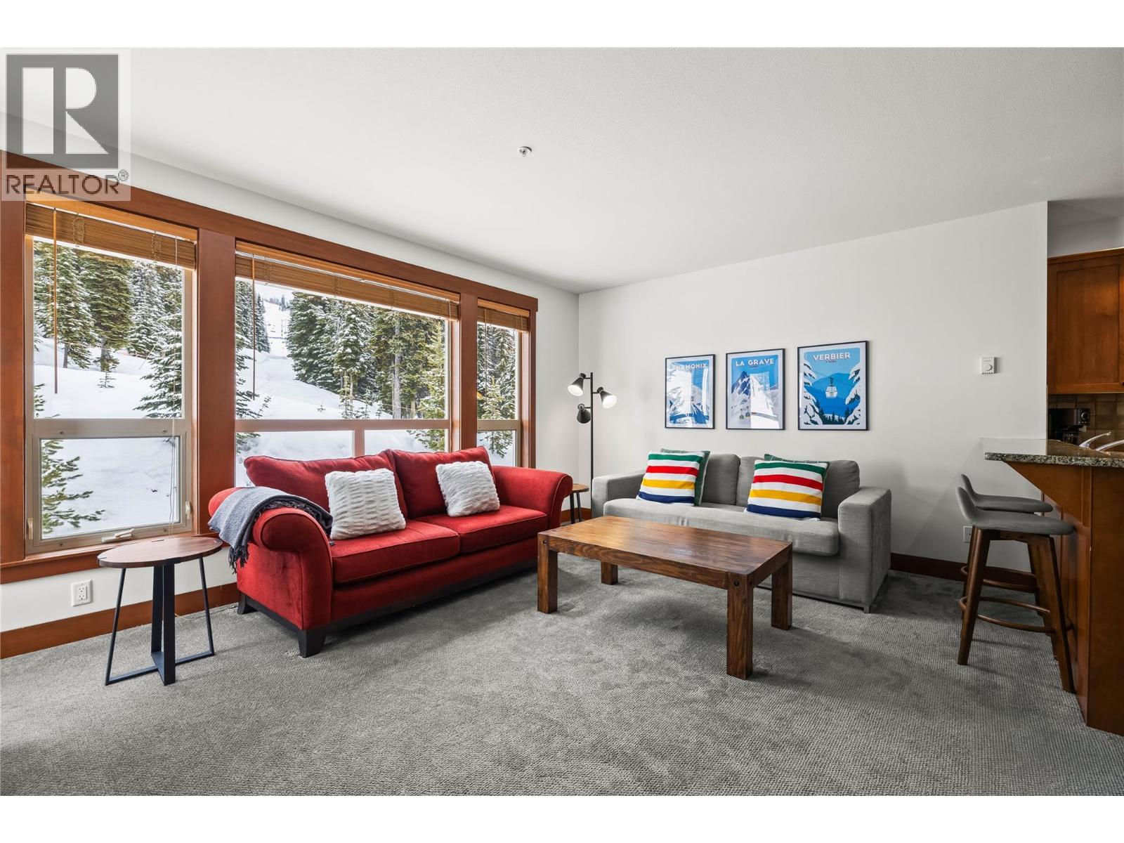 Luxury and lifestyle come together at Stonebridge, one of Big White’s most sought-after residences. This exceptional third floor, two bedroom, two bathroom corner unit captures iconic views of the main ski run into the village, the famous clock tower, and stunning sunset skies—best enjoyed from your private hot tub. Thoughtfully designed for both relaxation and entertaining, the bright open-concept layout features granite countertops, slate tile, new carpeting, and a warm stone fireplace, with mountain views framed from every room. Offering three queen beds plus a fold-out sofa, the property comfortably sleeps up to seven guests, making it perfectly suited for family escapes or strong vacation rental potential. True ski-in, ski-out access places the slopes at your doorstep, complemented by one of the most conveniently located storage lockers on the mountain. Residents enjoy Stonebridge’s renowned resort-style amenities including an outdoor pool, fitness centre, underground parking, and restaurants all within the complex, along with the confidence of one of Big White’s most respected and well-managed strata communities. Whether you’re searching for a luxury mountain getaway or an investment in Big White’s vibrant village core, this property delivers exceptional comfort, convenience, and views. GST applicable. Turn-key and fully equipped—ready to enjoy or rent immediately. (id:58842)