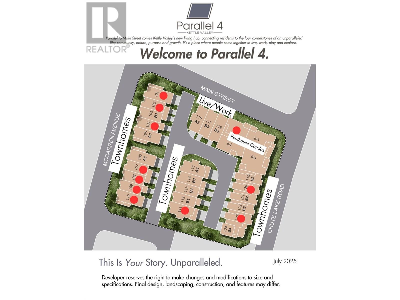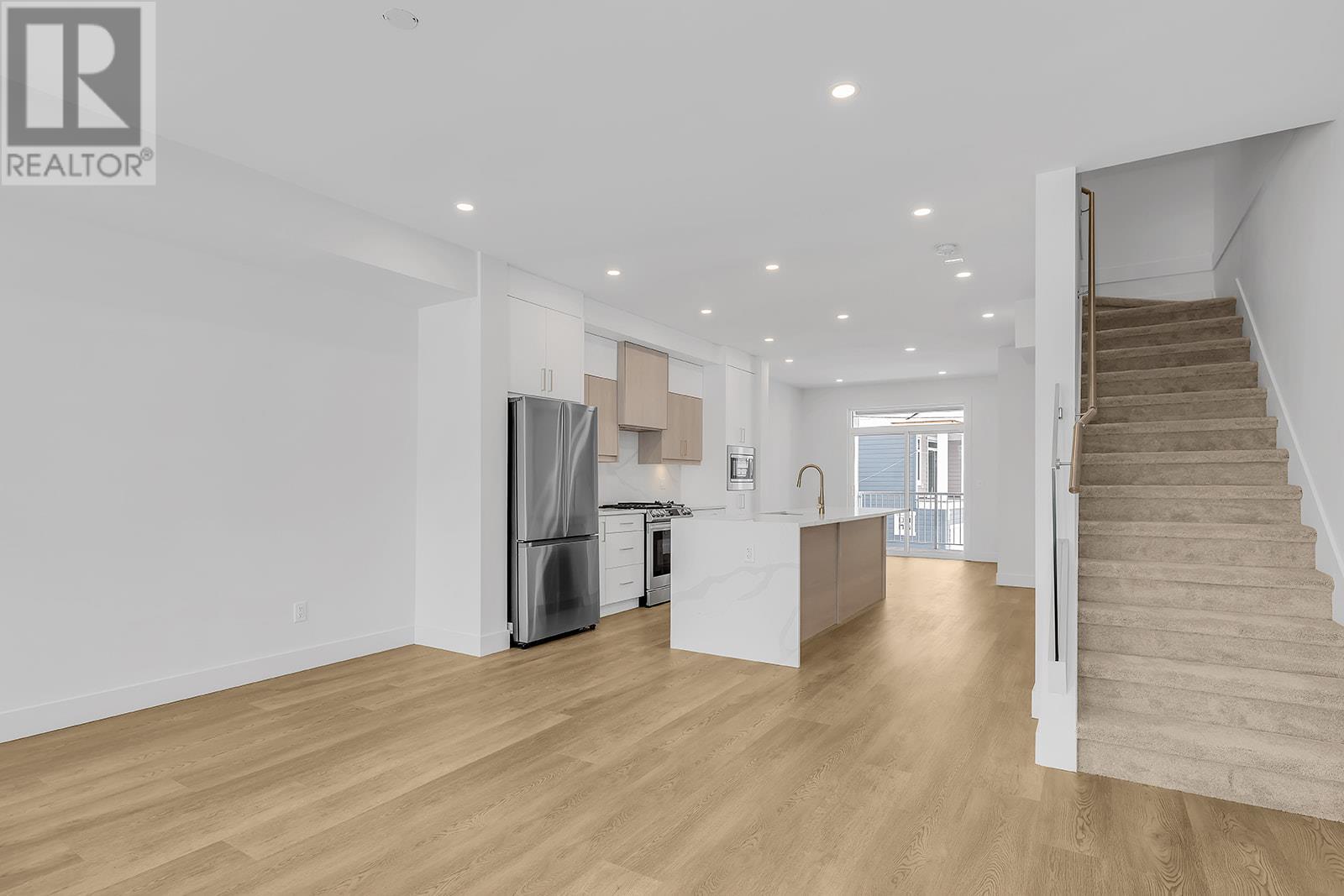 Parallel 4, Kettle Valley’s NEWEST COMMUNITY, is NOW SELLING move-in ready and move-in soon condos, townhomes and live/work homes. Enjoy all the benefits of a brand-new home – stylish and modern interiors, new home warranty, No PTT (some conditions apply), and the excitement of being the first to live here. This 4-bedroom, 4-bathroom townhome offers views of Okanagan Lake and neighbouring parks, and was designed to be the ideal townhome for your family. The spacious and stylish kitchen is the centre of the main living area, and features an oversized waterfall island (perfect for snack time, homework time and prepping dinner), quartz countertops and backsplash, and designer brass fixtures. Access the front patio from the dining room, and enjoy movie-night in the comfortable living room. The primary suite, with an ensuite and walk-in closet, is on the upper floor alongside two additional bedrooms. A fourth bedroom and bathroom are on the lower level. Other thoughtful details include custom shelving in closets, roller blind window coverings, an oversized single-car garage roughed in for EV charging, and a fenced yard. Located across Kettle Valley Village Centre, enjoy a walkable lifestyle close to the school, shops, pub and parks. (note - photos and virtual staging from a similar home in the community). Showhome Open This Week Friday-Sunday rom 12-3pm or by appointment. (id:58842)