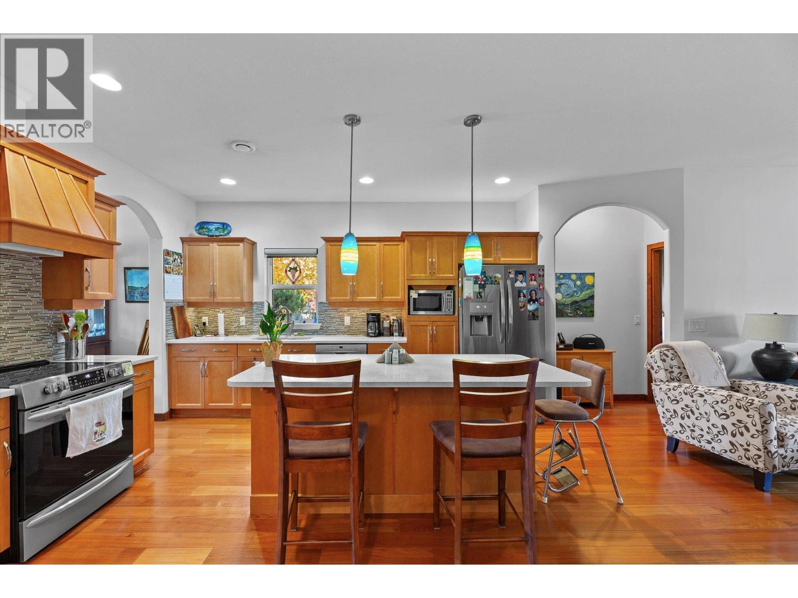 Experience the quintessential Kettle Valley lifestyle in this charming single-family 3 bed 2 bath home. Boasting perfect curb appeal with elegant stone detailing on the front terrace, this residence offers compact yet open-concept living. Check out the wine shrine to store and display your favorite Okanagan vintages! Featuring three comfortable bedrooms, 9 foot plus ceilings, island kitchen, quartz counters, hardwood floors, stainless steel appliances, real wood doors and trim and a wonderful covered terrace (18' x 9'), it provides ample outdoor enjoyment with additional lawn and garden space. The low-maintenance front yard complements a rear garden with complete privacy. This property presents an excellent alternative to strata living, offering control over your environment. A double detached garage (21' x 20') provides generous space for vehicles or hobbies. This meticulously maintained home offers a very livable floor plan, ideal for a single person, couple, or small family. All measurements from i-guide. Please verify if important. (id:58842)