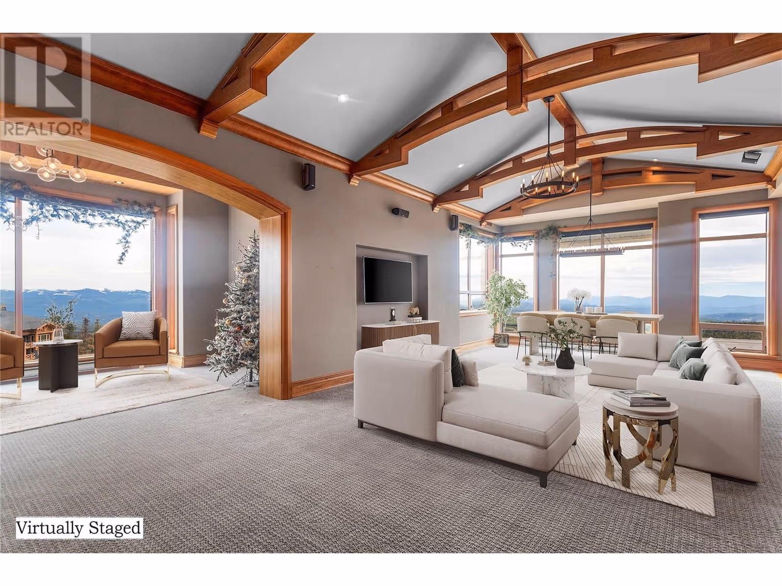 Experience unparalleled luxury at Big White Ski Resort in this exceptional top-floor corner unit at Chateau Big White. Purpose-built for the original owner when the building was constructed, this sought-after location is considered the best in the resort. Boasting over 3,500 sq ft, this is the largest condo at the resort and is on the market for the first time. The dream kitchen is equipped with a Wolf Griddle, a 48” Ultraline/Viking Gas Range with Double Oven, and a Sub-Zero Refrigerator. This stunning condo offers panoramic views of the Monashee Mountains, Main Village, and the spectacular fireworks displays from its expansive windows. Notably, this is the only unit in the building that permits pets. Featuring 4 spacious bedrooms and 4 bathrooms, this unit comfortably accommodates family and friends. The oversized master bedroom comes with a massive ensuite and walk-in closet. Cozy up by one of the two wood fireplaces after a day on the slopes, and enjoy the convenience of in-unit laundry. This unit also includes 1,180 sq ft of strata lot in Parkade 1, currently configured as 3 parking stalls and 665 sq ft of storage. This space could be repurposed as a shop, games room, or additional garage. Enjoy the ultimate ski-in/ski-out location with direct access to the slopes and the amenities of the main village. Don't miss this unique opportunity to own the best condo at Big White, perfect for making memories with family and friends. (id:58842)