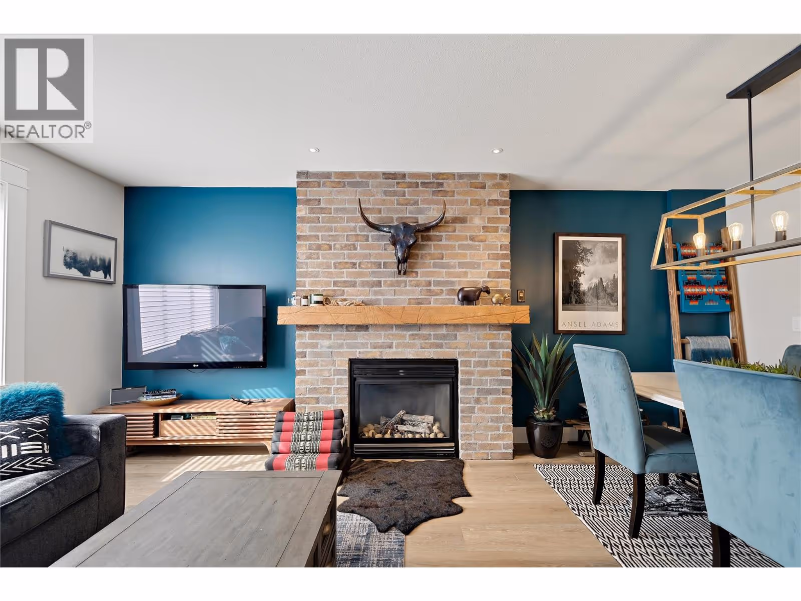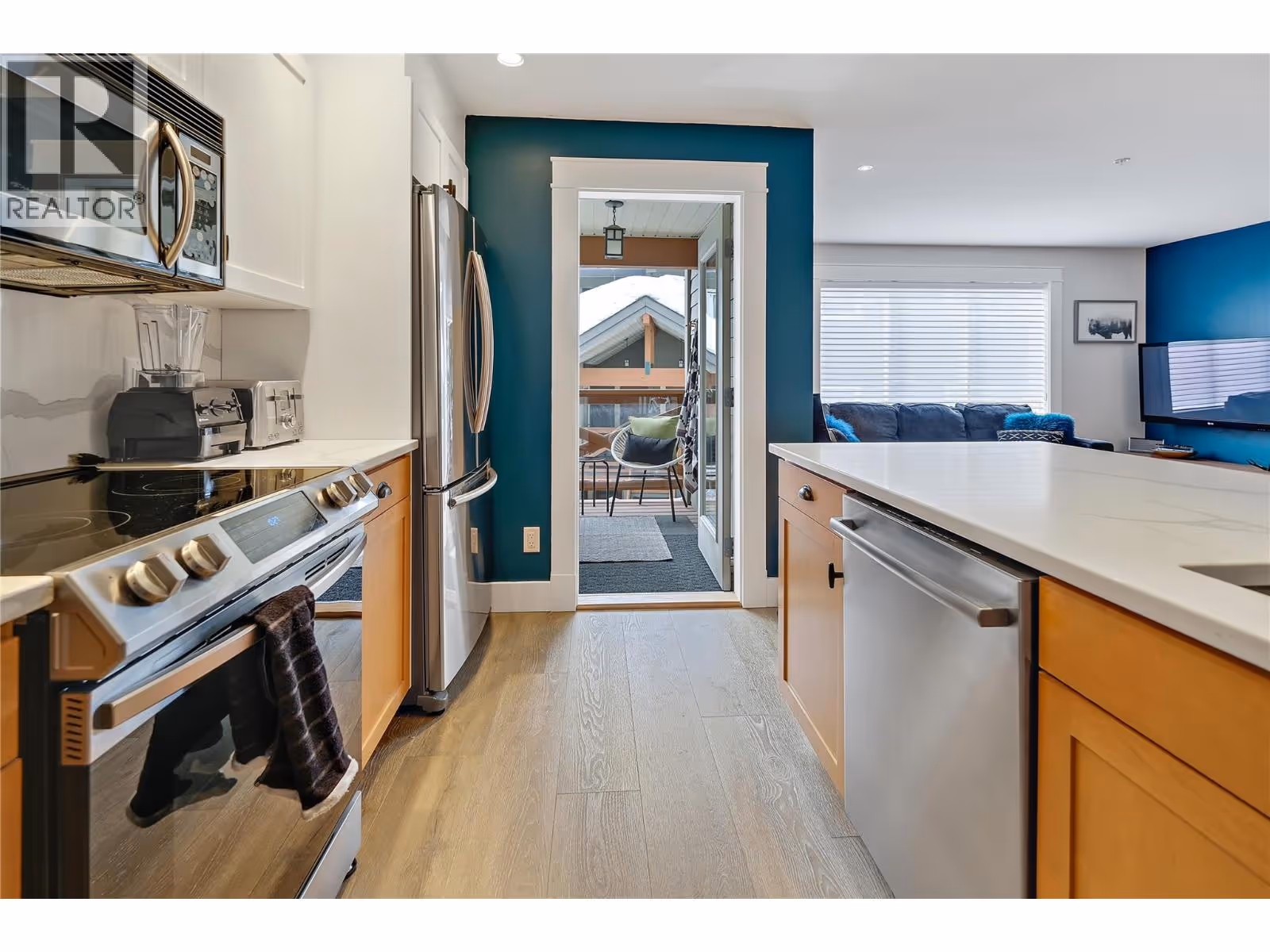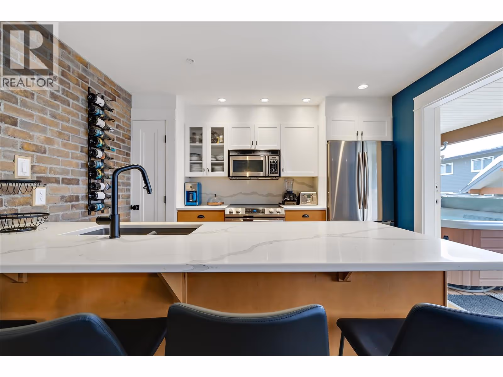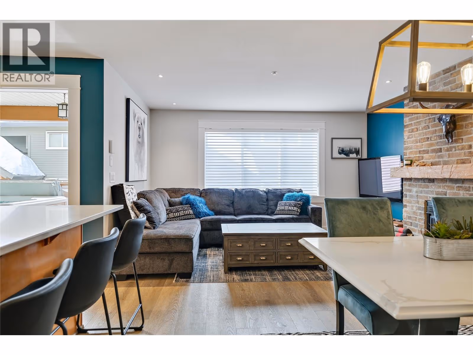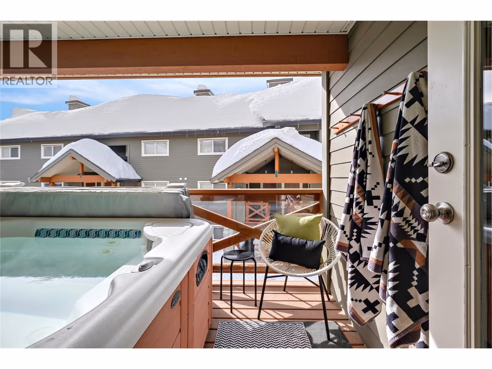 Step out your door, right in the heart of Big White Village and an easy ski out to the Perfection run & Fourth Ace restaurant! Located at Trapper's Crossing, this extensively renovated one level 765 sq.ft townhome offers all modern upgrades. The space is immediately above a private 2 car tandem garage with spacious ski gear lock-off storage ideal for family looking to store their gear while easily renting short-term. Owners bought this unit because of its ideal quiet location near the resort grocery store, restaurants, ski rentals and the true heart of the resort. A renovated 2 bedroom floorplan and 1 full bathroom that sleeps 6 comfortably. Partial Furnishings included with a new hot tub installed in 2021. Upgrades include quartz counters & backsplash, refaced fireplace, updated stainless appliances, laundry, updated window treatments, new hot water tank, floors, wireless thermostats, phantom screen, heated tile floors, additional heat from gas fireplace, in-unit laundry, built-in brick feature walls and built-in entryway. Self-managed renting allowed and no rental restrictions or requirements to rent solely with Central Reservation. A great investment opportunity. No work to be done. Just collect the keys and start skiing. (id:58842)