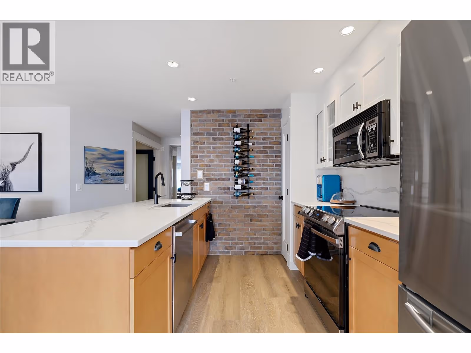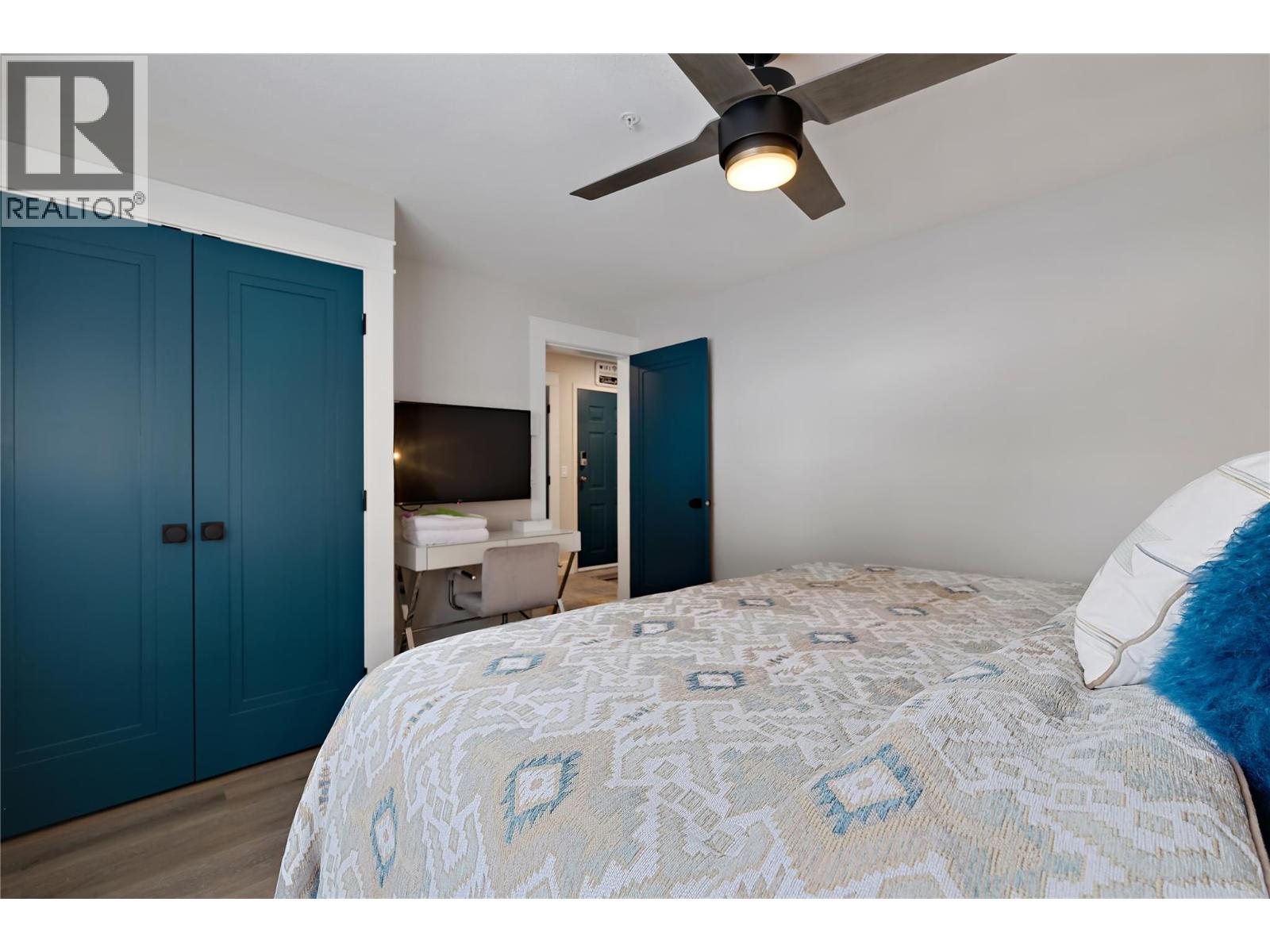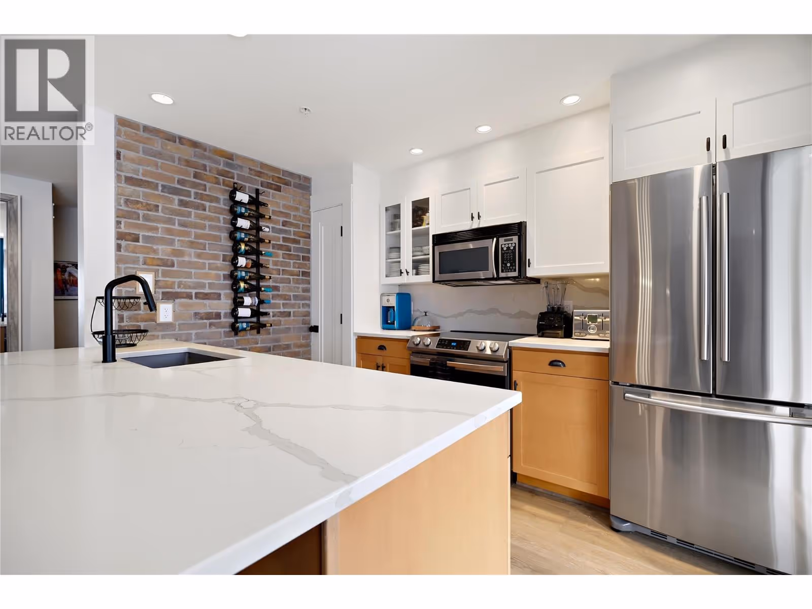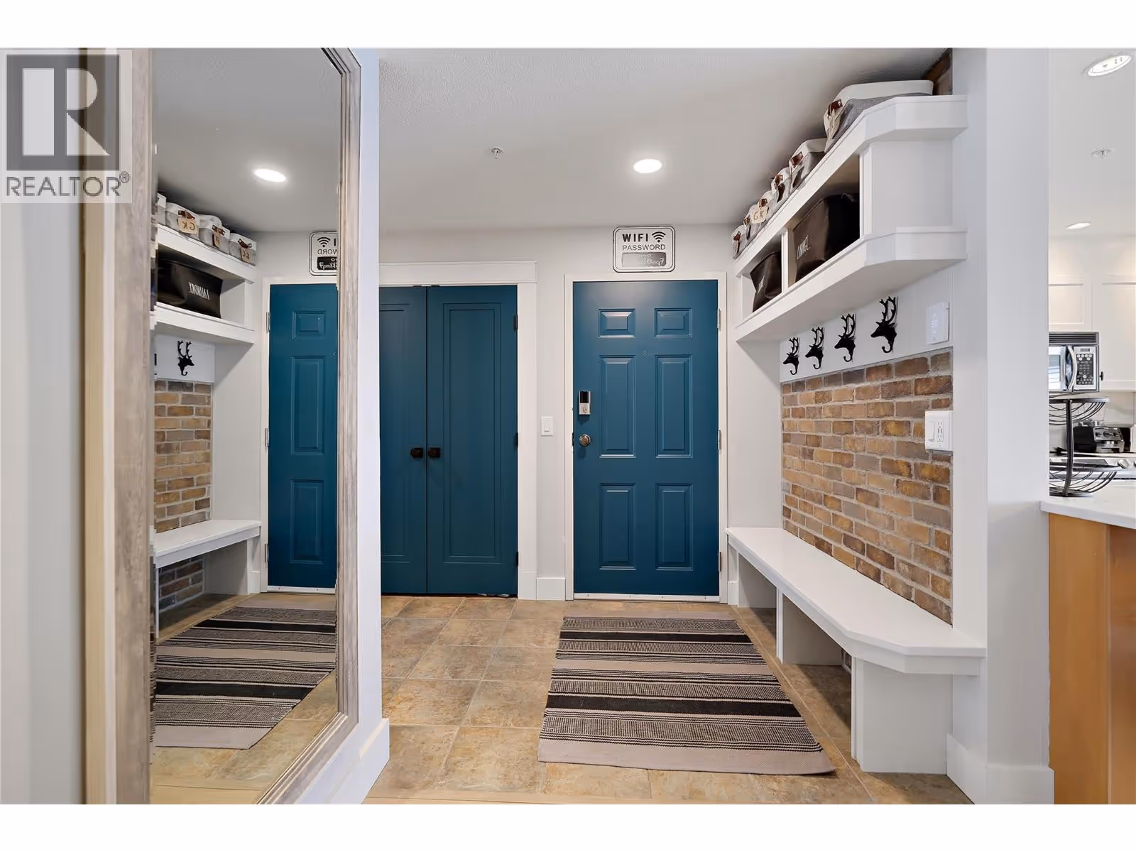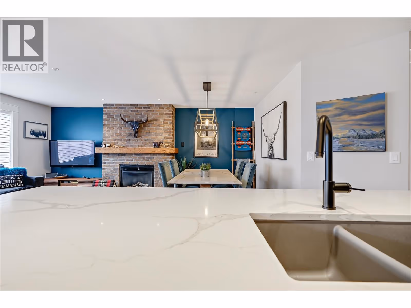 Step out your door, right in the heart of Big White Village and an easy ski out to the Perfection run & Fourth Ace restaurant! Located at Trapper's Crossing, this extensively renovated one level 765 sq.ft townhome offers all modern upgrades. The space is immediately above a private 2 car tandem garage with spacious ski gear lock-off storage ideal for family looking to store their gear while easily renting short-term. Owners bought this unit because of its ideal quiet location near the resort grocery store, restaurants, ski rentals and the true heart of the resort. A renovated 2 bedroom floorplan and 1 full bathroom that sleeps 6 comfortably. Partial Furnishings included with a new hot tub installed in 2021. Upgrades include quartz counters & backsplash, refaced fireplace, updated stainless appliances, laundry, updated window treatments, new hot water tank, floors, wireless thermostats, phantom screen, heated tile floors, additional heat from gas fireplace, in-unit laundry, built-in brick feature walls and built-in entryway. Self-managed renting allowed and no rental restrictions or requirements to rent solely with Central Reservation. A great investment opportunity. No work to be done. Just collect the keys and start skiing. (id:58842)