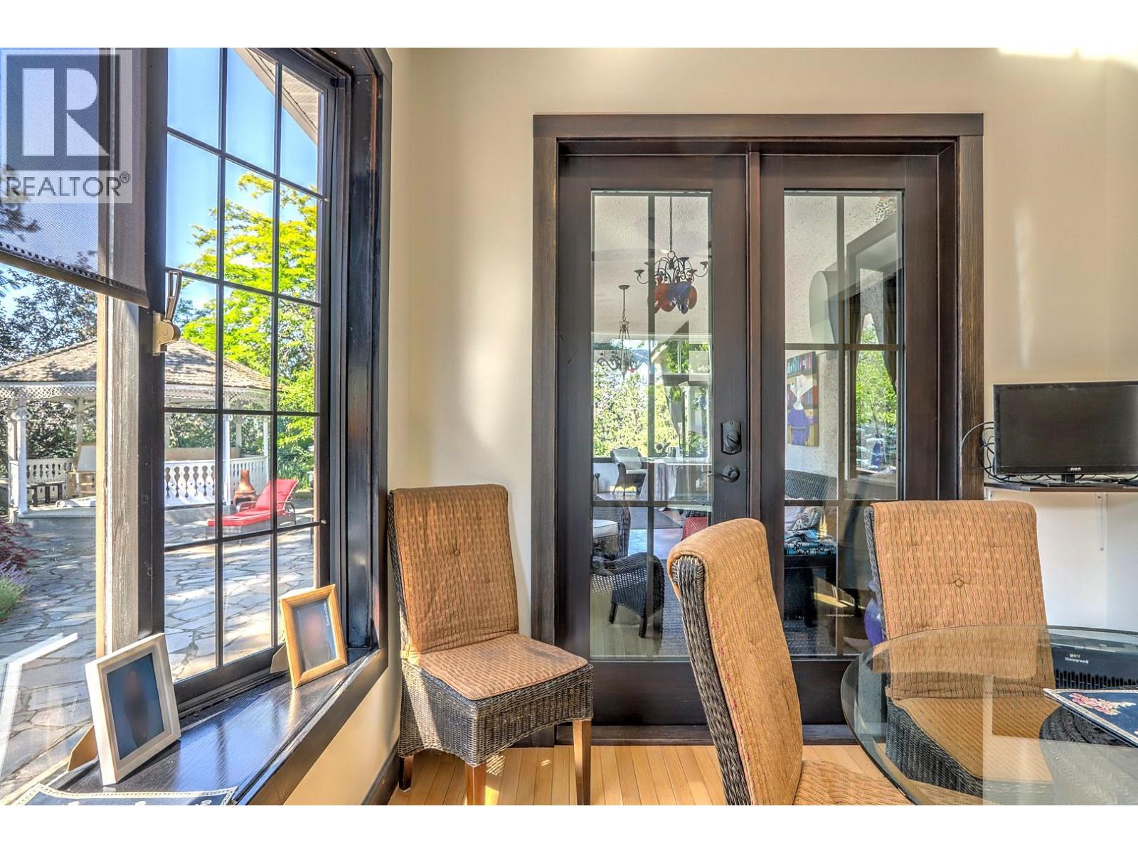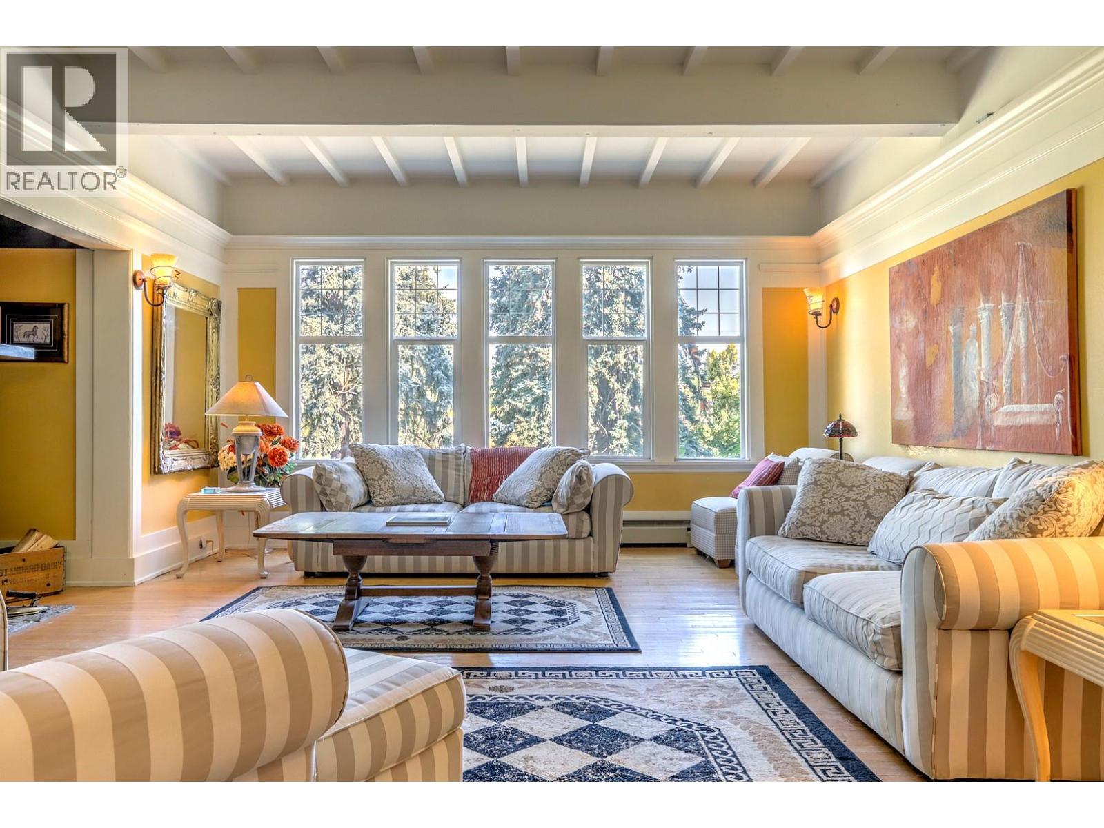 Rare opportunity to own an iconic family estate rich in history and character. Originally built in 1910, this distinguished property blends timeless craftsmanship with thoughtful updates over its 5,500+ sq ft of combined living space. The gourmet kitchen features a large island, brick accents, high-end appliances, and a breakfast nook that opens to a stunning 500+ sq ft covered wrap-around porch. Entertain with ease in the formal dining room or unwind in the elegant living room with a grand stone fireplace and intricate millwork. The spacious main-floor primary suite and laundry offer convenient living. Upstairs, find three large bedrooms, a beautifully renovated bathroom with freestanding tub, and a sprawling rec room complete with a wet bar and deck. The basement has a separate entrance, and includes a workshop, sauna, multiple storage rooms, and a separate suite. Outdoors, enjoy the expansive terrace, irrigated gardens, pond, and extensive parking. Bonus features include a studio carriage house, two garage bays, storage sheds, and large barn with pull off and excellent road exposure. Gated and private, this exceptional estate offers a combination of legacy, luxury, and lifestyle in the heart of the North Okanagan. (id:58842)