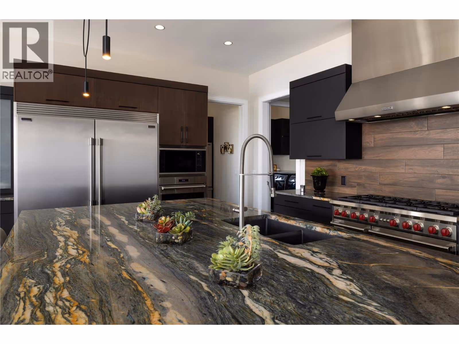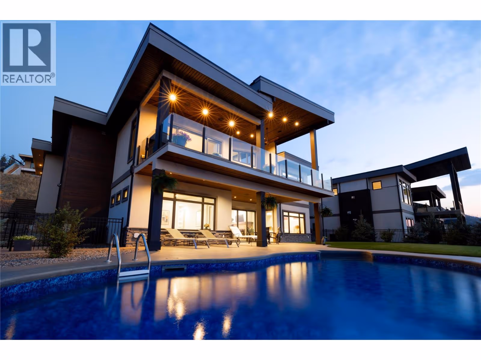 Welcome home to paradise. This custom-built and designed 5008 sq ft modern home features gorgeous lake views and the ultimate in indoor-outdoor living. Come and see for yourself why this is the #1 home on the block. Smart main floor layout with a relaxing spa-like primary bdrm ensuite+ large office. Your senses are drawn to the views in the gorgeous great room w/modern fireplace and custom millwork. The open dining room is ideal for hosting. Feast in the simply incredible kitchen with a showpiece island, every professional appliance a passionate home-chef could want, and a full-sized pantry with a second cooktop, fridge, and generous counter/storage space. Large laundry + mud room. Upr deck with gas bbq hookup, power sun shade. On the walkout lower level are 3 guest bdrms each with their own ensuite + walk-in closet. Temp-controlled wine cellar , wet bar, family room w/fireplace. Custom pool + the perfect-sized lawn to entertain the little ones or pets. Lower deck boasts cedar soffits, covered seating and room for a hot-tub. 3 car garage with epoxy floor, sink + 10 ft middle door for a boat RV or collector car lift. Alarm+video security. Smart controls for heat, pool, audio and more. Located in the prestigious Trestle Ridge development in award-winning Kettle Valley, mins to the lake, wineries, parks and walk/bike to some of the best trails in the city. Sunset views are simply incredible. Quality built by an award-winning builder and designed by the talented Materia Group. (id:58842)
