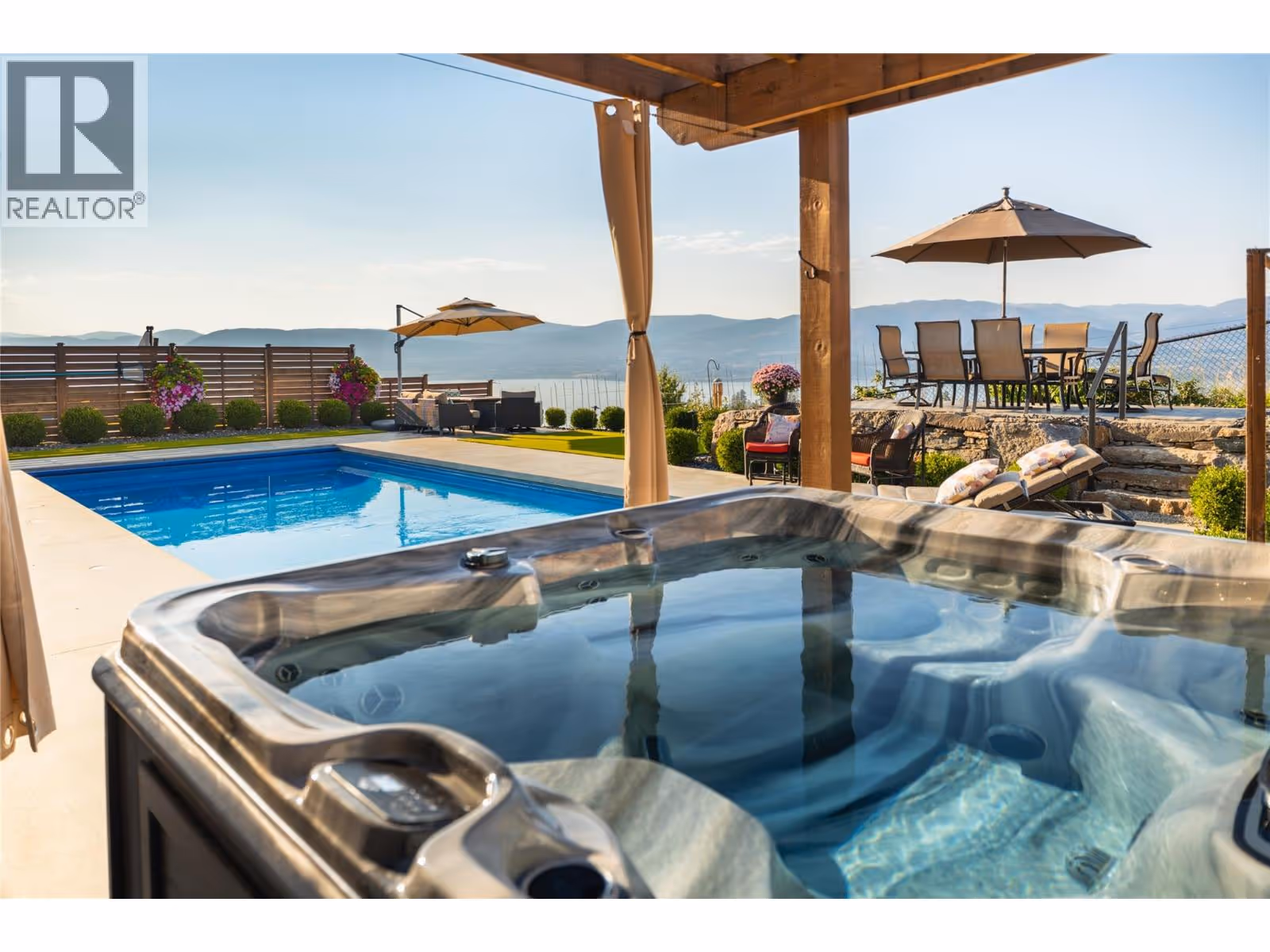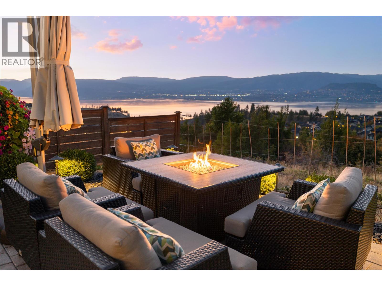 Stunning panoramic views of the lake down to Vernon, vineyards, the bridge and the city lights. Enjoy the natural green space behind the home that further enhances the views. Built by Bill Frame, this home showcases exceptional craftsmanship throughout with wide-plank wood floors, soaring ceilings, and walls of glass with the Okanagan landscape as the backdrop. The main level is a chef’s delight with Thermador appliances, functional oversized island, and butler’s pantry. Open-concept living and dining areas flow seamlessly to the covered deck, complete with full outdoor kitchen, ceiling fan, built-in heaters, and automated blinds—perfect for year-round entertaining. Enjoy the main floor primary with serene lake views, spa-like ensuite with dual vanities, soaker tub, oversized shower, skylights, heated floors, and custom walk-in closet. An office and convenient laundry complete the main level. The lower floor is perfect for entertaining all your guests with a wet bar, temperature-controlled wine room, fitness space, and large rec and family rooms. Walls of glass open to the backyard oasis featuring a heated saltwater pool, pergola-covered hot tub, lounging areas, and fire pit. Additional highlights include Bolivian walnut doors, upgraded security, Culligan water softener, reverse-osmosis purifier, and a garage with epoxy floors, workshop, EV charger, and mezzanine. Landscaped grounds with a dining patio and water feature complete this Kettle Valley masterpiece with zero maintenance yard to enjoy the full Okanagan lifestyle (id:58842)