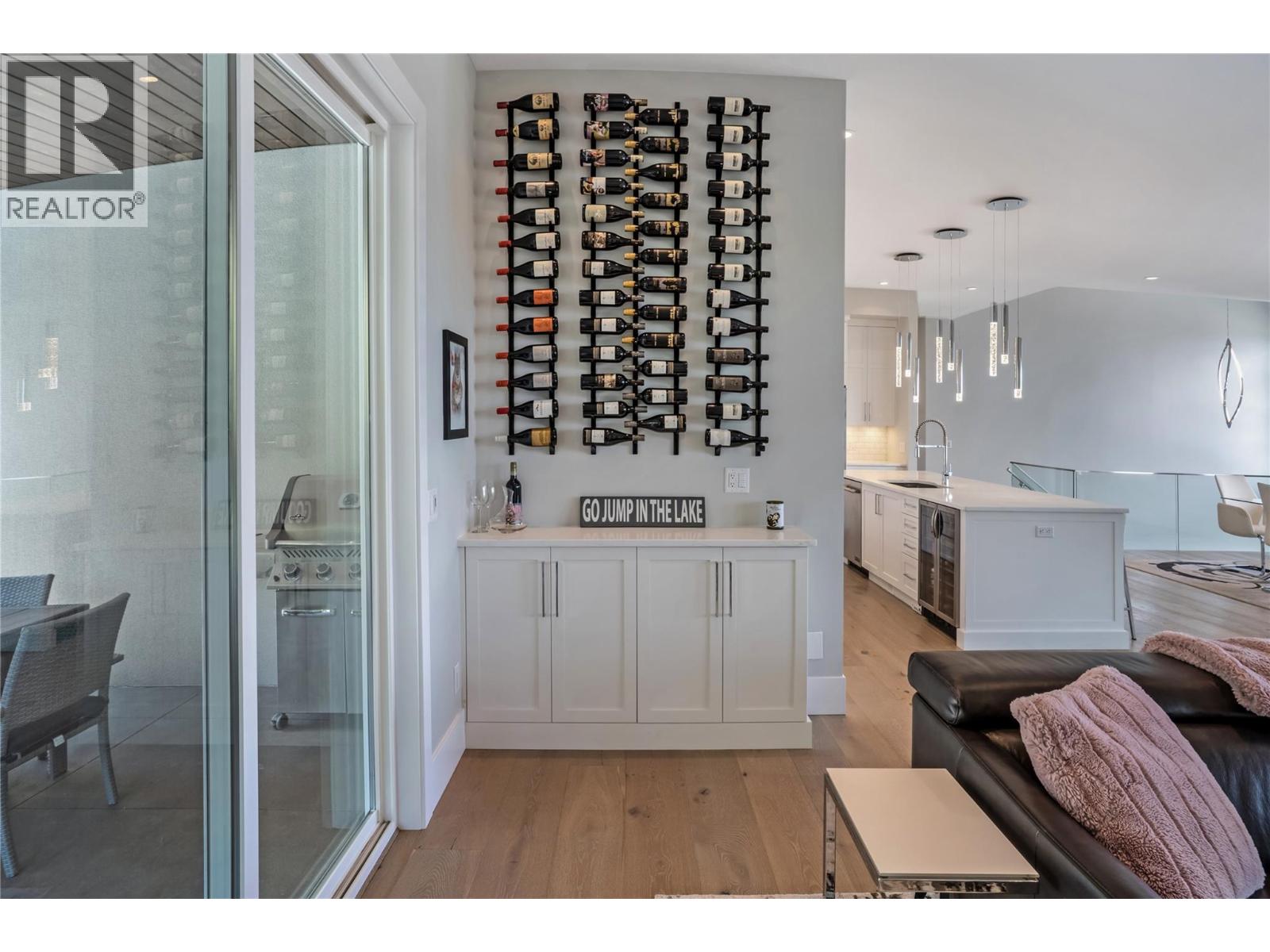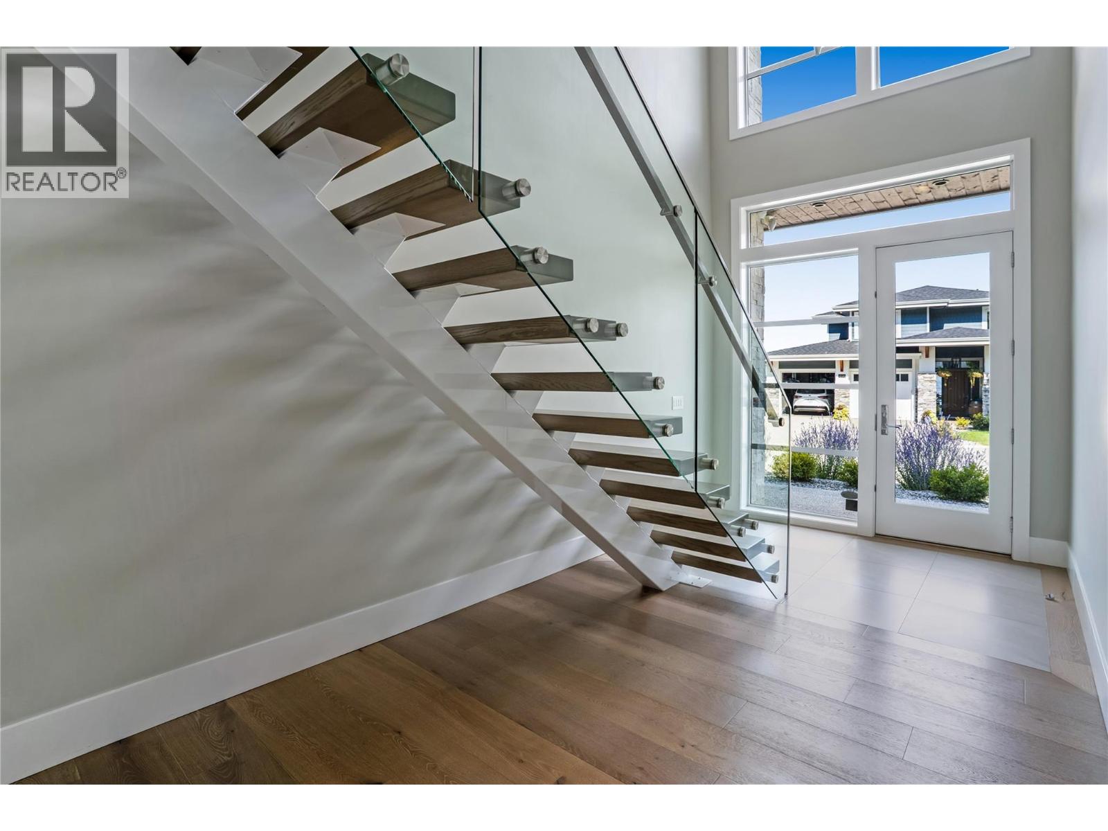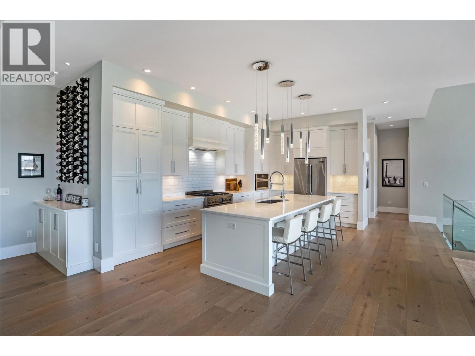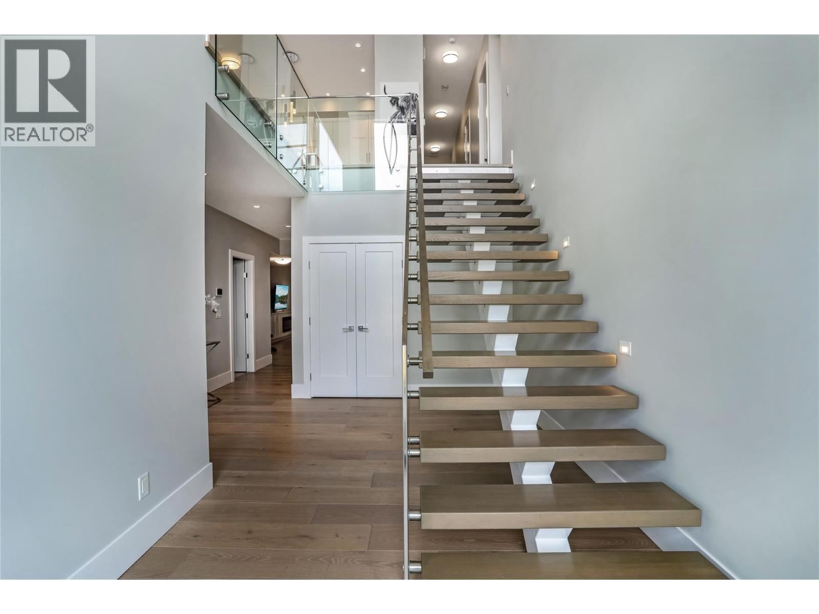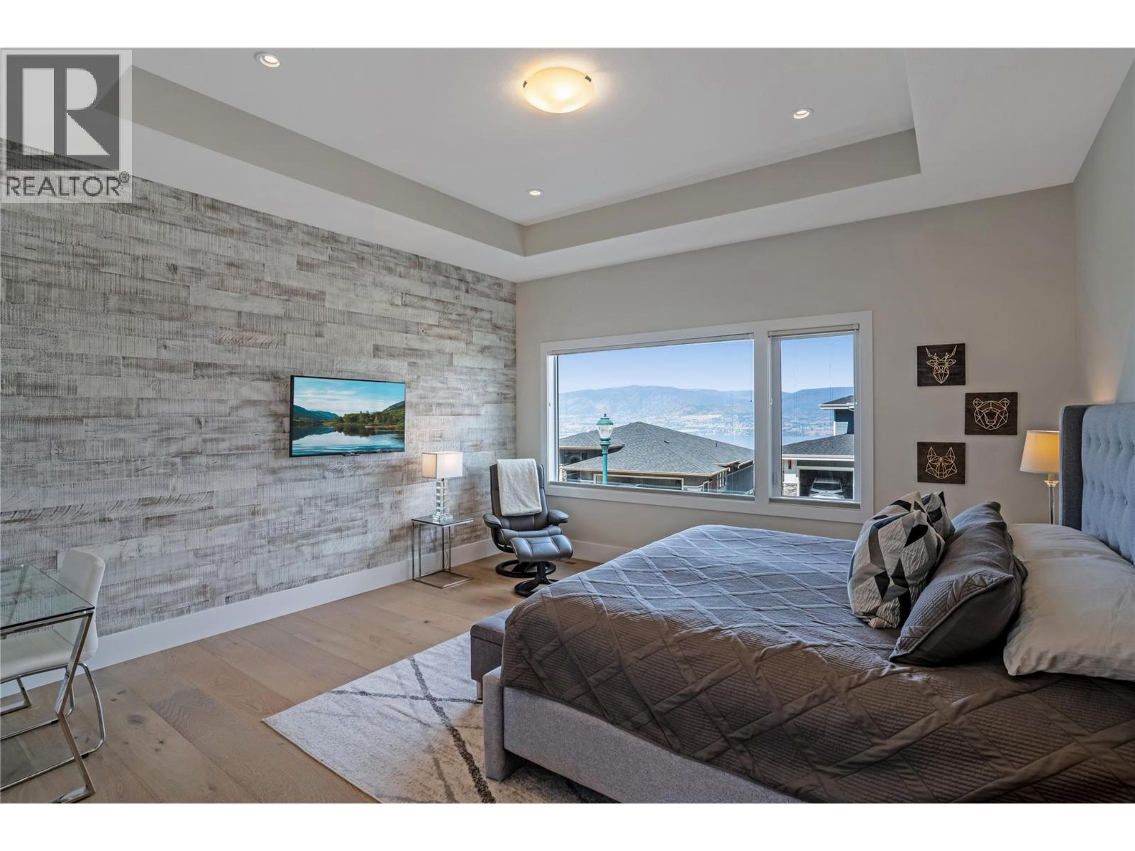 Discover custom-built luxury in this stunning 5-bedroom, 5-bath home featuring a bright, legal 1-bedroom ground-level suite. This high-efficiency smart home boasts soaring vaulted ceilings, a dramatic floating staircase, and rich wide plank wood floors. The open-concept main floor centers around a chef’s kitchen with quartz countertops, custom cabinetry, and a hidden walk-in butler’s pantry. Flow effortlessly into the spacious dining and living areas warmed by a gas fireplace, then step out onto the front deck to enjoy Okanagan Lake and mountain views. The private backyard is an entertainer’s dream with a heated saltwater pool, hot tub, and ample space to relax or host gatherings. The main-level master suite offers a spa-like retreat with a soaker tub, glass-enclosed shower, and double floating vanity with undermount lighting. Two additional bedrooms share a stylish Jack & Jill bath, with one bedroom featuring a queen Murphy bed—ideal for guests or a home office. A large laundry room with abundant counters and cabinetry enhances daily functionality. The lower level features a generous rec room with an electric fireplace, wet bar, guest bedroom, and full bath. The oversized three-car garage easily fits a boat, a car, and plenty of toys. Exceptional millwork, designer fixtures, and quality finishes elevate every room. Enjoy close proximity to top schools, parks, dining, and Okanagan’s renowned wineries. Luxury, comfort, and thoughtful design converge in this remarkable home. (id:58842)