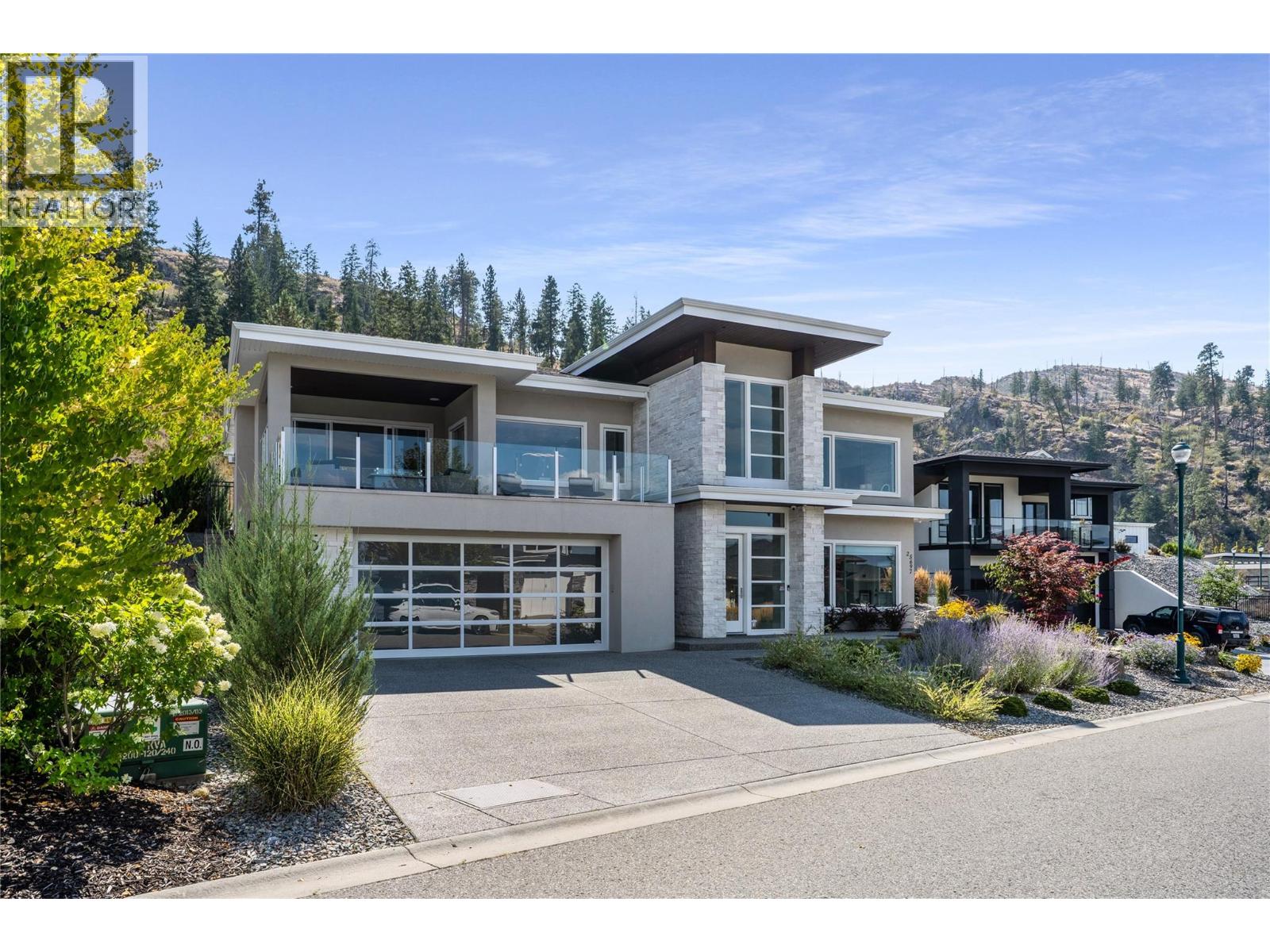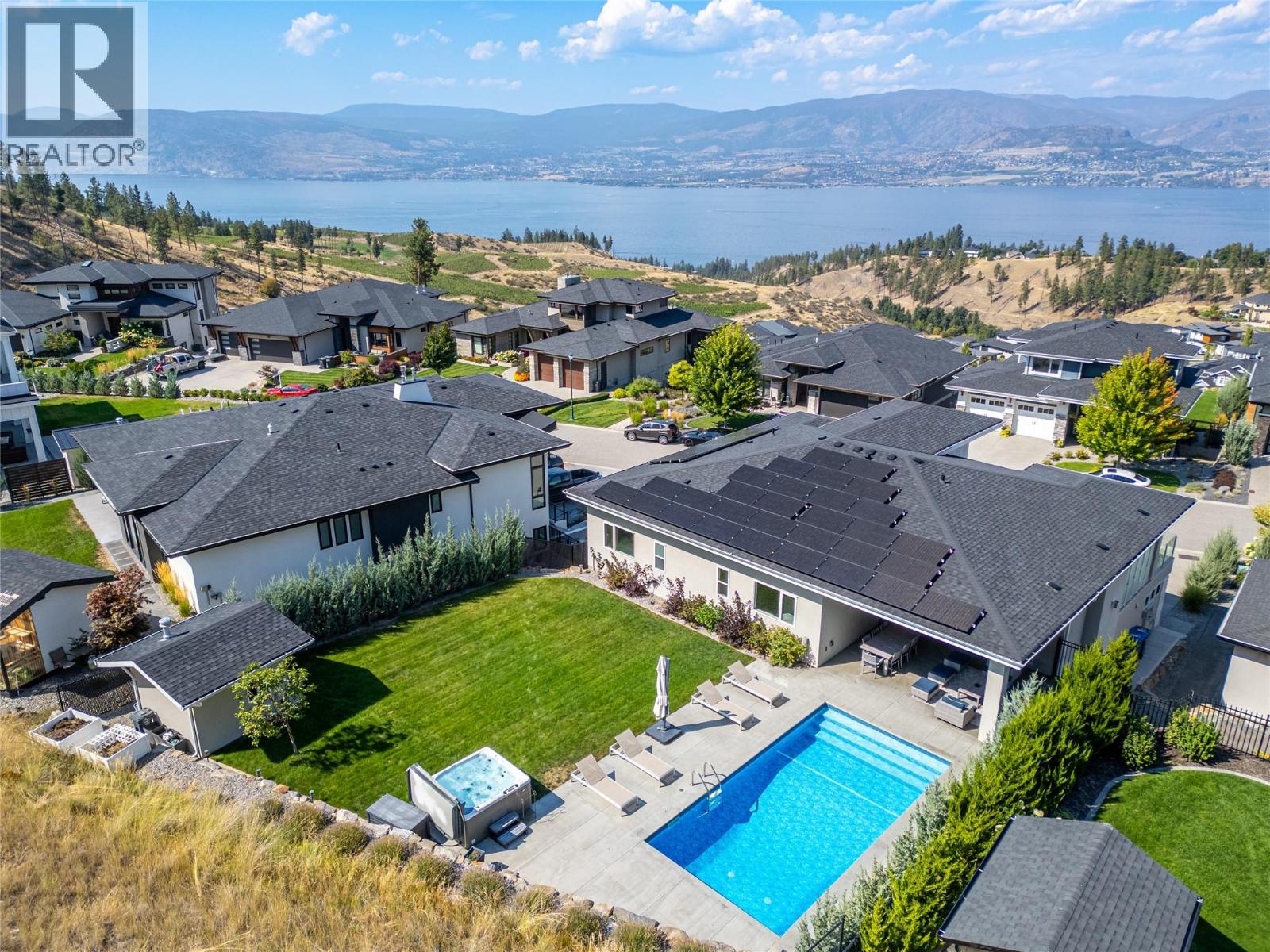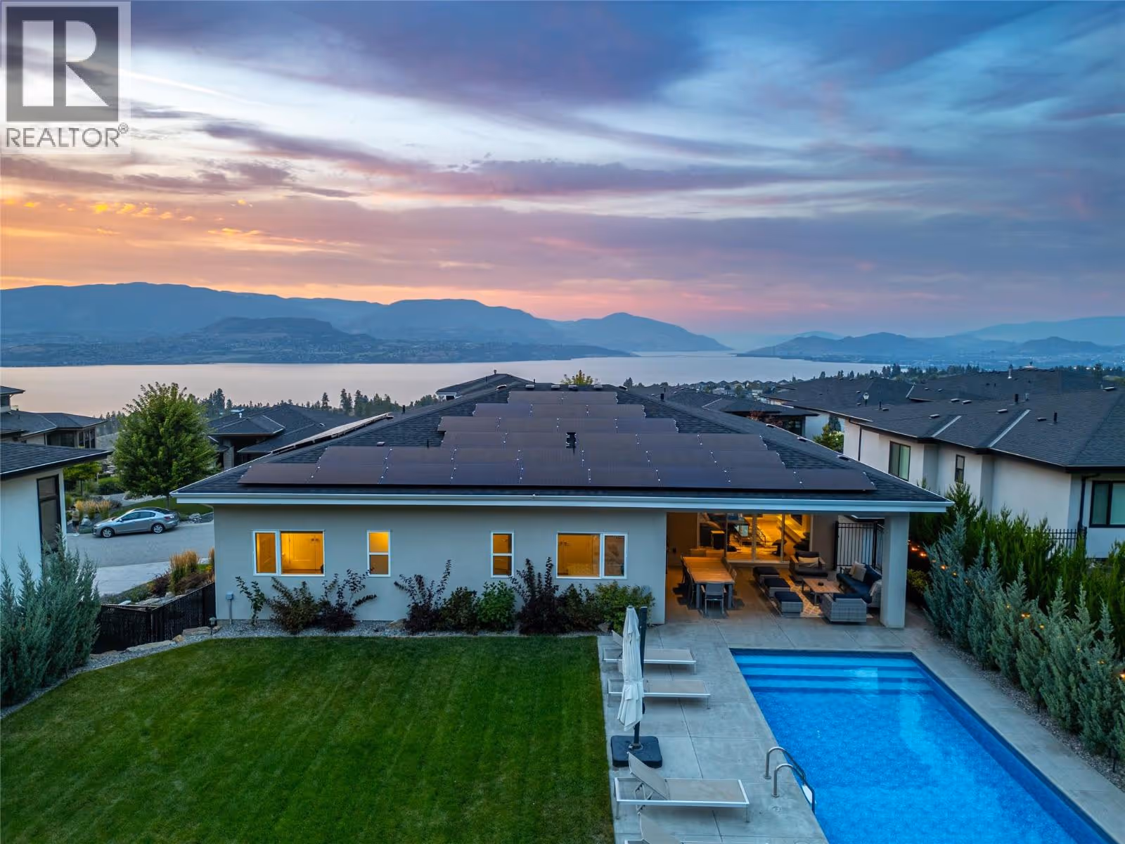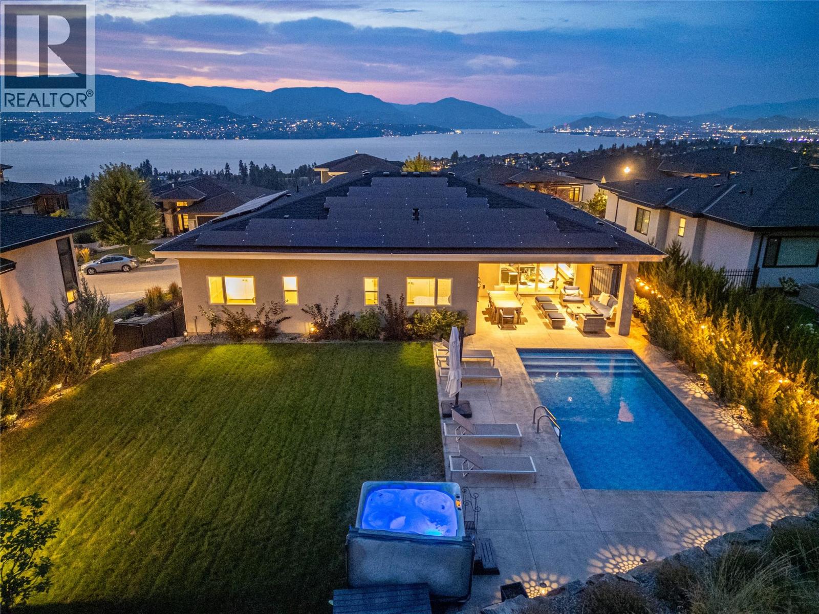 Discover custom-built luxury in this stunning 5-bedroom, 5-bath home featuring a bright, legal 1-bedroom ground-level suite. This high-efficiency smart home boasts soaring vaulted ceilings, a dramatic floating staircase, and rich wide plank wood floors. The open-concept main floor centers around a chef’s kitchen with quartz countertops, custom cabinetry, and a hidden walk-in butler’s pantry. Flow effortlessly into the spacious dining and living areas warmed by a gas fireplace, then step out onto the front deck to enjoy Okanagan Lake and mountain views. The private backyard is an entertainer’s dream with a heated saltwater pool, hot tub, and ample space to relax or host gatherings. The main-level master suite offers a spa-like retreat with a soaker tub, glass-enclosed shower, and double floating vanity with undermount lighting. Two additional bedrooms share a stylish Jack & Jill bath, with one bedroom featuring a queen Murphy bed—ideal for guests or a home office. A large laundry room with abundant counters and cabinetry enhances daily functionality. The lower level features a generous rec room with an electric fireplace, wet bar, guest bedroom, and full bath. The oversized three-car garage easily fits a boat, a car, and plenty of toys. Exceptional millwork, designer fixtures, and quality finishes elevate every room. Enjoy close proximity to top schools, parks, dining, and Okanagan’s renowned wineries. Luxury, comfort, and thoughtful design converge in this remarkable home. (id:58842)