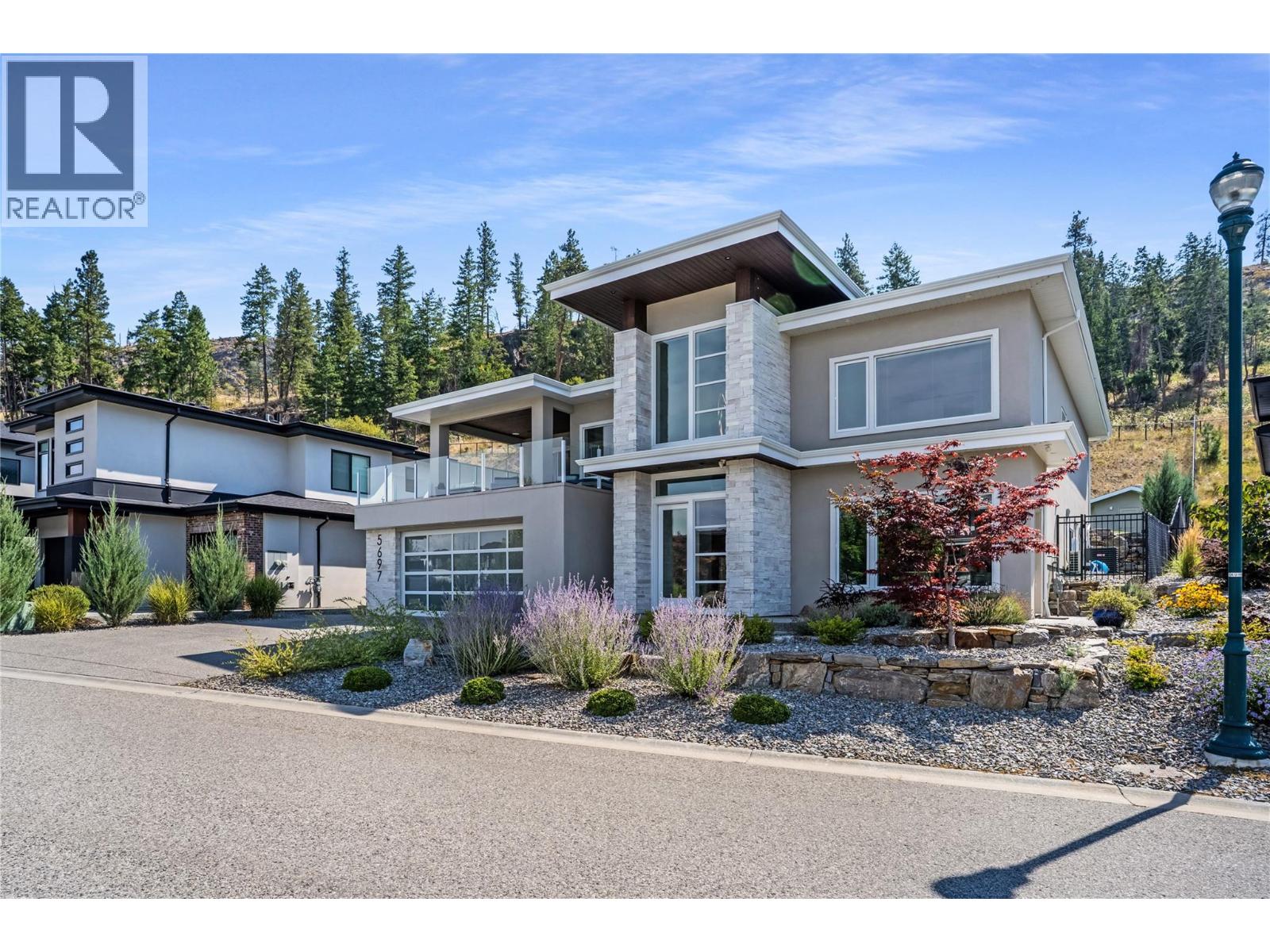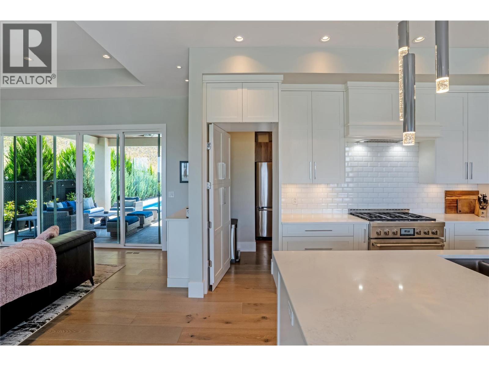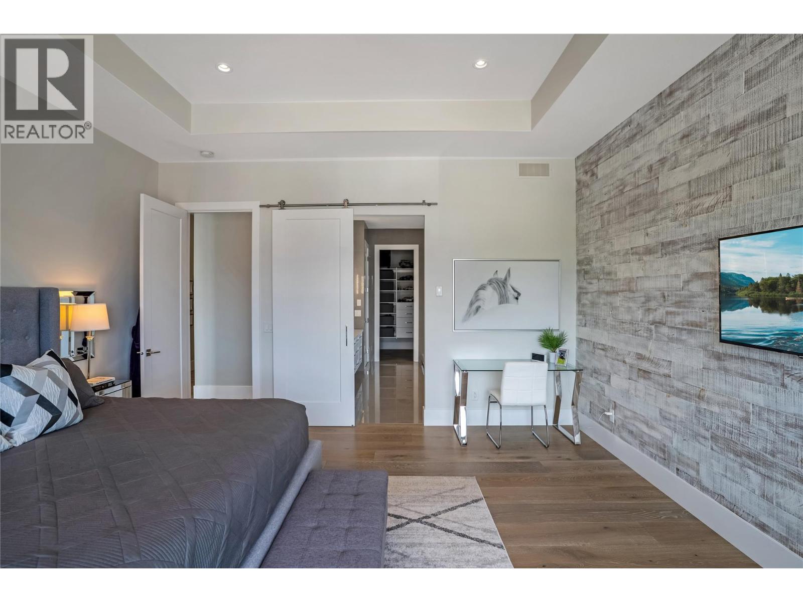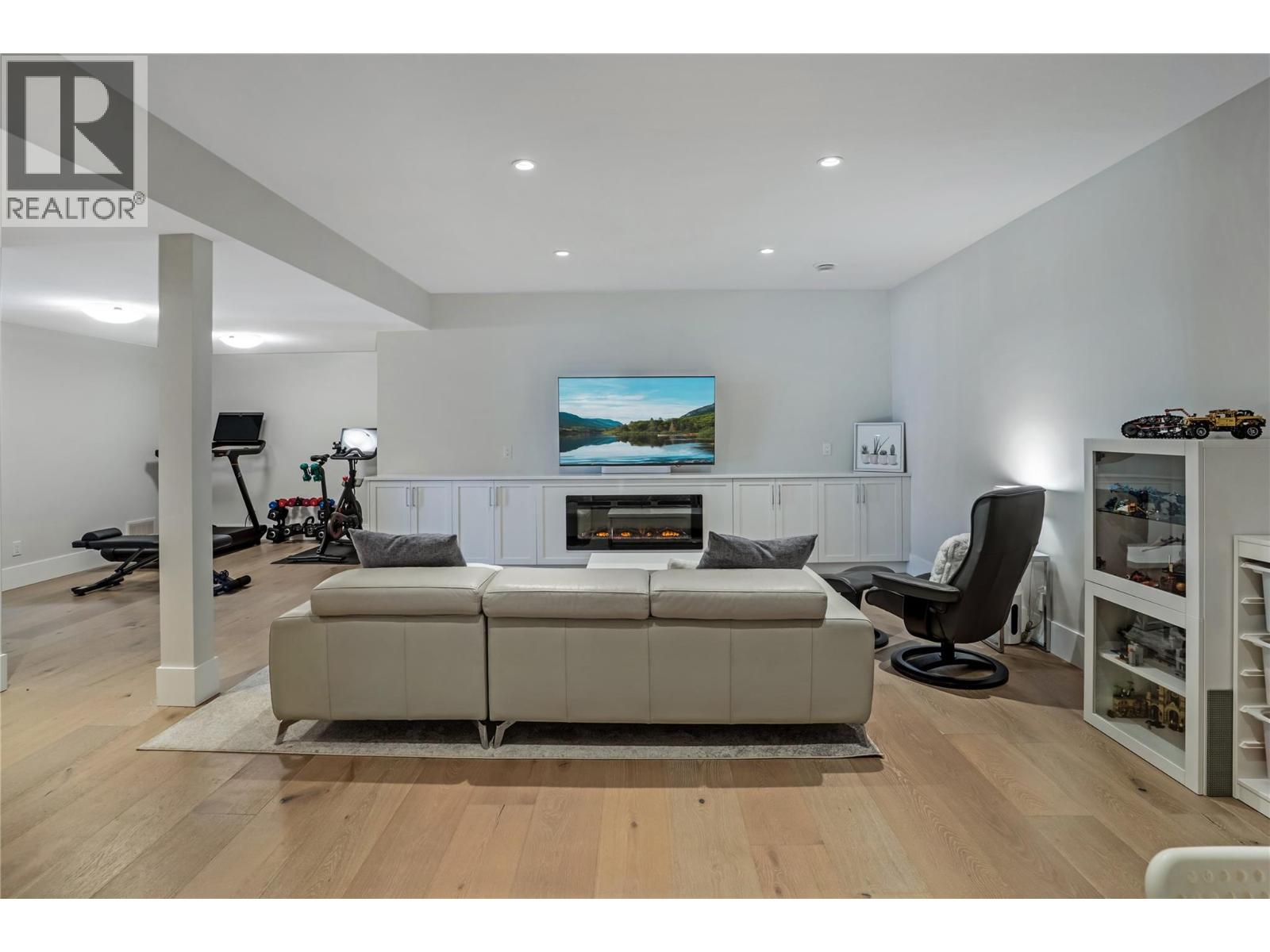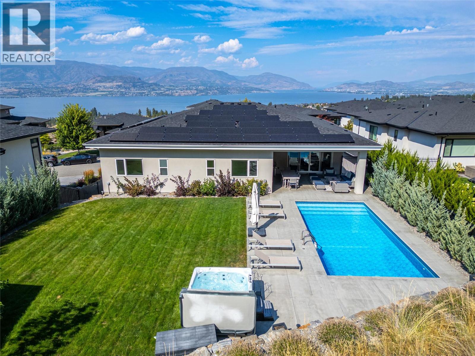 Discover custom-built luxury in this stunning 5-bedroom, 5-bath home featuring a bright, legal 1-bedroom ground-level suite. This high-efficiency smart home boasts soaring vaulted ceilings, a dramatic floating staircase, and rich wide plank wood floors. The open-concept main floor centers around a chef’s kitchen with quartz countertops, custom cabinetry, and a hidden walk-in butler’s pantry. Flow effortlessly into the spacious dining and living areas warmed by a gas fireplace, then step out onto the front deck to enjoy Okanagan Lake and mountain views. The private backyard is an entertainer’s dream with a heated saltwater pool, hot tub, and ample space to relax or host gatherings. The main-level master suite offers a spa-like retreat with a soaker tub, glass-enclosed shower, and double floating vanity with undermount lighting. Two additional bedrooms share a stylish Jack & Jill bath, with one bedroom featuring a queen Murphy bed—ideal for guests or a home office. A large laundry room with abundant counters and cabinetry enhances daily functionality. The lower level features a generous rec room with an electric fireplace, wet bar, guest bedroom, and full bath. The oversized three-car garage easily fits a boat, a car, and plenty of toys. Exceptional millwork, designer fixtures, and quality finishes elevate every room. Enjoy close proximity to top schools, parks, dining, and Okanagan’s renowned wineries. Luxury, comfort, and thoughtful design converge in this remarkable home. (id:58842)