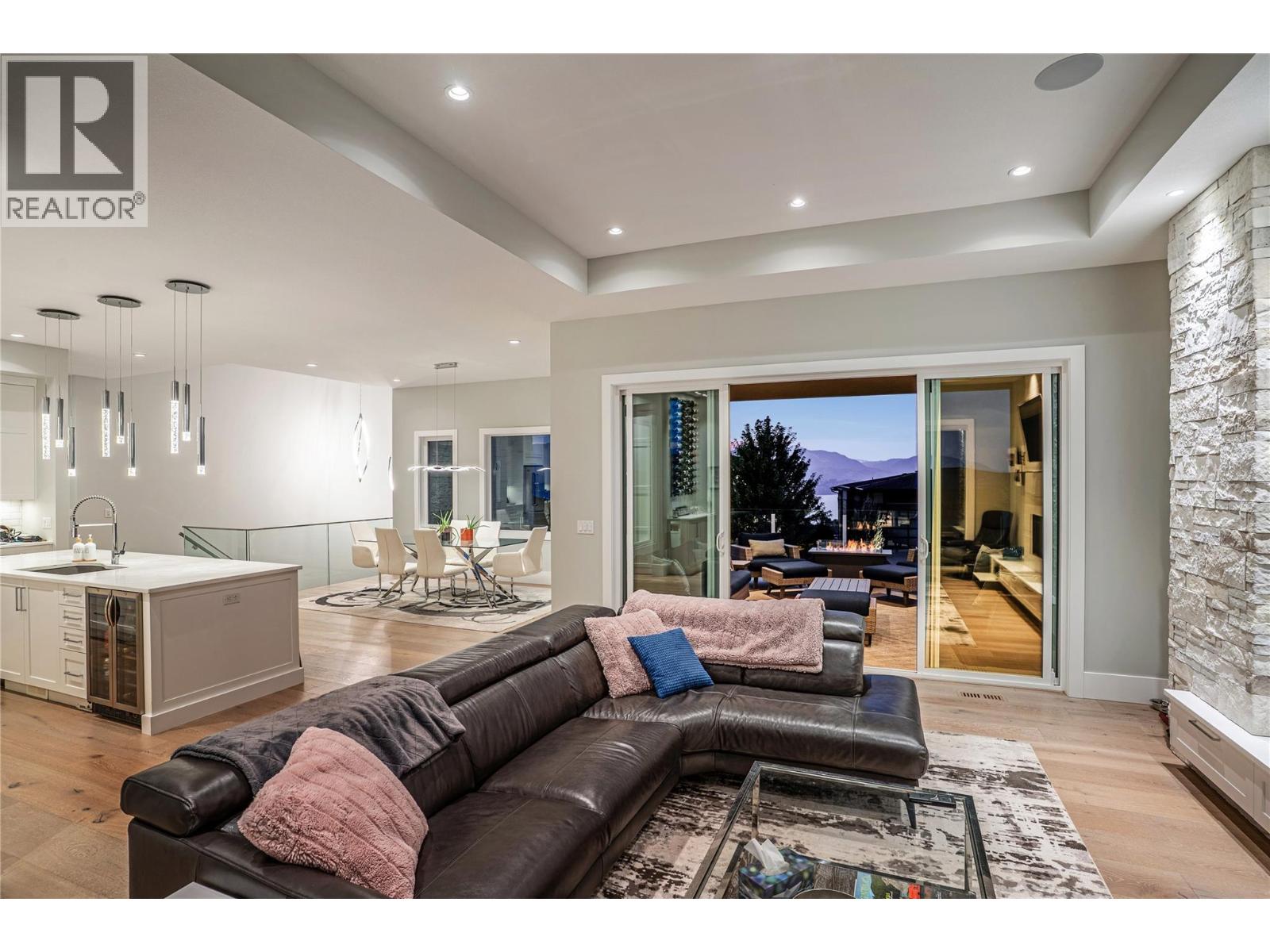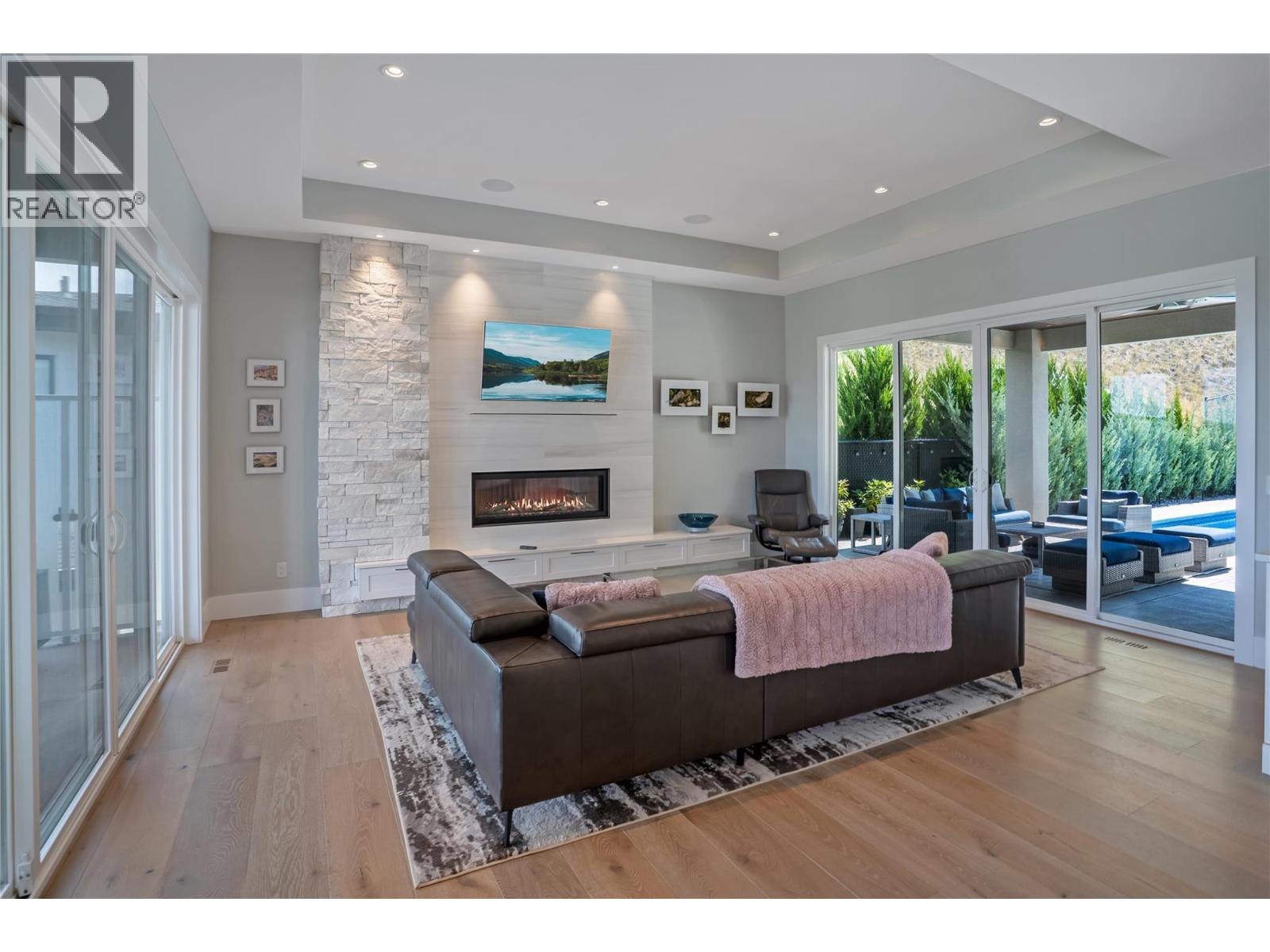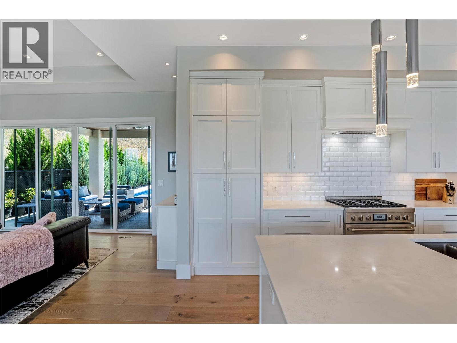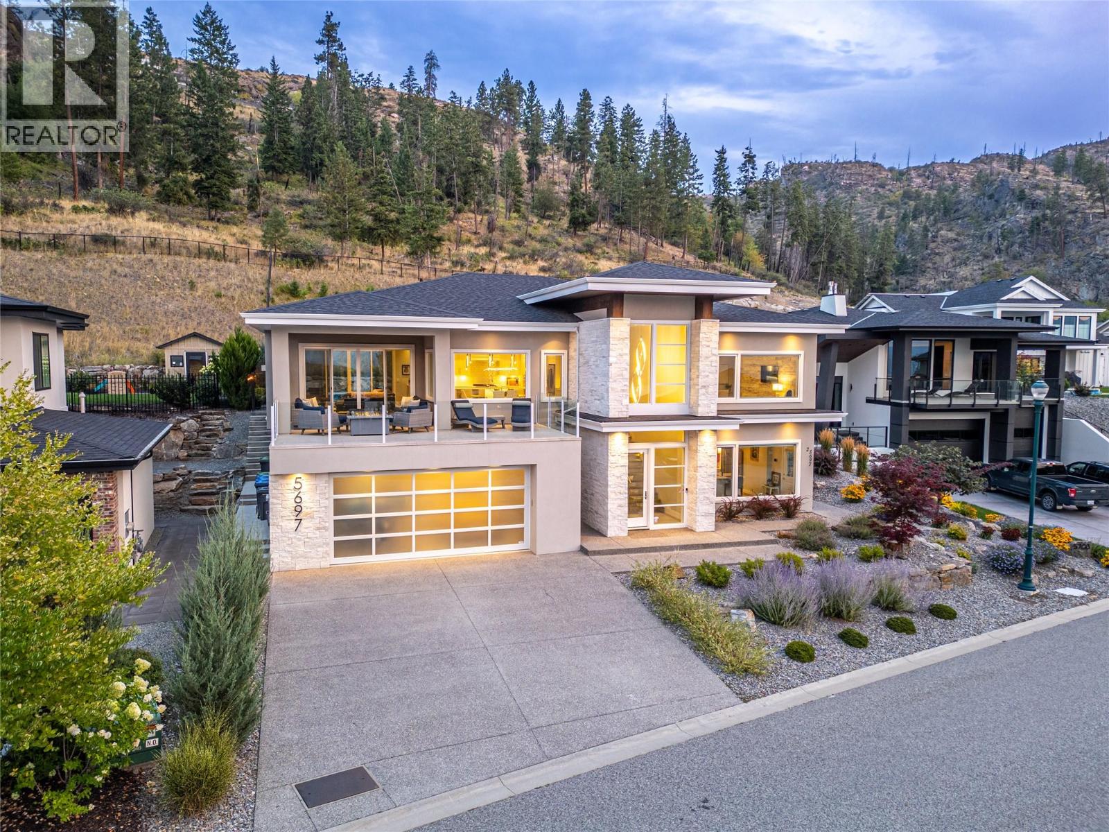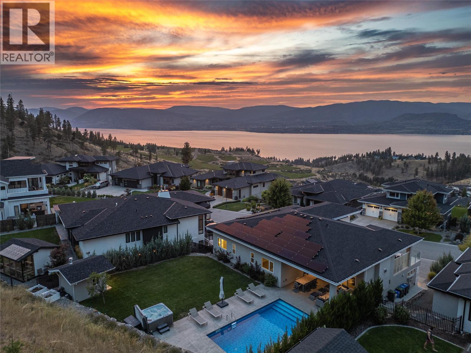 Discover custom-built luxury in this stunning 5-bedroom, 5-bath home featuring a bright, legal 1-bedroom ground-level suite. This high-efficiency smart home boasts soaring vaulted ceilings, a dramatic floating staircase, and rich wide plank wood floors. The open-concept main floor centers around a chef’s kitchen with quartz countertops, custom cabinetry, and a hidden walk-in butler’s pantry. Flow effortlessly into the spacious dining and living areas warmed by a gas fireplace, then step out onto the front deck to enjoy Okanagan Lake and mountain views. The private backyard is an entertainer’s dream with a heated saltwater pool, hot tub, and ample space to relax or host gatherings. The main-level master suite offers a spa-like retreat with a soaker tub, glass-enclosed shower, and double floating vanity with undermount lighting. Two additional bedrooms share a stylish Jack & Jill bath, with one bedroom featuring a queen Murphy bed—ideal for guests or a home office. A large laundry room with abundant counters and cabinetry enhances daily functionality. The lower level features a generous rec room with an electric fireplace, wet bar, guest bedroom, and full bath. The oversized three-car garage easily fits a boat, a car, and plenty of toys. Exceptional millwork, designer fixtures, and quality finishes elevate every room. Enjoy close proximity to top schools, parks, dining, and Okanagan’s renowned wineries. Luxury, comfort, and thoughtful design converge in this remarkable home. (id:58842)