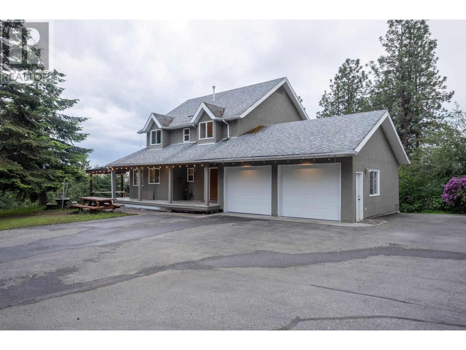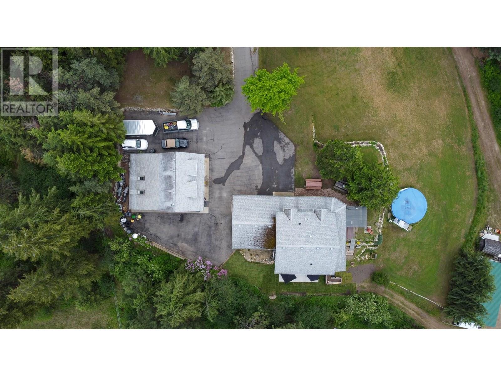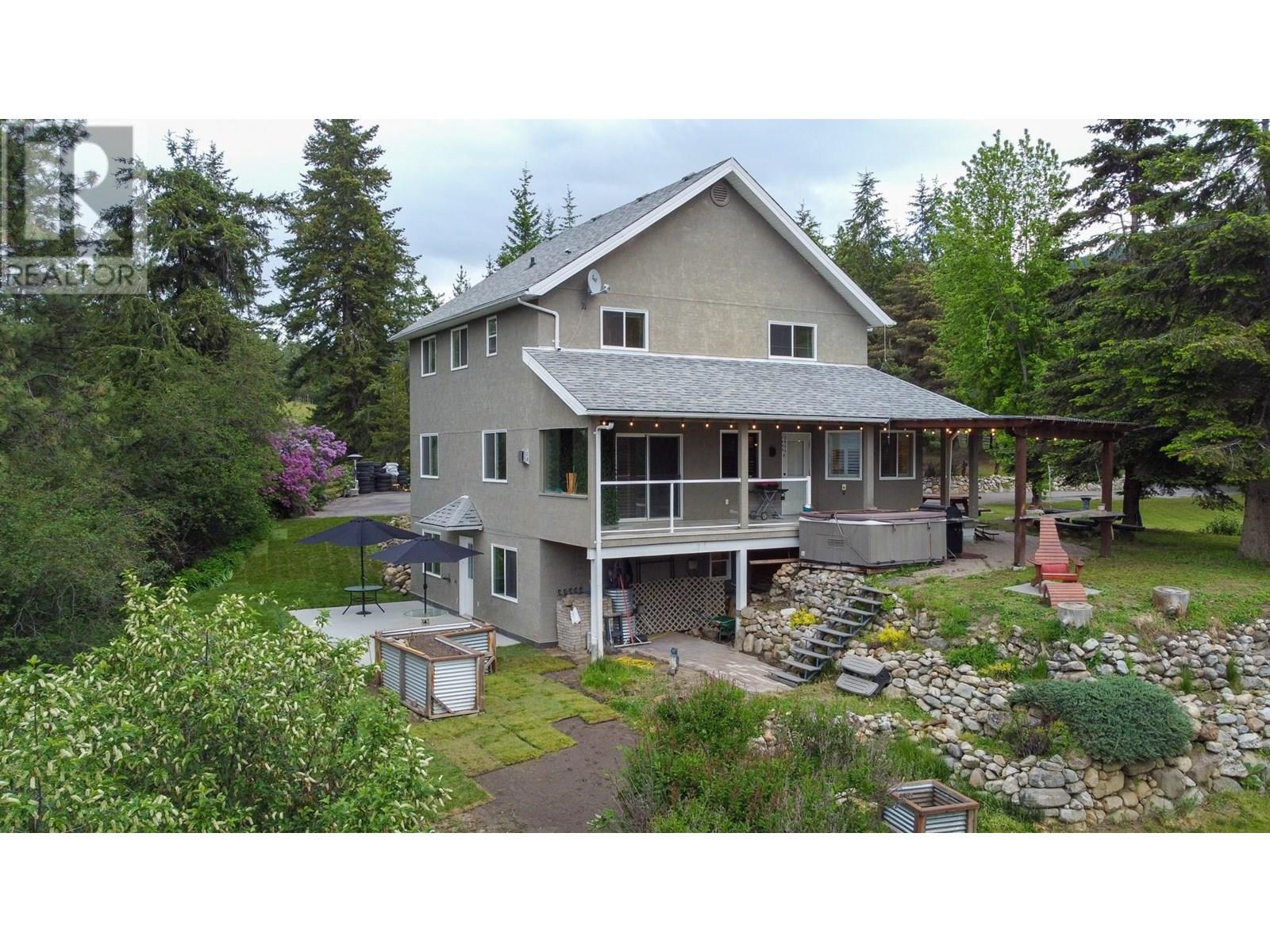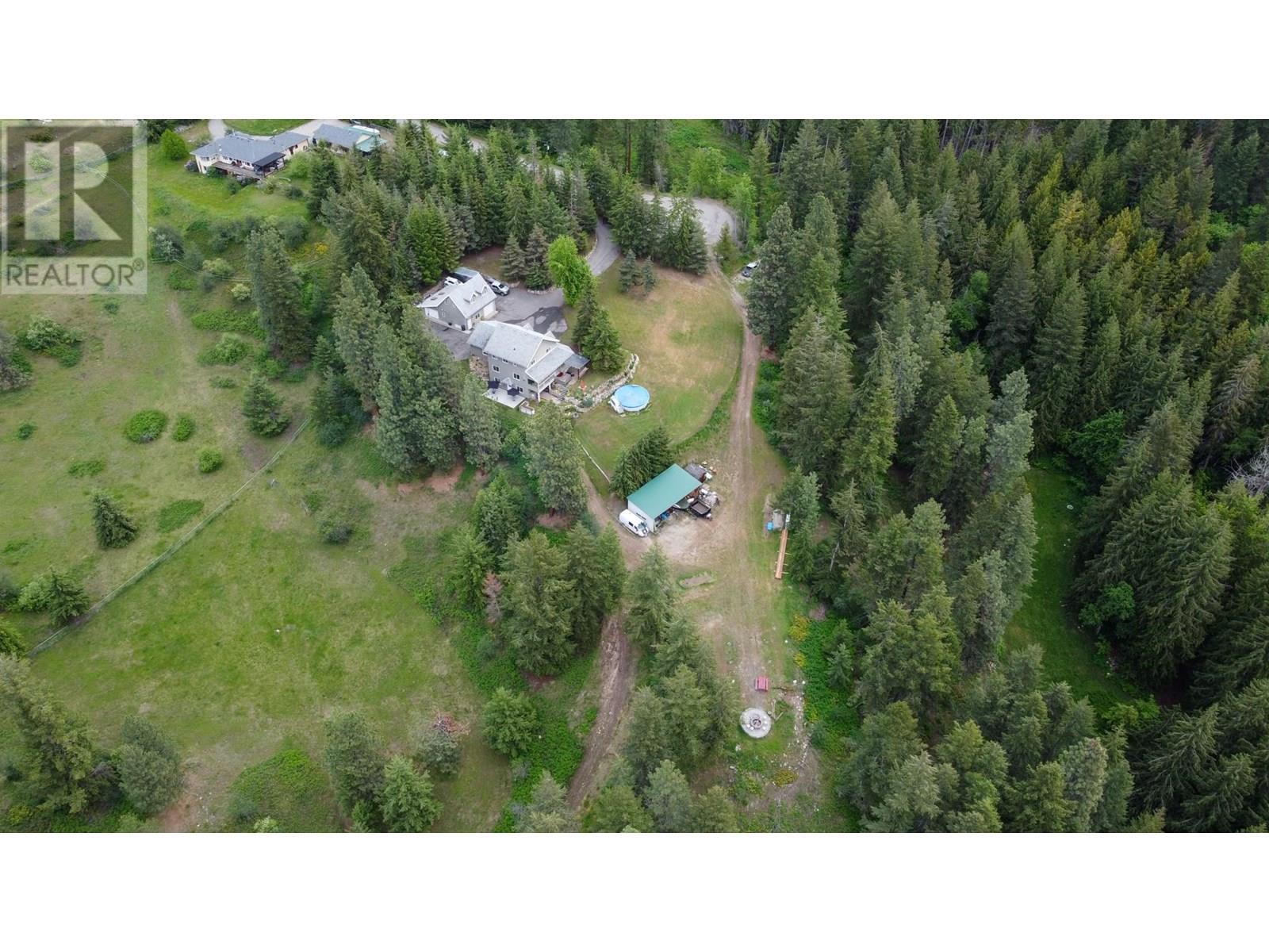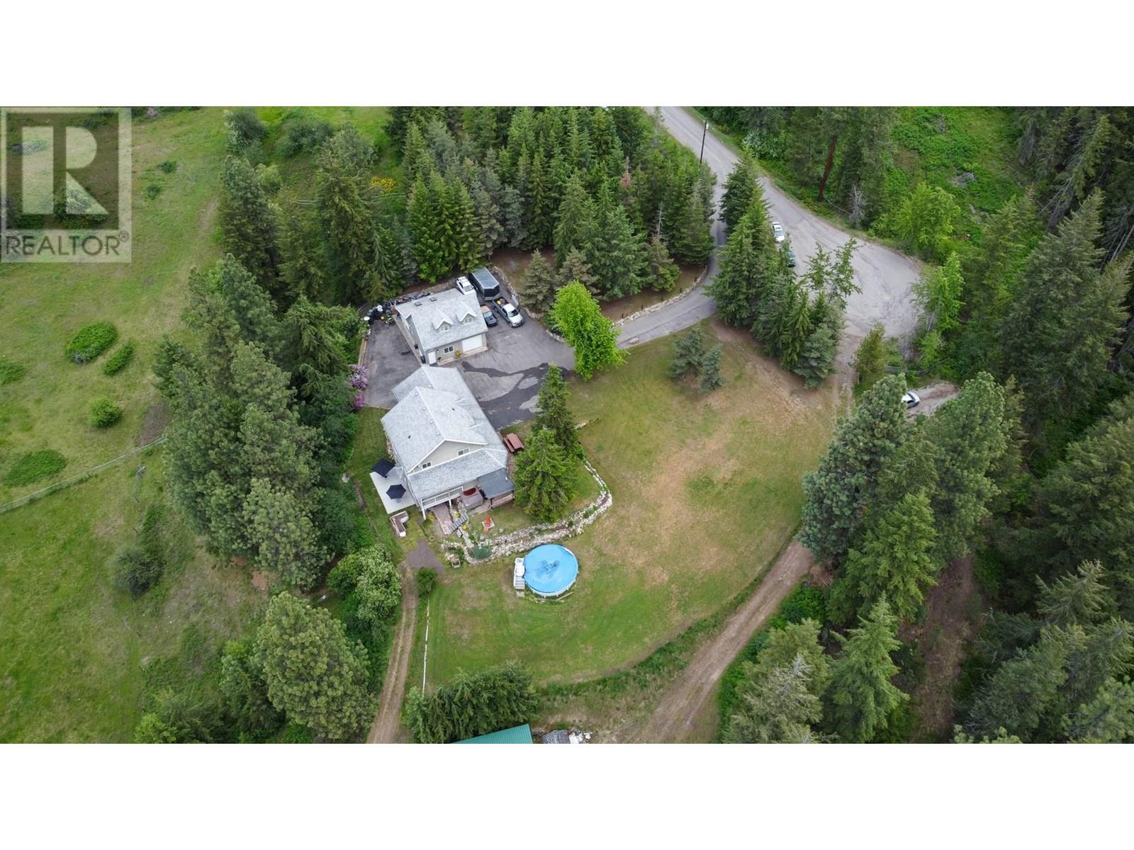 Discover your own private haven with this beautiful acreage tucked at the end of a no-through road—an ideal spot for maximum privacy and tranquility. Surrounded by towering trees and offering stunning views of city lights, this nearly 5.5-acre property borders the peaceful BX Creek, blending natural beauty with convenience. The spacious two-story home features five bedrooms and three bathrooms, along with a fully finished basement that has its own exterior entrance and a brand-new concrete deck—perfect for guests or additional privacy. Inside, the main level boasts a family-sized kitchen with a cozy bay window eating area, a large family room with sliding doors that open onto a covered wrap-around porch—ideal for soaking in the scenic surroundings. Upstairs, you'll find two large master-style bedrooms, while the basement offers three more bedrooms, a second kitchen, laundry room, and a spa-like sauna for relaxation. Additional features include cold storage in the utility room, a double attached garage, and a detached shop/garage wired for 220V with a high-efficiency furnace, plus a self-contained one-bedroom , one bathroom suite—perfect for guests or rental income. The 4-bay equipment shed, accessible via a second driveway, can be easily converted into stalls for animals. The main driveway is completely paved, providing ample space for RV parking, complete with a sani-dump station. Outdoor amenities include a pool, hot tub area, and firepit—creating an inviting setting for entertaining and enjoying your own slice of paradise. (id:58842)