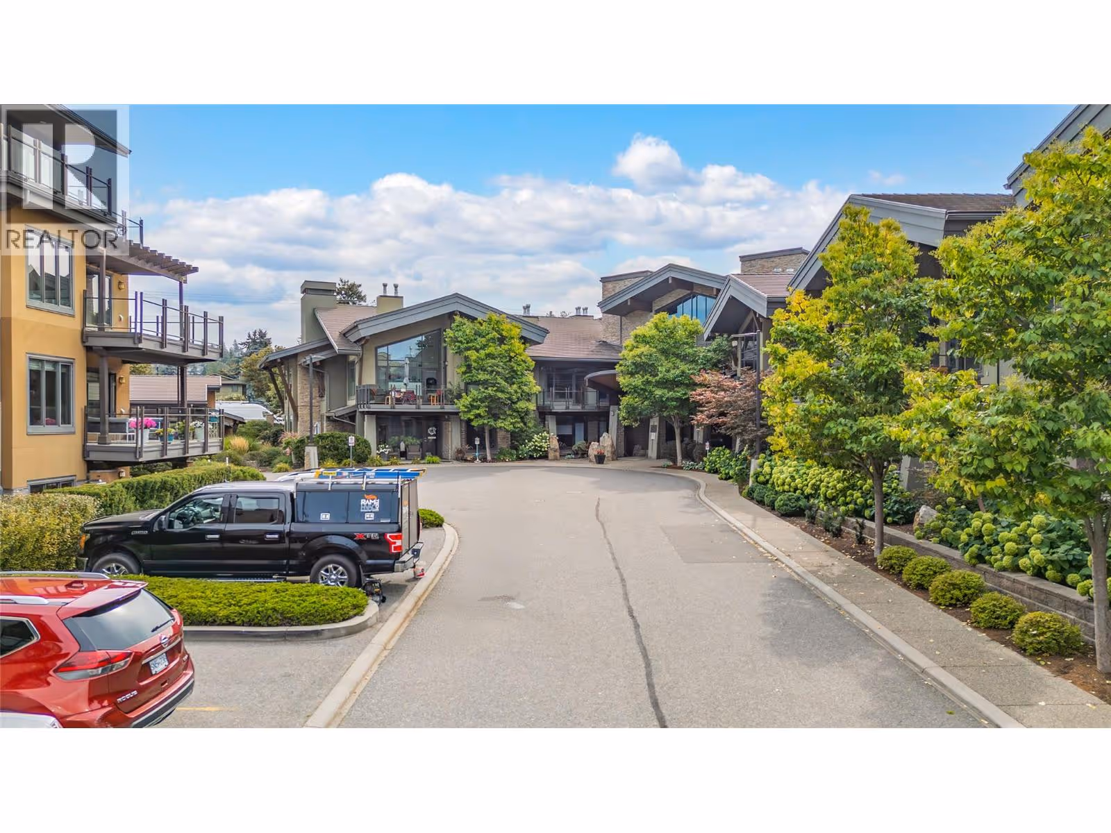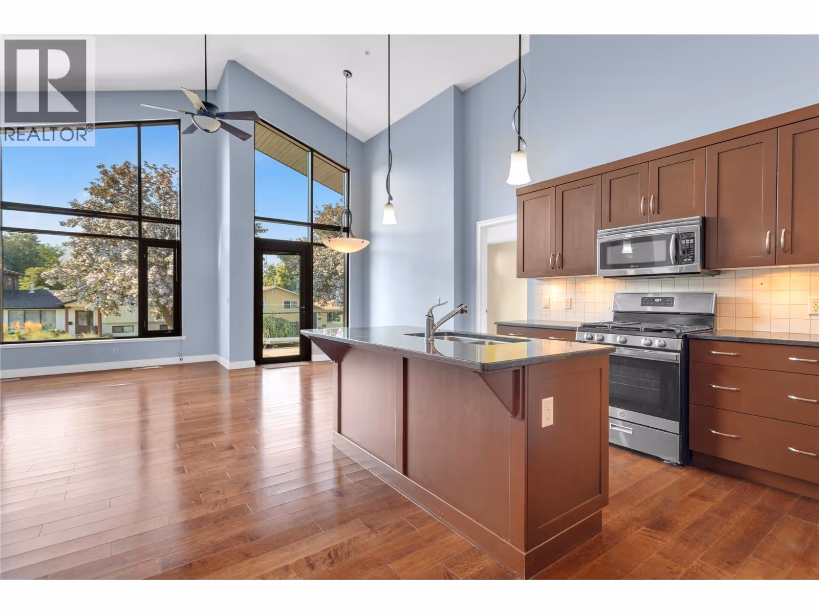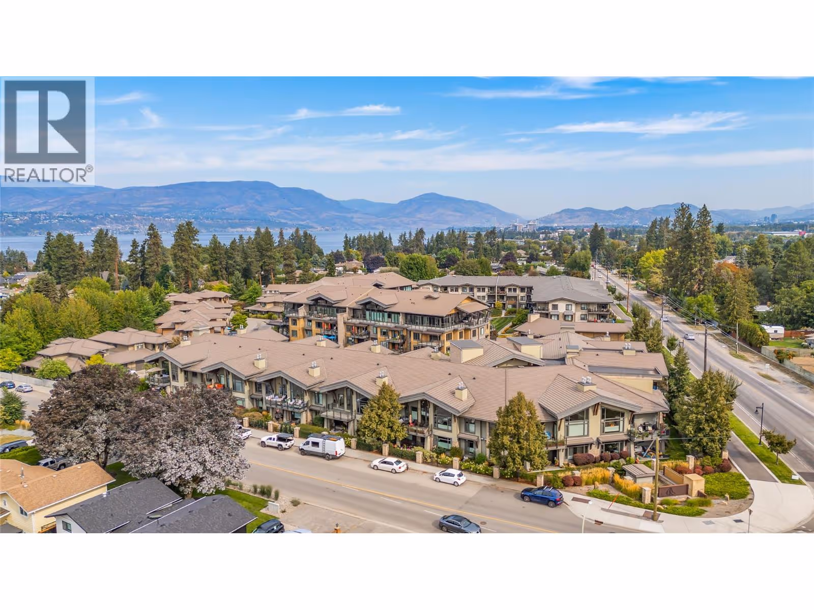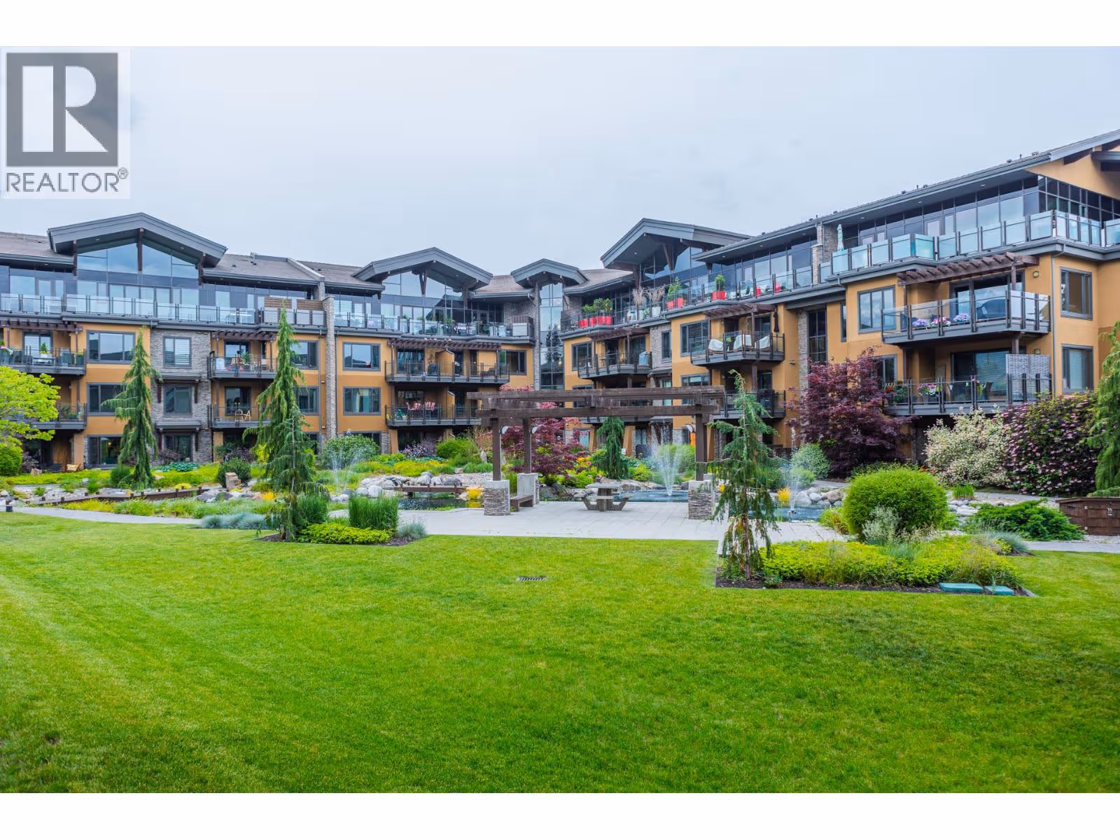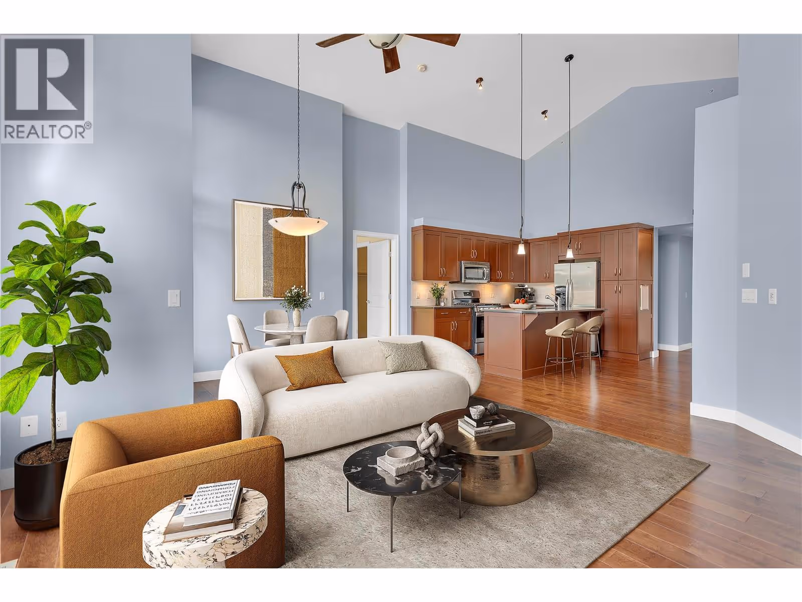RARE OPPORTUNITY to own a TOP FLOOR executive condo in the sought after 'Southwind at Sarsons' community in the heart of the Lower Mission. TWO side x side PARKING STALLS included! This 2-Bedroom plus Den, 2-Bath home offers nearly 1,500 sq. ft. of bright open living space with soaring 18' vaulted ceilings and expansive south-facing windows that flood the home with natural light. Perfect for entertaining, the kitchen features a large island with granite counters, maple cabinetry, a gas stove, and flows seamlessly into the spacious living area with hardwood floors and a cozy gas fireplace. The primary suite includes a generous walk-in closet and a spa-inspired ensuite with double sinks, soaker tub and separate shower. A versatile flex area makes for the perfect den, home office or craft room. Strata fee includes environmentally friendly geothermal heating/cooling and first-class on site amenities include an indoor/outdoor pool, hot tub, fitness center and private residents lounge. Stunning landscaped grounds showcasing award-winning gardens and a beautiful water feature/pergola. Separate secured storage locker in parkade. One pet permitted <15"" from shoulder and max 12 kgs. Rentals allowed - 6 month minimum. Minutes to Sarsons Beach, Sunshine Market, Barn Owl Brewing, H2O Center, Mission Greenway, Michaelbrook Golf Course and world renowned Wineries! Experience Okanagan living at its finest! Move-In Ready! **Furnished photos have been virtually staged** (id:58842)