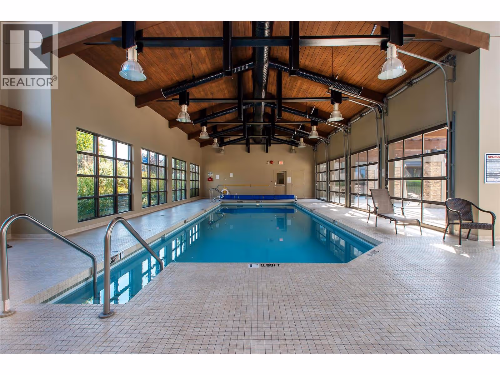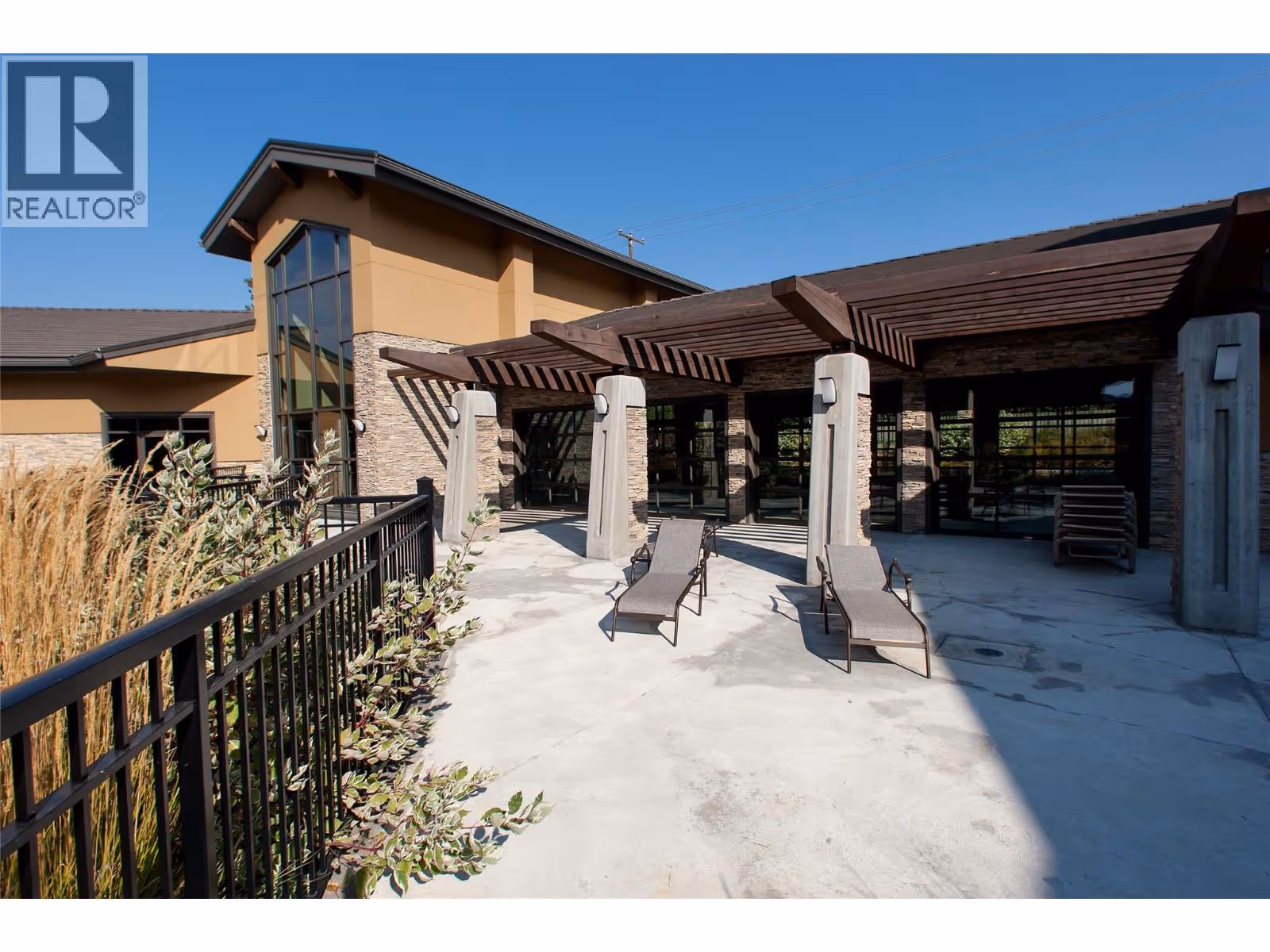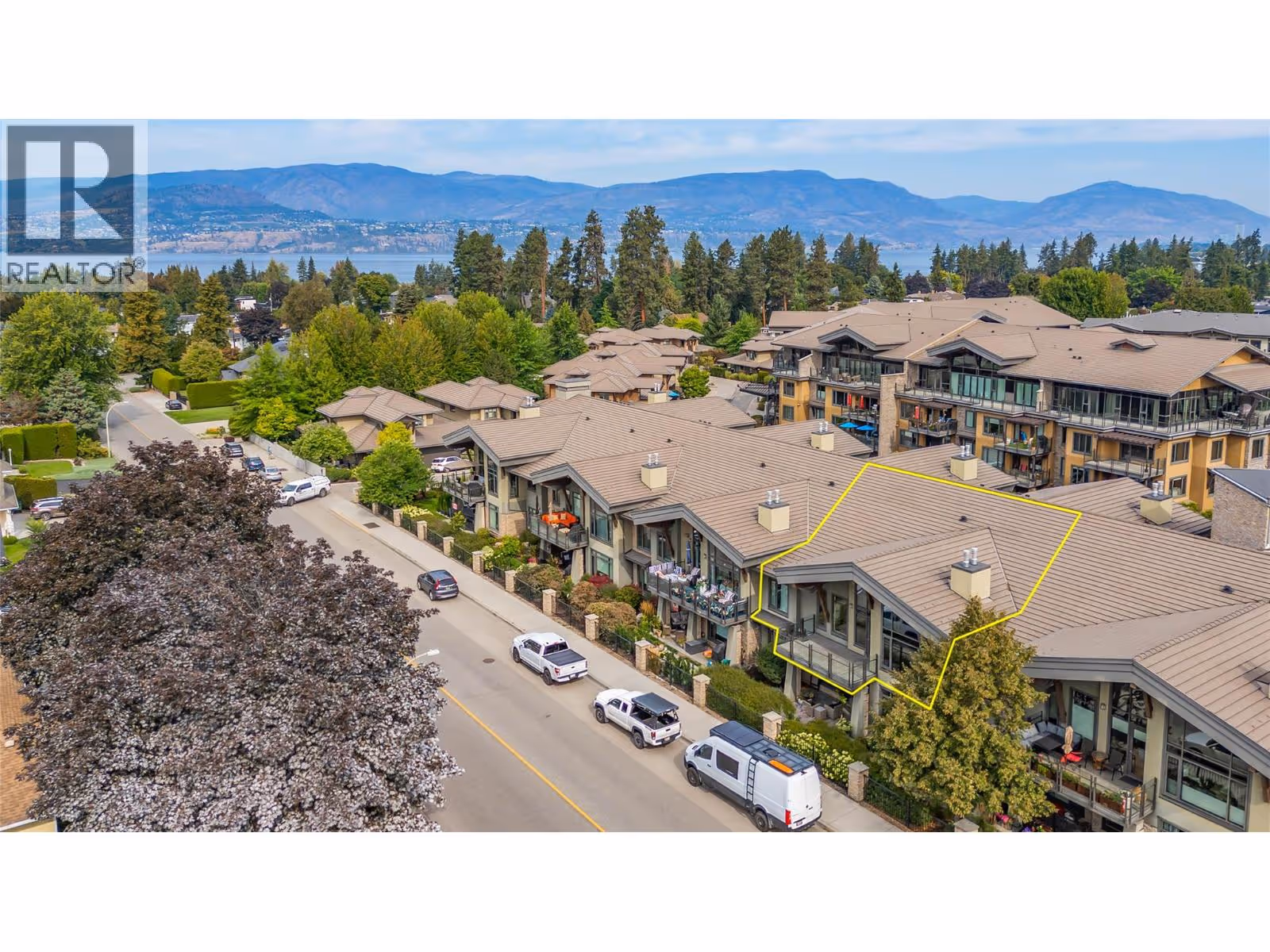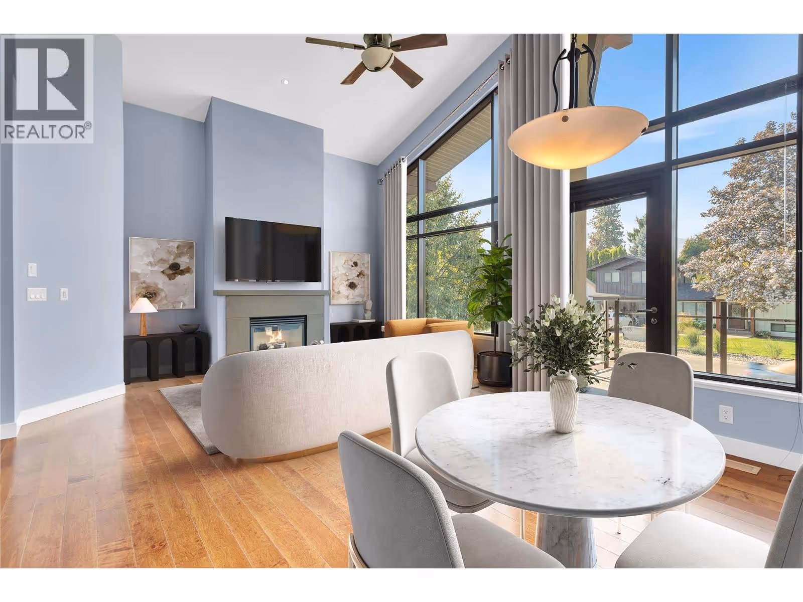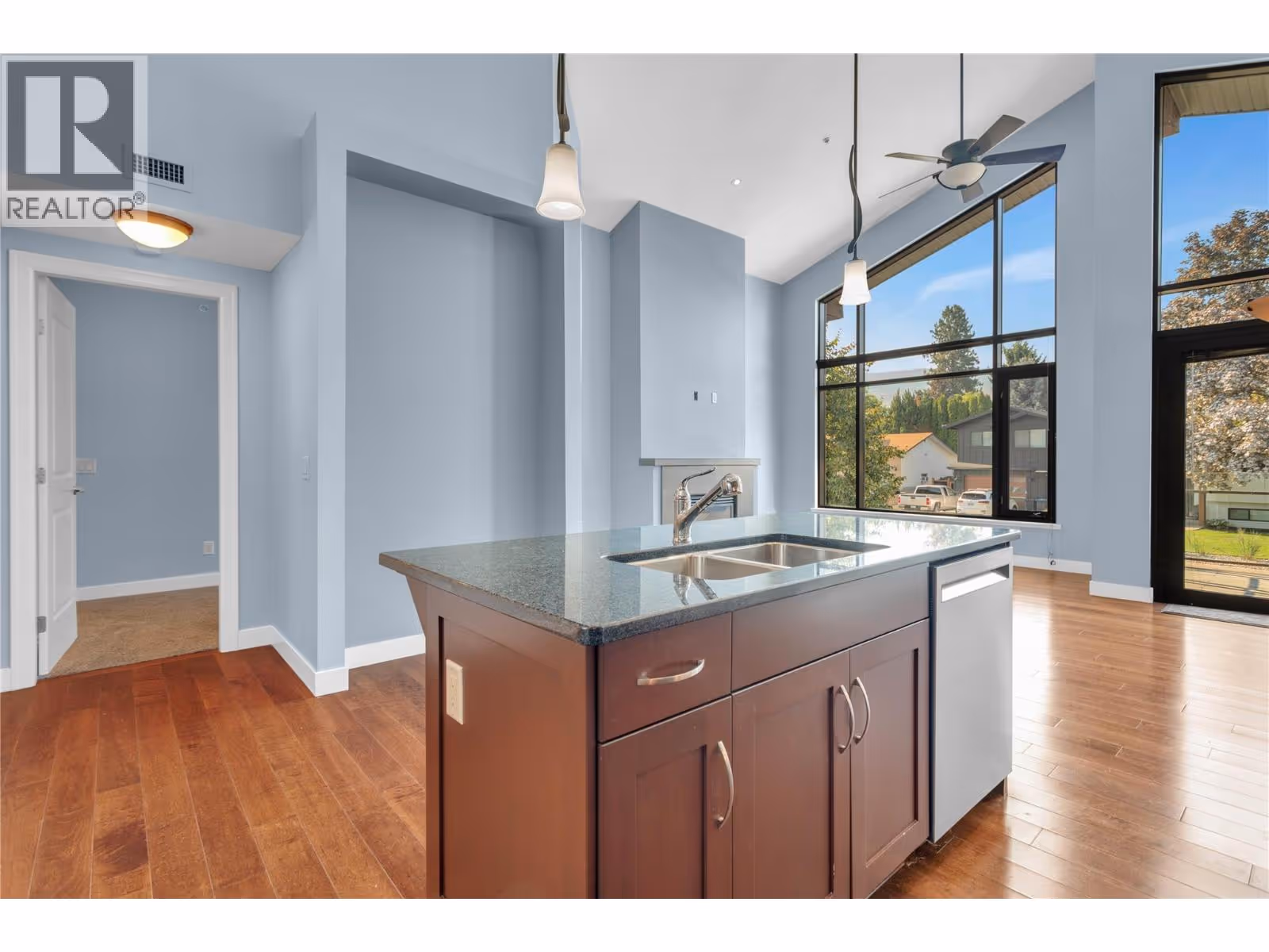 RARE OPPORTUNITY to own a TOP FLOOR executive condo in the sought after 'Southwind at Sarsons' community in the heart of the Lower Mission. TWO side x side PARKING STALLS included! This 2-Bedroom plus Den, 2-Bath home offers nearly 1,500 sq. ft. of bright open living space with soaring 18' vaulted ceilings and expansive south-facing windows that flood the home with natural light. Perfect for entertaining, the kitchen features a large island with granite counters, maple cabinetry, a gas stove, and flows seamlessly into the spacious living area with hardwood floors and a cozy gas fireplace. The primary suite includes a generous walk-in closet and a spa-inspired ensuite with double sinks, soaker tub and separate shower. A versatile flex area makes for the perfect den, home office or craft room. Strata fee includes environmentally friendly geothermal heating/cooling and first-class on site amenities include an indoor/outdoor pool, hot tub, fitness center and private residents lounge. Stunning landscaped grounds showcasing award-winning gardens and a beautiful water feature/pergola. Separate secured storage locker in parkade. One pet permitted <15"" from shoulder and max 12 kgs. Rentals allowed - 6 month minimum. Minutes to Sarsons Beach, Sunshine Market, Barn Owl Brewing, H2O Center, Mission Greenway, Michaelbrook Golf Course and world renowned Wineries! Experience Okanagan living at its finest! Move-In Ready! **Furnished photos have been virtually staged** (id:58842)