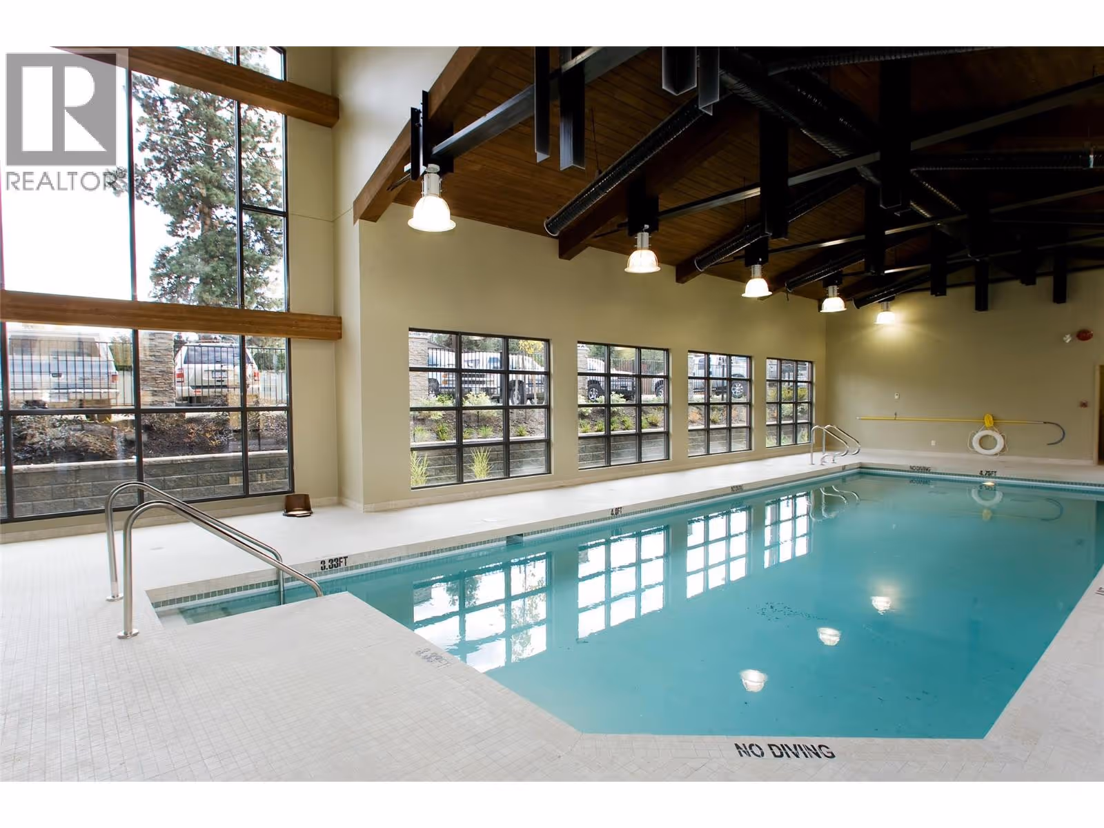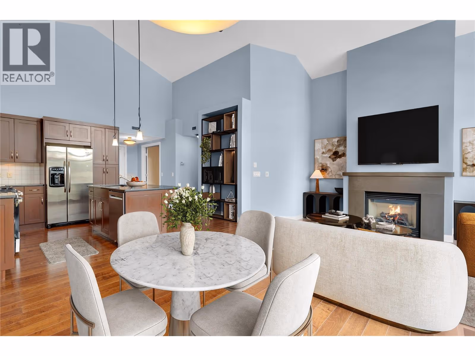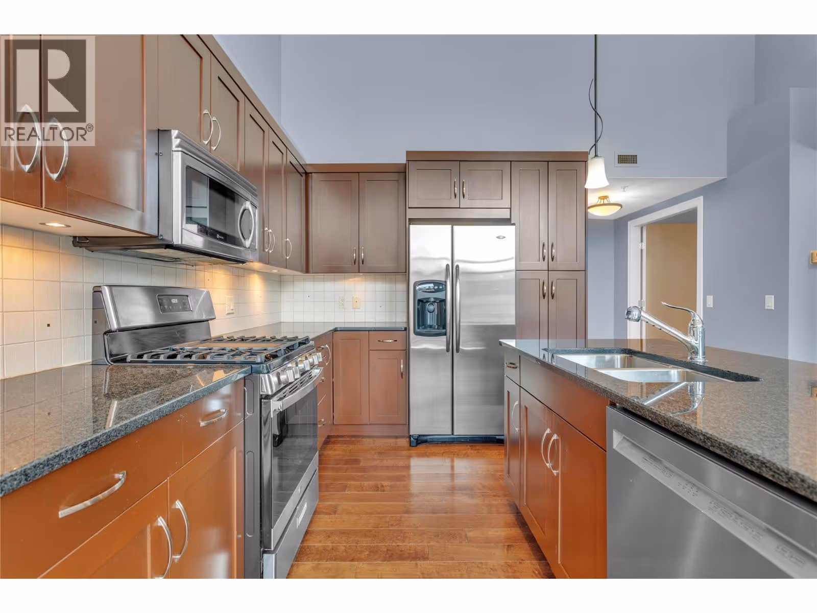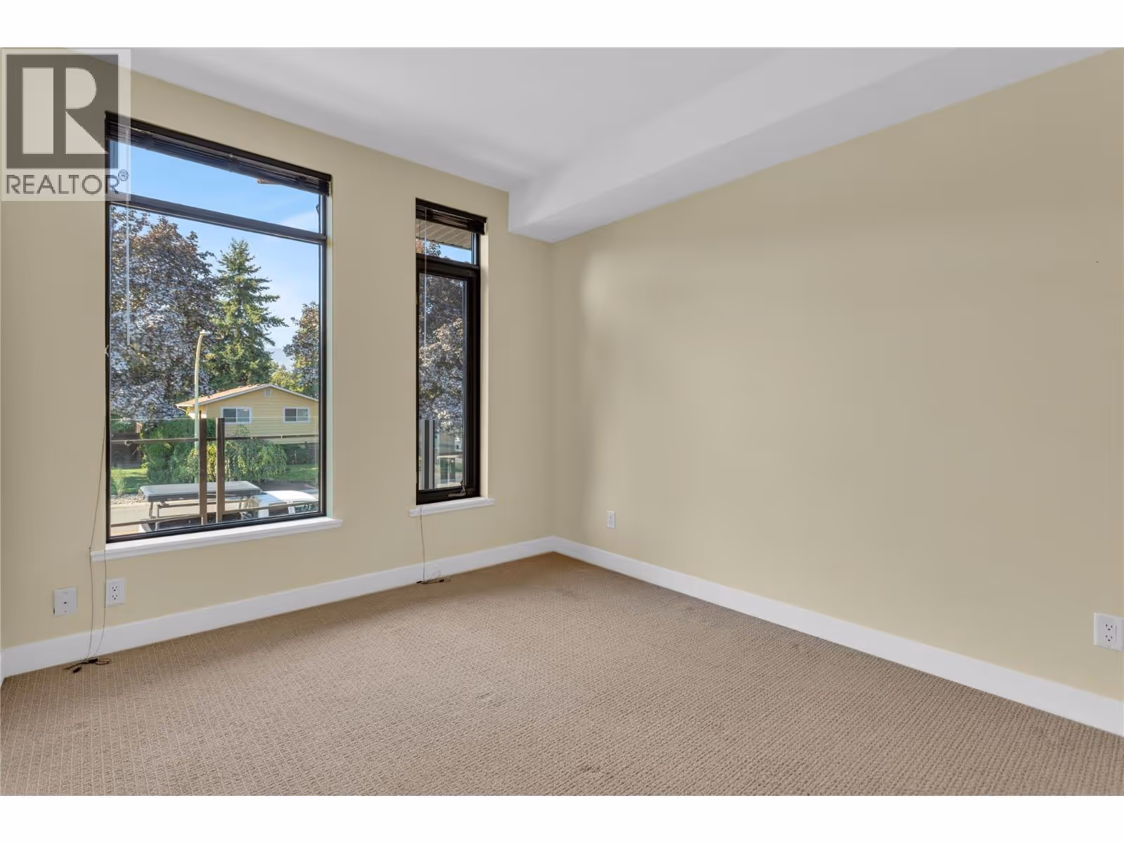 RARE OPPORTUNITY to own a TOP FLOOR executive condo in the sought after 'Southwind at Sarsons' community in the heart of the Lower Mission. TWO side x side PARKING STALLS included! This 2-Bedroom plus Den, 2-Bath home offers nearly 1,500 sq. ft. of bright open living space with soaring 18' vaulted ceilings and expansive south-facing windows that flood the home with natural light. Perfect for entertaining, the kitchen features a large island with granite counters, maple cabinetry, a gas stove, and flows seamlessly into the spacious living area with hardwood floors and a cozy gas fireplace. The primary suite includes a generous walk-in closet and a spa-inspired ensuite with double sinks, soaker tub and separate shower. A versatile flex area makes for the perfect den, home office or craft room. Strata fee includes environmentally friendly geothermal heating/cooling and first-class on site amenities include an indoor/outdoor pool, hot tub, fitness center and private residents lounge. Stunning landscaped grounds showcasing award-winning gardens and a beautiful water feature/pergola. Separate secured storage locker in parkade. One pet permitted <15"" from shoulder and max 12 kgs. Rentals allowed - 6 month minimum. Minutes to Sarsons Beach, Sunshine Market, Barn Owl Brewing, H2O Center, Mission Greenway, Michaelbrook Golf Course and world renowned Wineries! Experience Okanagan living at its finest! Move-In Ready! **Furnished photos have been virtually staged** (id:58842)