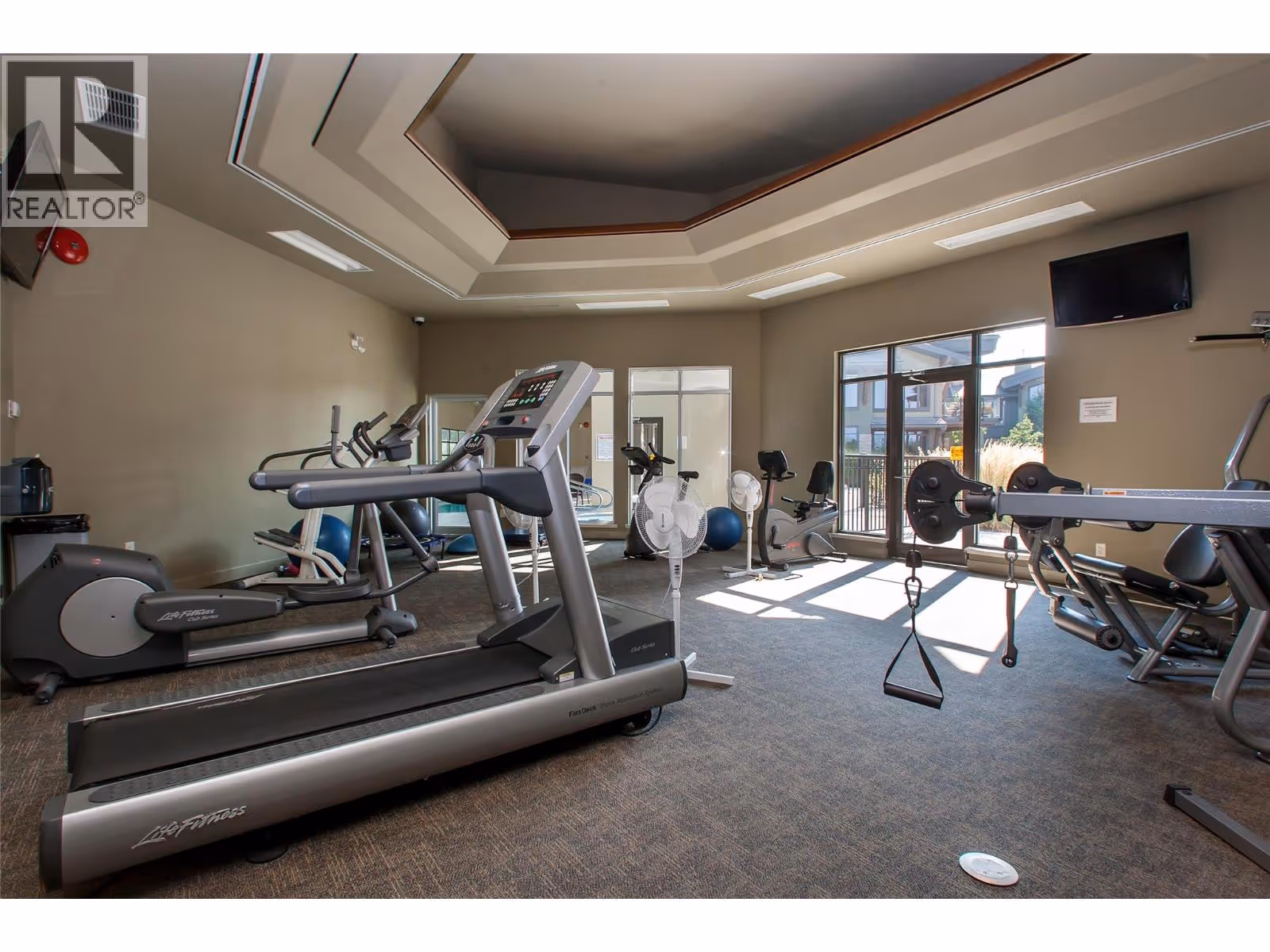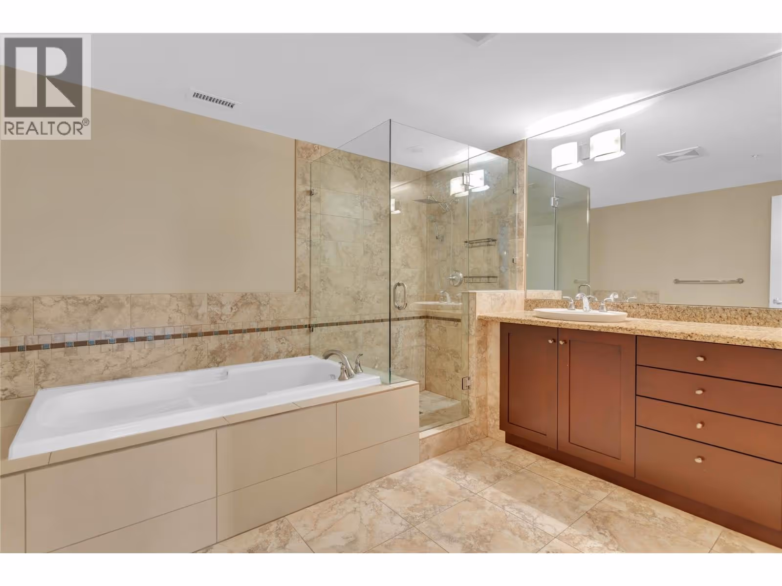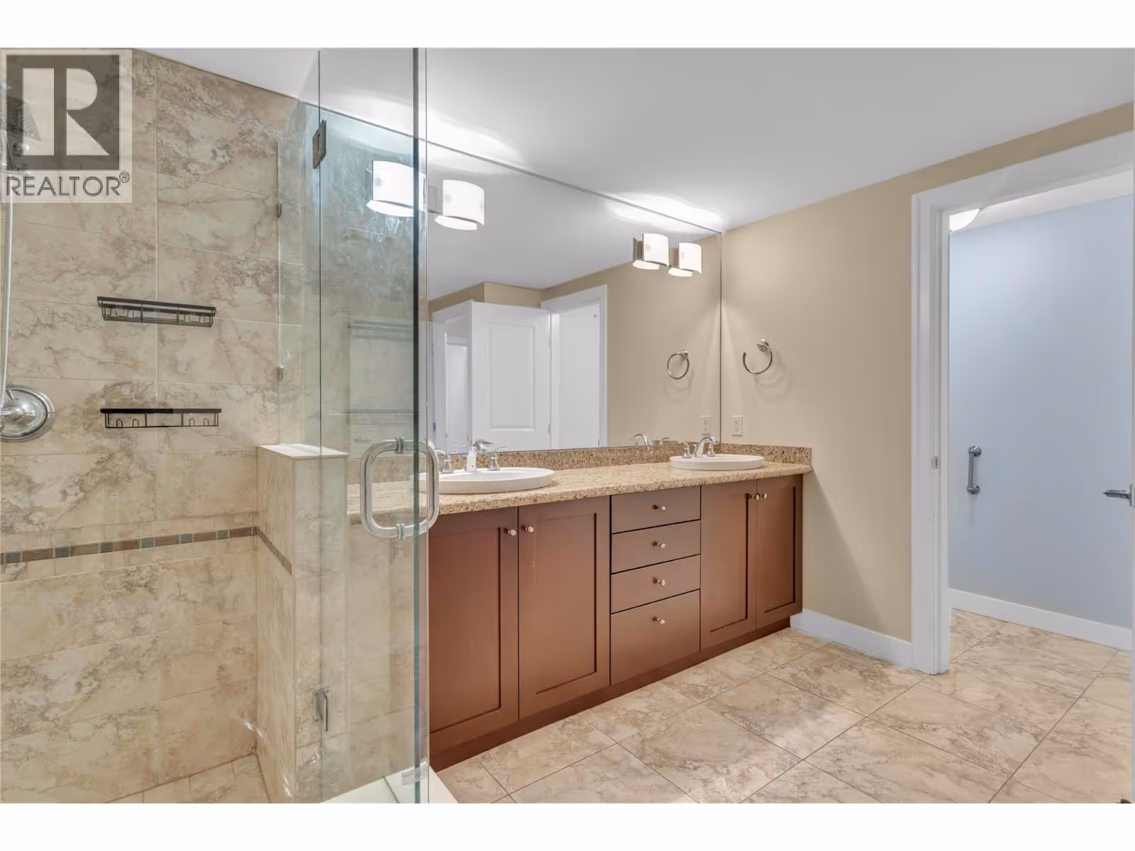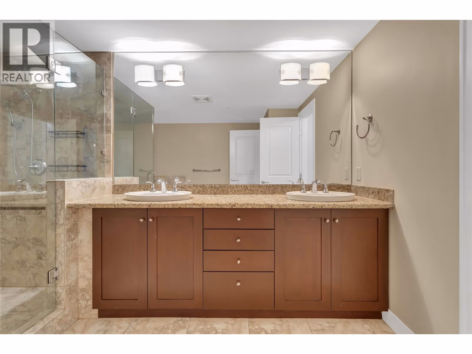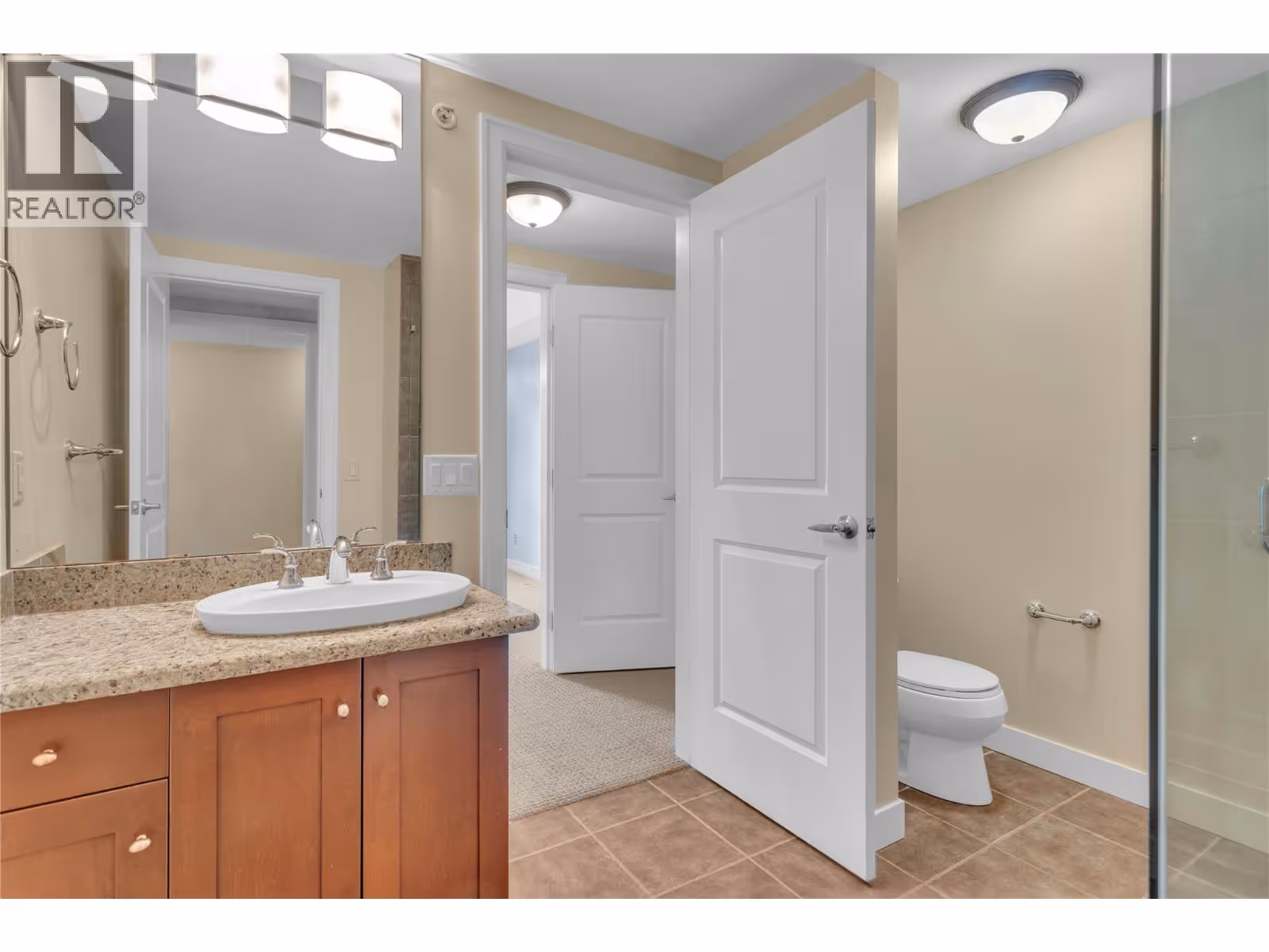 RARE OPPORTUNITY to own a TOP FLOOR executive condo in the sought after 'Southwind at Sarsons' community in the heart of the Lower Mission. TWO side x side PARKING STALLS included! This 2-Bedroom plus Den, 2-Bath home offers nearly 1,500 sq. ft. of bright open living space with soaring 18' vaulted ceilings and expansive south-facing windows that flood the home with natural light. Perfect for entertaining, the kitchen features a large island with granite counters, maple cabinetry, a gas stove, and flows seamlessly into the spacious living area with hardwood floors and a cozy gas fireplace. The primary suite includes a generous walk-in closet and a spa-inspired ensuite with double sinks, soaker tub and separate shower. A versatile flex area makes for the perfect den, home office or craft room. Strata fee includes environmentally friendly geothermal heating/cooling and first-class on site amenities include an indoor/outdoor pool, hot tub, fitness center and private residents lounge. Stunning landscaped grounds showcasing award-winning gardens and a beautiful water feature/pergola. Separate secured storage locker in parkade. One pet permitted <15"" from shoulder and max 12 kgs. Rentals allowed - 6 month minimum. Minutes to Sarsons Beach, Sunshine Market, Barn Owl Brewing, H2O Center, Mission Greenway, Michaelbrook Golf Course and world renowned Wineries! Experience Okanagan living at its finest! Move-In Ready! **Furnished photos have been virtually staged** (id:58842)
