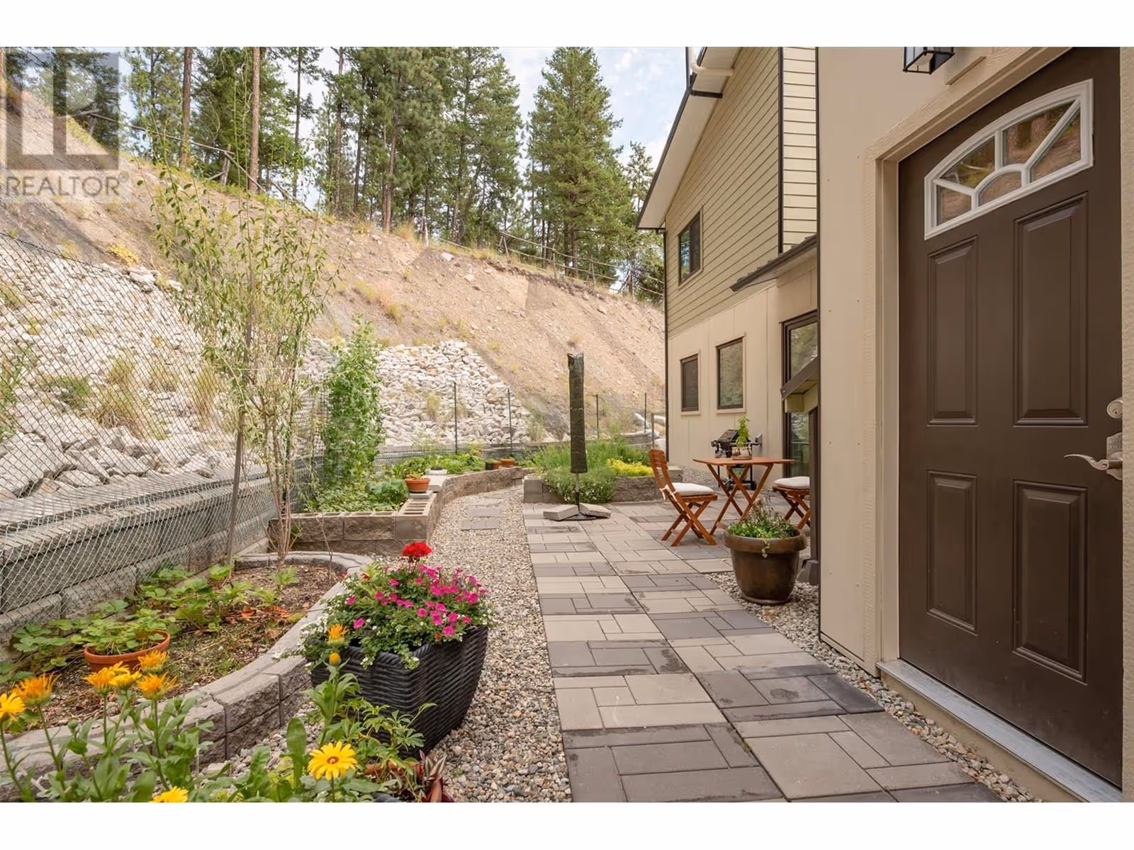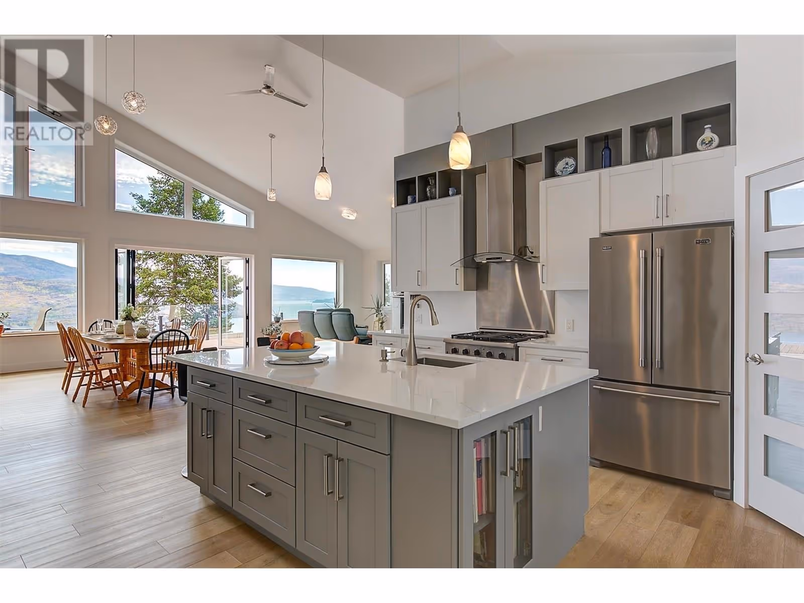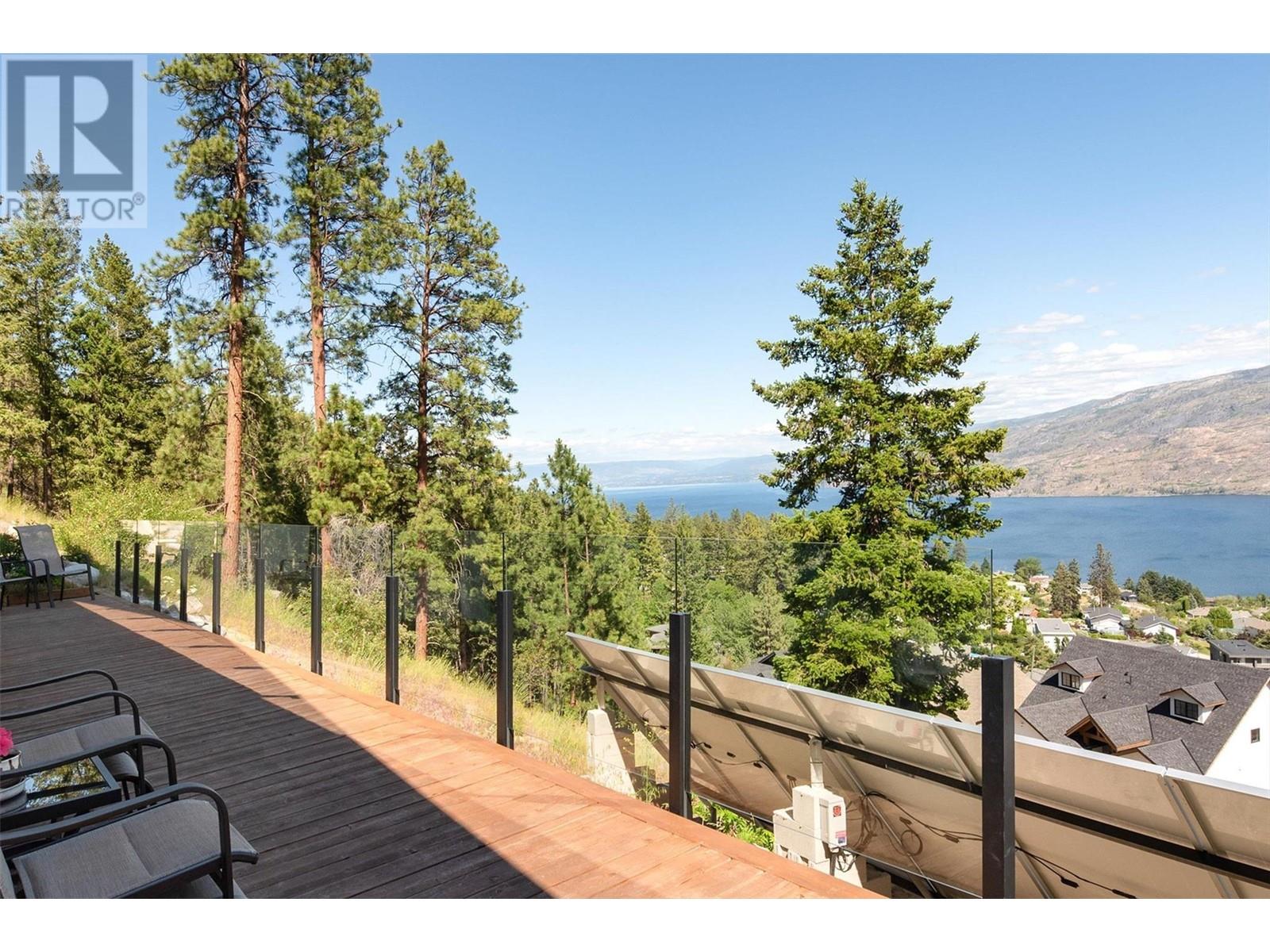 This 2019 owner-built home truly has the WOW factor and ticks all the right boxes. Perched on the hillside with stunning panoramic views of Okanagan Lake and the mountains, you can enjoy the breathtaking scenery from the spacious front deck or from inside the home. The bright, flexible, open-concept floor plan features soaring vaulted ceiling, a generous living room, and seamless flow into the dining area and beautifully appointed chef’s kitchen, complete with stainless steel appliances, quartz countertops, and a large island—allowing you to organize and entertain your way. Three generously sized bedrooms, each with walk-in closets and private access to modern bathrooms, offer exceptional space and comfort for family or guests. Step outside to relax in the peaceful garden patio surrounded by nature or explore the nearby trail system, providing a quiet, private, and serene lifestyle. Adding versatility, the home includes a separate one-bedroom legal suite with its own entrance—ideal for extended family, guests, or rental income. This high-performance home was owner-constructed to exceed the Building Code and is engineered to be fire-smart, wind-resistant, and earthquake-resistant for long-term protection and peace of mind. Year-round comfort is provided by the super high-efficiency design, radiant water heating system, and ductless split air conditioning units. The 10-kilowatt solar panel system, natural gas generator, and battery backup system support both sustainability and lower utility costs. For added convenience, the attached double garage features a Level 2 EV charger. This beautifully maintained Peachland home is the perfect blend of luxury, efficiency, and Okanagan lifestyle—move-in ready and not to be missed! (id:58842)