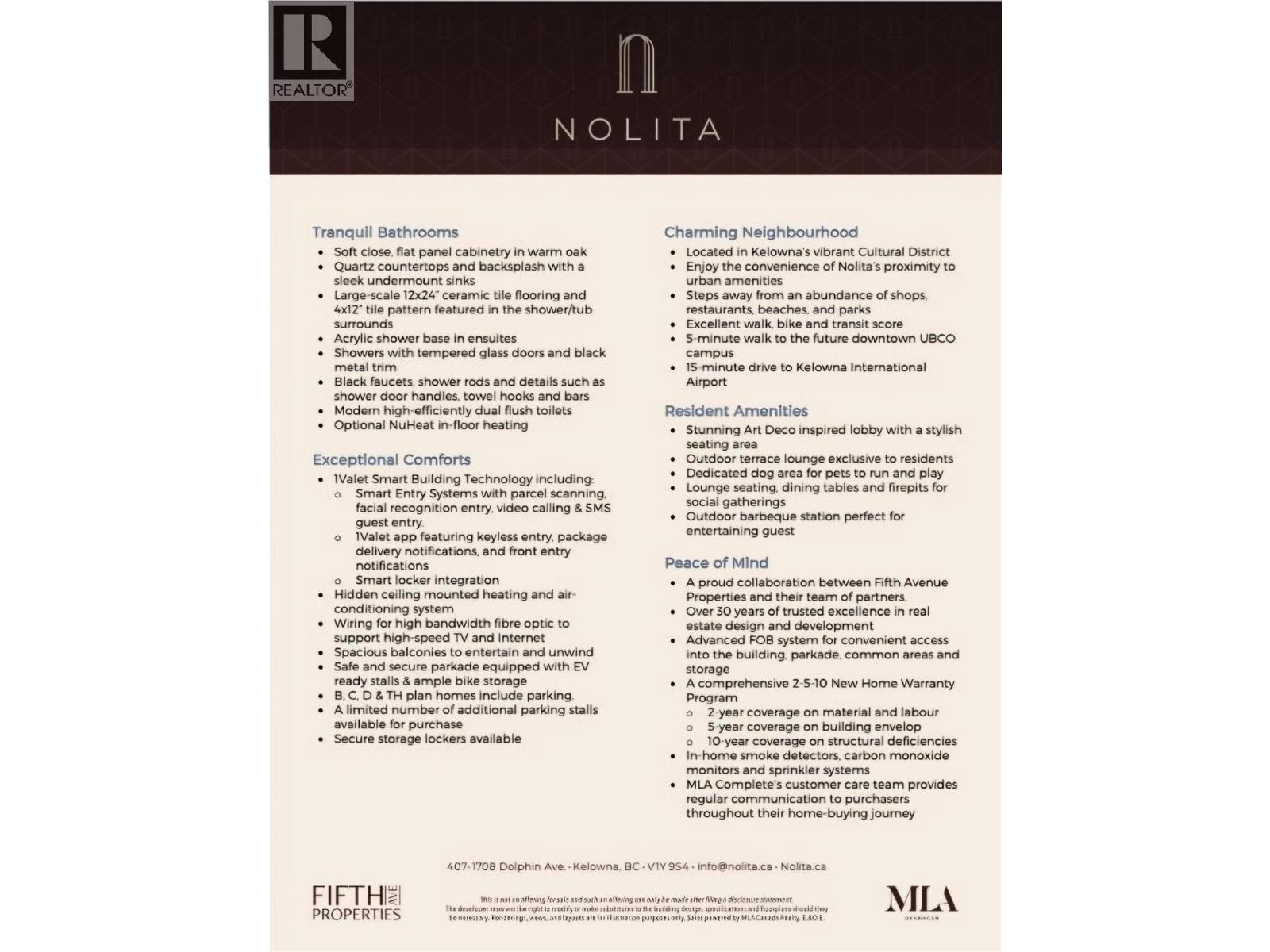 mmerse yourself in the luxury of upscale living in Kelowna's vibrant brewery and cultural district. Nestled in a rapidly evolving neighborhood with industrial chic charm, this junior one-bedroom residence masterfully blends sophistication and practicality. Upon entering, discover sleek white oak laminate flooring, complemented by premium soft-close cabinetry and modern roller shades. Thoughtfully designed, the unit features in-suite laundry, centralized heating and cooling, ensuring year-round comfort. Unwind on the expansive 224 sq. ft. patio, seamlessly connected to the communal Terrace Lounge, boasting cozy seating, fire tables, barbeque, and pet-friendly amenities. Nolita redefines urban living. Enhanced by 1Valet's concierge services, cutting-edge smart technology, and comprehensive security, this residence offers a refined lifestyle. Complete with underground parking and storage, also just a short walk to Kelowna's best beaches, the valley's rail Trail, Knox Mountain and the well known rail trail. (id:58842)