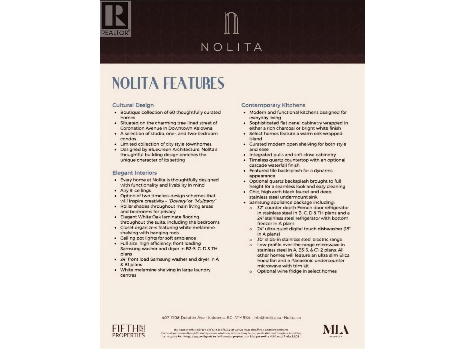 mmerse yourself in the luxury of upscale living in Kelowna's vibrant brewery and cultural district. Nestled in a rapidly evolving neighborhood with industrial chic charm, this junior one-bedroom residence masterfully blends sophistication and practicality. Upon entering, discover sleek white oak laminate flooring, complemented by premium soft-close cabinetry and modern roller shades. Thoughtfully designed, the unit features in-suite laundry, centralized heating and cooling, ensuring year-round comfort. Unwind on the expansive 224 sq. ft. patio, seamlessly connected to the communal Terrace Lounge, boasting cozy seating, fire tables, barbeque, and pet-friendly amenities. Nolita redefines urban living. Enhanced by 1Valet's concierge services, cutting-edge smart technology, and comprehensive security, this residence offers a refined lifestyle. Complete with underground parking and storage, also just a short walk to Kelowna's best beaches, the valley's rail Trail, Knox Mountain and the well known rail trail. (id:58842)
