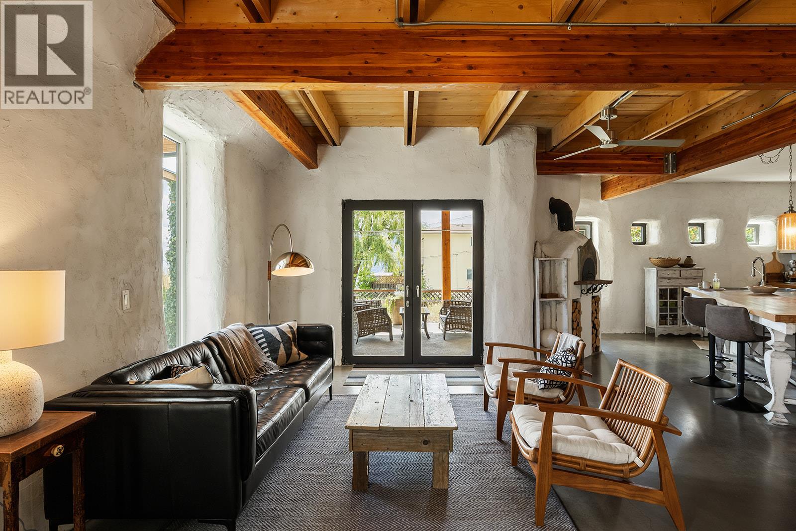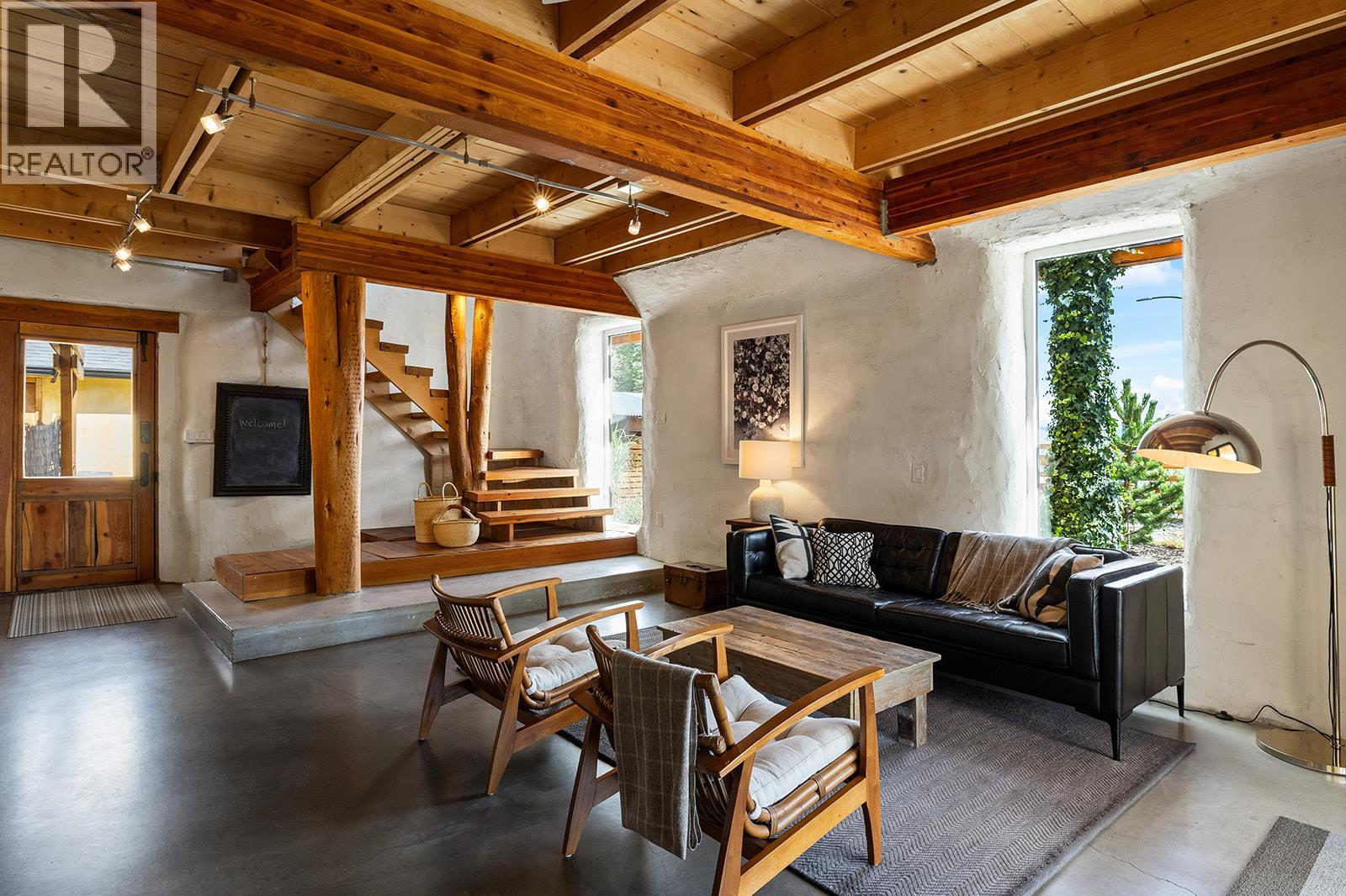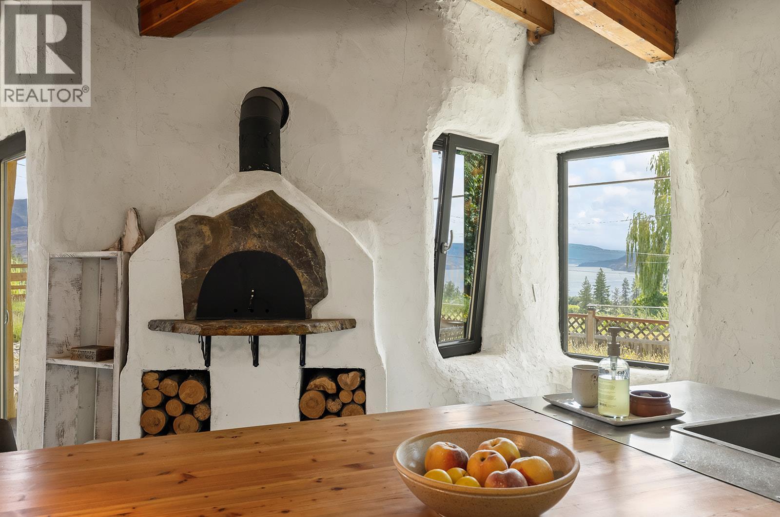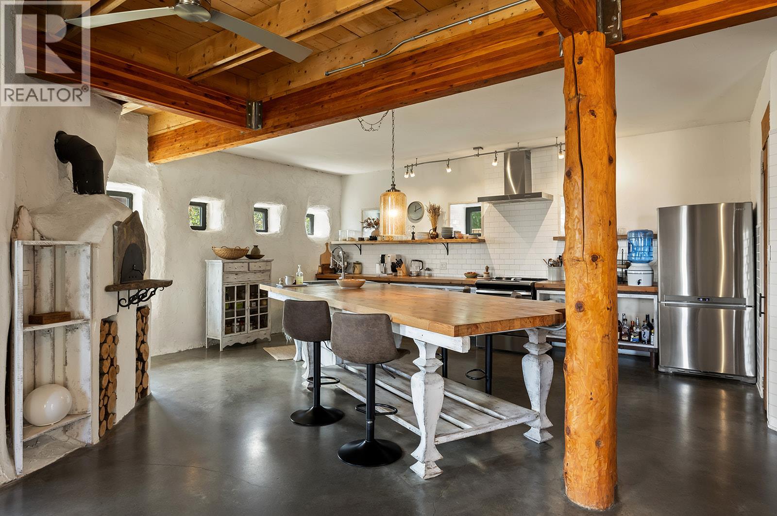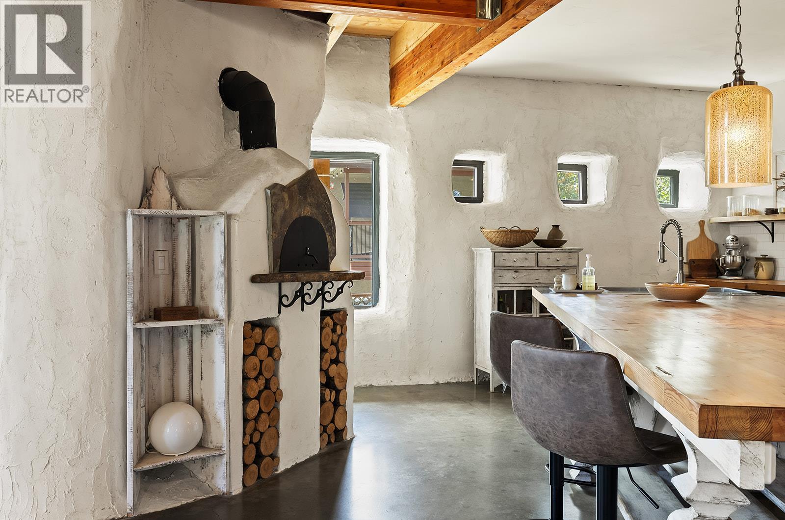 This one of a kind timber-frame straw-bale home blends architectural beauty with exceptional energy efficiency. Thoughtfully designed and extensively upgraded, this residence delivers remarkable heat retention and year round comfort with extremely low operating costs, averaging just three cords of wood annually for heating. The home features a Blaze King wood stove with long burn times, hydronic in floor heating on the main level, dual heat pumps for heating and cooling, and high performance tilt turn Innotech windows and doors. The ICF concrete slab, 18 inch straw bale walls, and reclaimed wood flooring naturally regulate temperature throughout the home, with upper level floors back beveled to allow warm air circulation. The kitchen showcases a wood fired Forno pizza oven, massive eat up island and apron sink, while the spa inspired main bathroom offers a 2025 tiled walk in shower, bidet, and in floor heat. Outdoors you will find a large covered patio, solar heated saltwater lap pool, veranda, newer fencing with custom metal caps, and a durable metal accented exterior. Major updates include a 2018 roof and eavestroughs, 2019 Duradeck upper deck, 2024 heat pump, and sewer brought onto the property with connection at the lot line. The property may support a future double garage with carriage house, buyer to verify. Built by the original owner with a passion for sustainable living, this is a rare opportunity to own a highly efficient and beautifully crafted home. (id:58842)