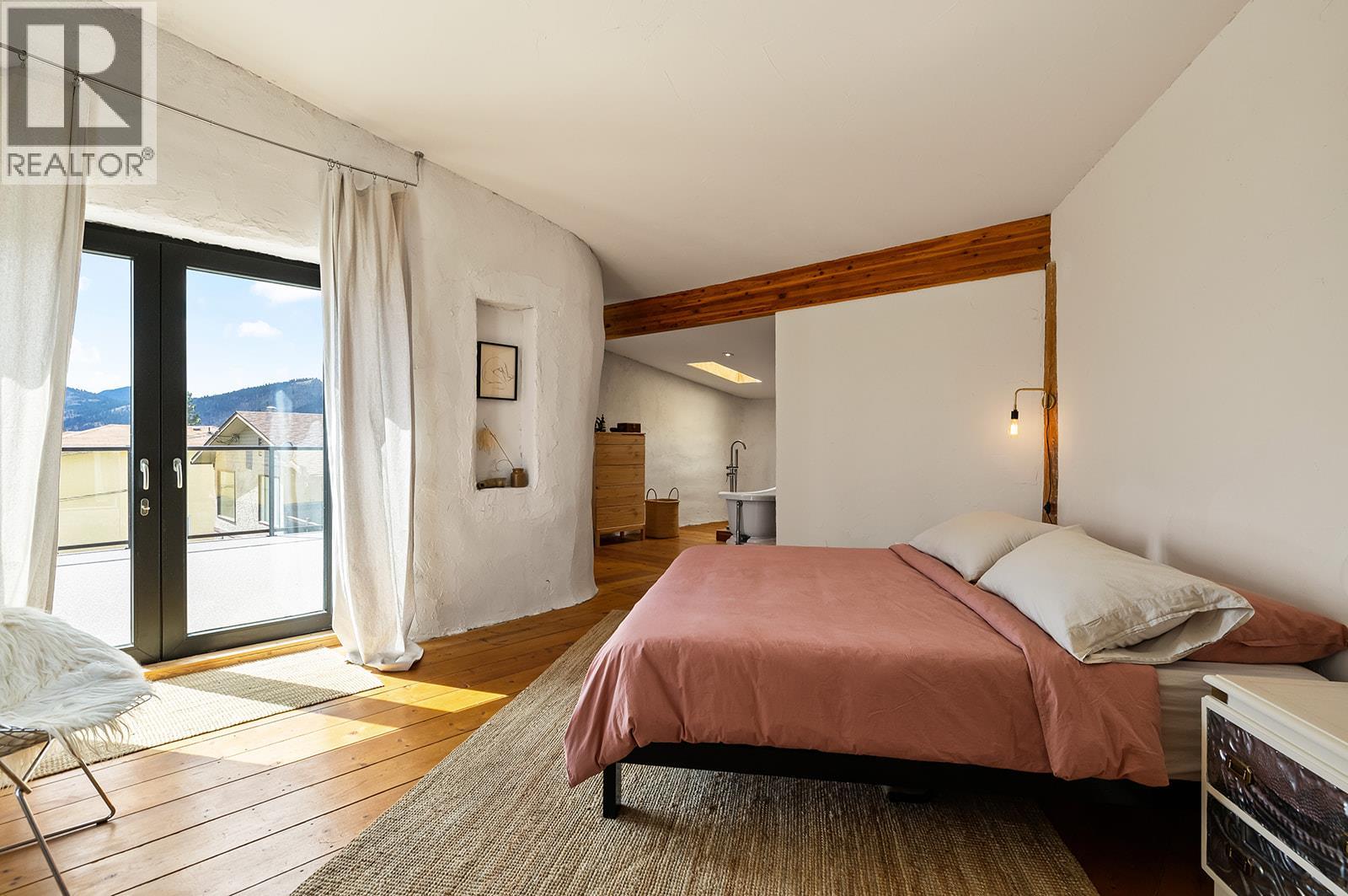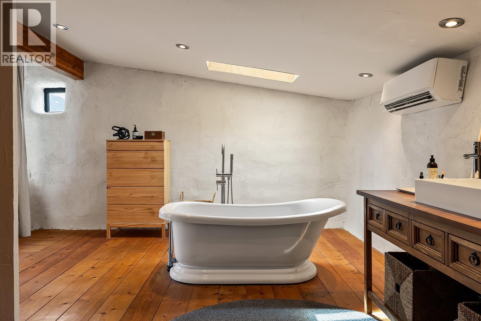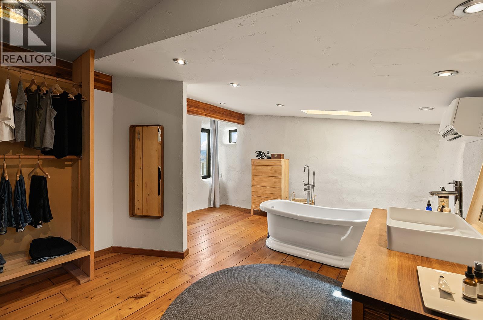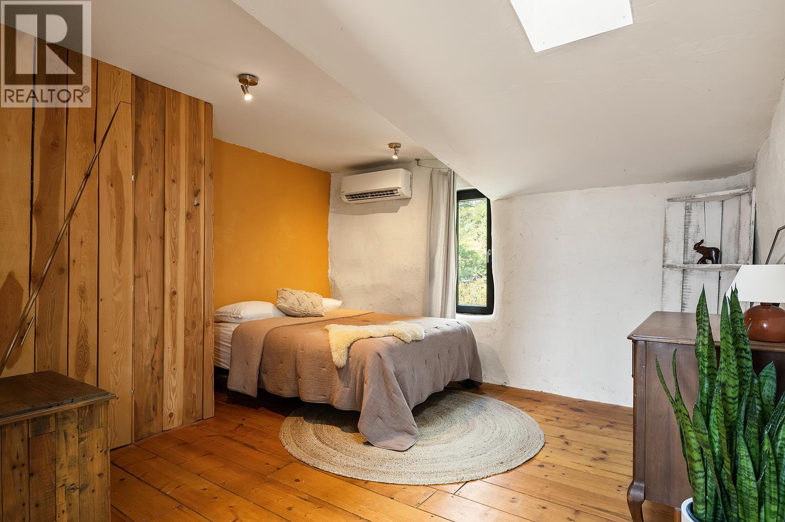 This one of a kind timber-frame straw-bale home blends architectural beauty with exceptional energy efficiency. Thoughtfully designed and extensively upgraded, this residence delivers remarkable heat retention and year round comfort with extremely low operating costs, averaging just three cords of wood annually for heating. The home features a Blaze King wood stove with long burn times, hydronic in floor heating on the main level, dual heat pumps for heating and cooling, and high performance tilt turn Innotech windows and doors. The ICF concrete slab, 18 inch straw bale walls, and reclaimed wood flooring naturally regulate temperature throughout the home, with upper level floors back beveled to allow warm air circulation. The kitchen showcases a wood fired Forno pizza oven, massive eat up island and apron sink, while the spa inspired main bathroom offers a 2025 tiled walk in shower, bidet, and in floor heat. Outdoors you will find a large covered patio, solar heated saltwater lap pool, veranda, newer fencing with custom metal caps, and a durable metal accented exterior. Major updates include a 2018 roof and eavestroughs, 2019 Duradeck upper deck, 2024 heat pump, and sewer brought onto the property with connection at the lot line. The property may support a future double garage with carriage house, buyer to verify. Built by the original owner with a passion for sustainable living, this is a rare opportunity to own a highly efficient and beautifully crafted home. (id:58842)