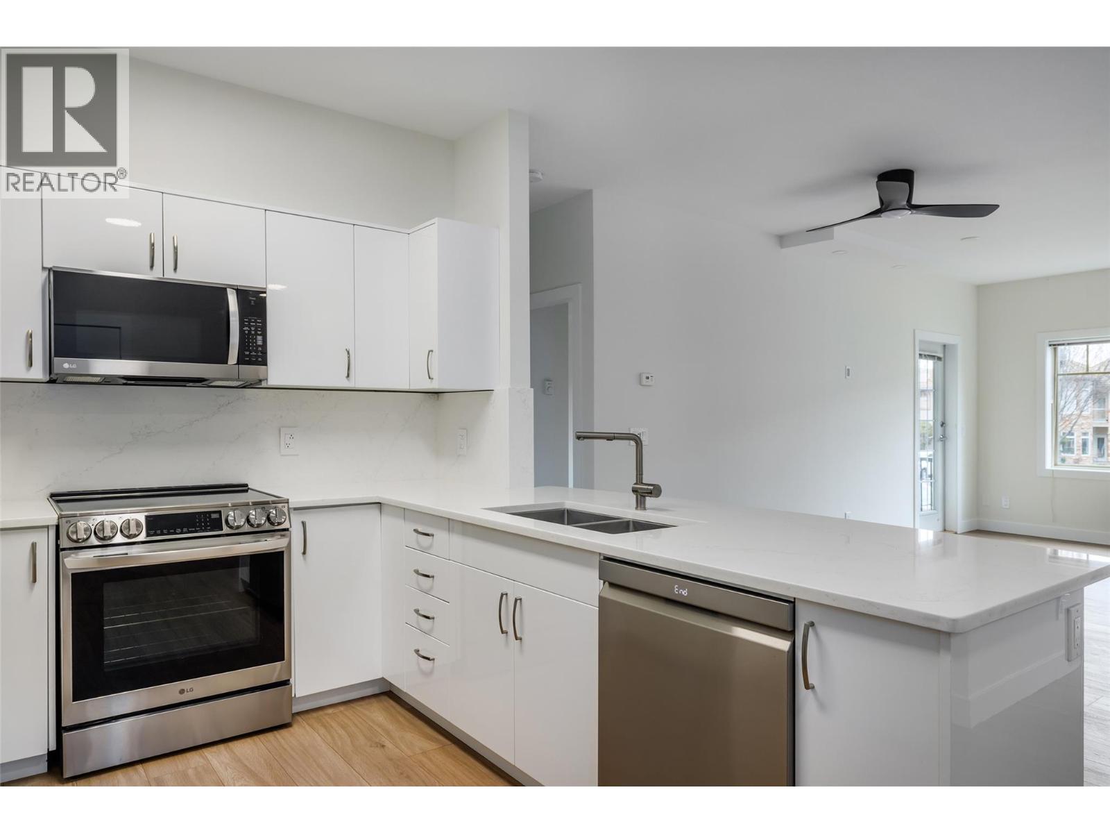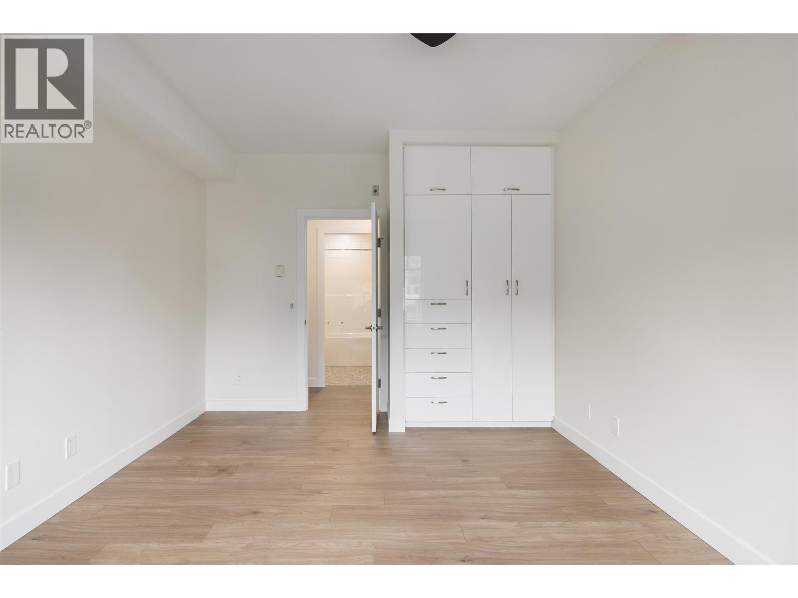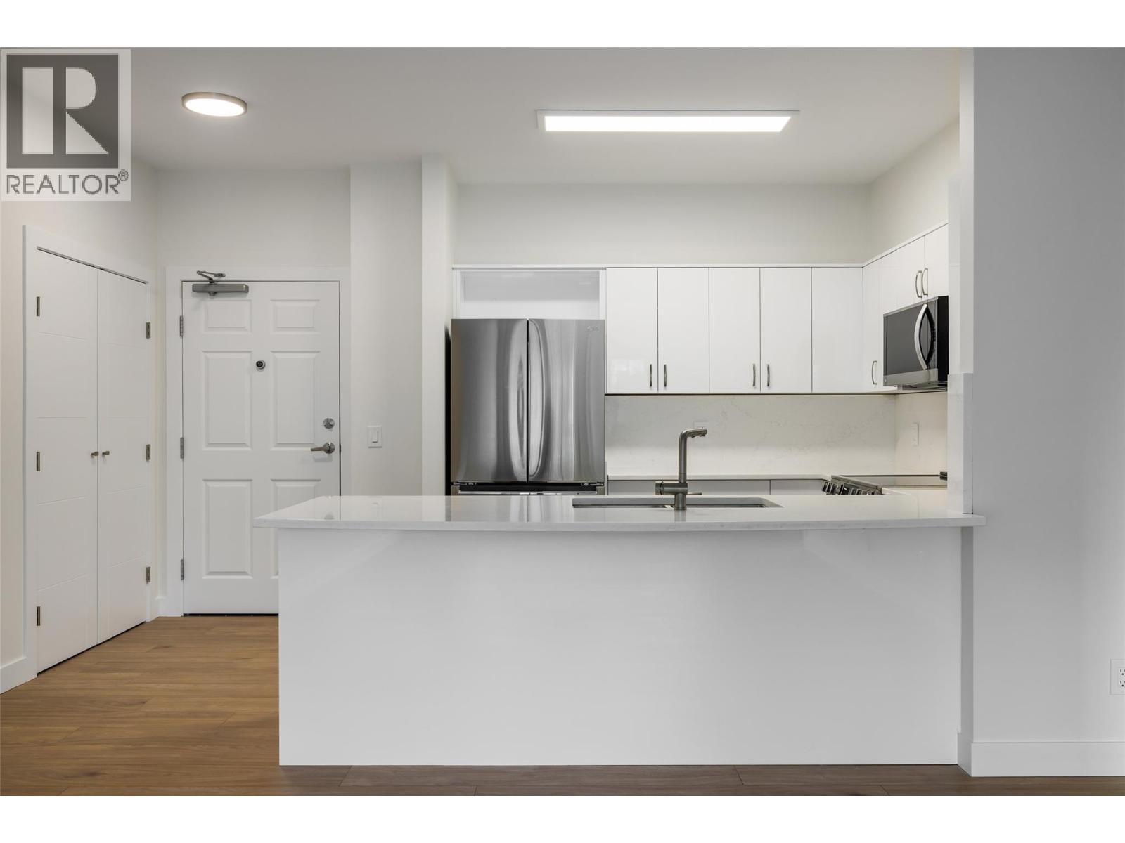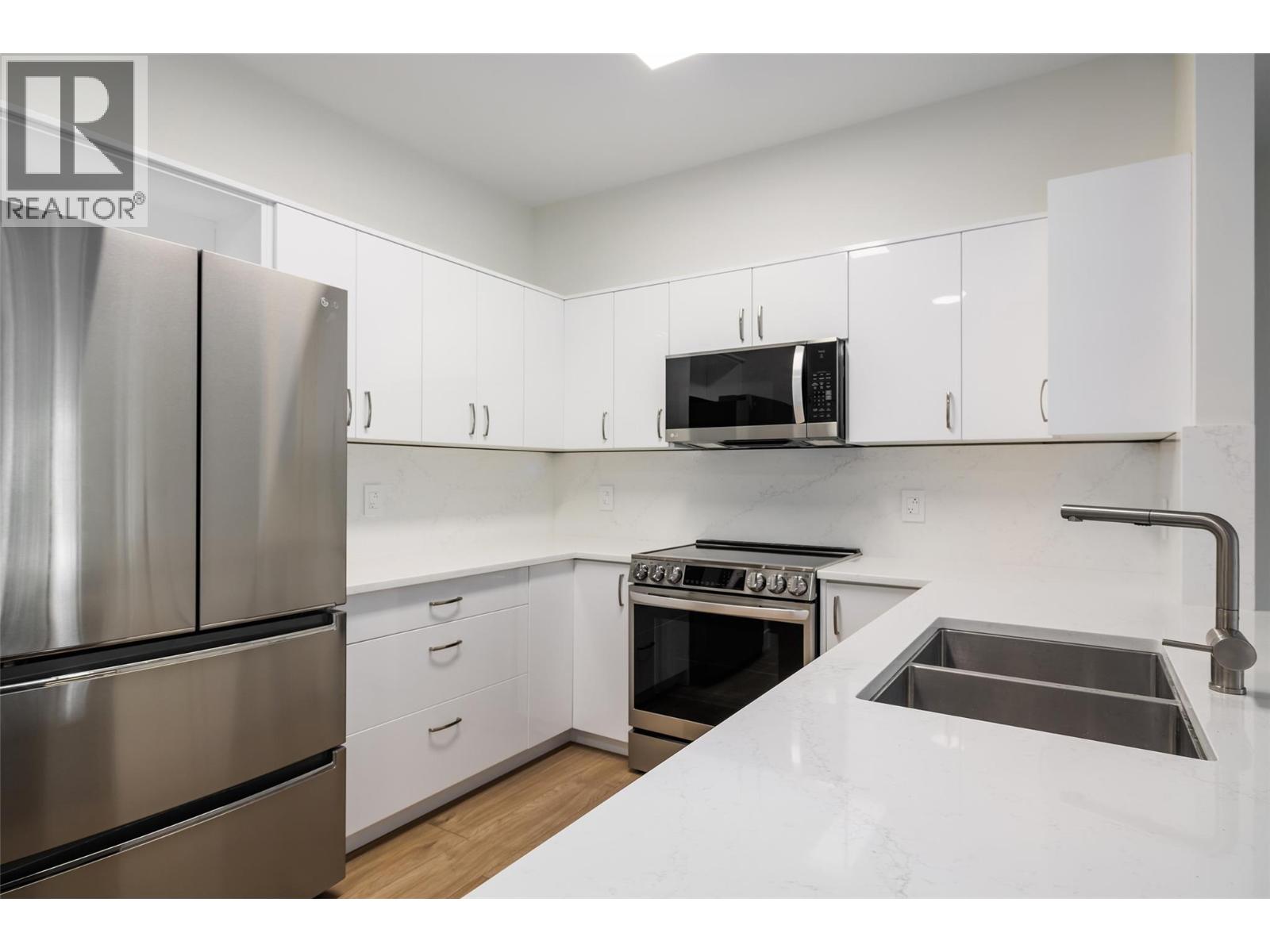 Beautifully renovated from floor to ceiling nothing untouched! 2 bed, 2 bath residence just steps from the shoreline in Kelowna’s desirable Lower Mission. Moments from Bluebird Beach Park, coffee shops, transit, H2O Adventure + Fitness Centre. This bright home offers effortless Okanagan living in a boutique 26-unit building. Interior showcases wide-plank premium laminate flooring, fresh paint throughout including ceilings, new interior doors, modern hardware and updated lighting. The completely redesigned kitchen by Dream Easy Kitchens features high gloss white cabinetry with soft-close hardware, quartz countertops, a peninsula with seating for four and a full suite of LG appliances including induction range. The open-concept living and dining area is filled with natural light and extends to a covered balcony overlooking landscaped gardens, creating a welcoming space to relax or entertain. The spacious primary retreat features custom built-in wardrobes and a beautifully renovated spa-inspired ensuite with heated natural stone floors, quartz vanity and a fully tiled walk-in shower with rainfall fixture and etched glass enclosure. A second bedroom with custom cabinetry and a refreshed 4-piece bath (2026) offers comfortable space for guests or a home office. In-suite laundry, large entry pantry/storage, baseboard heating with A/C unit, secure parking and storage. A turnkey opportunity to enjoy a fully updated home just moments from the lake. (id:58842)