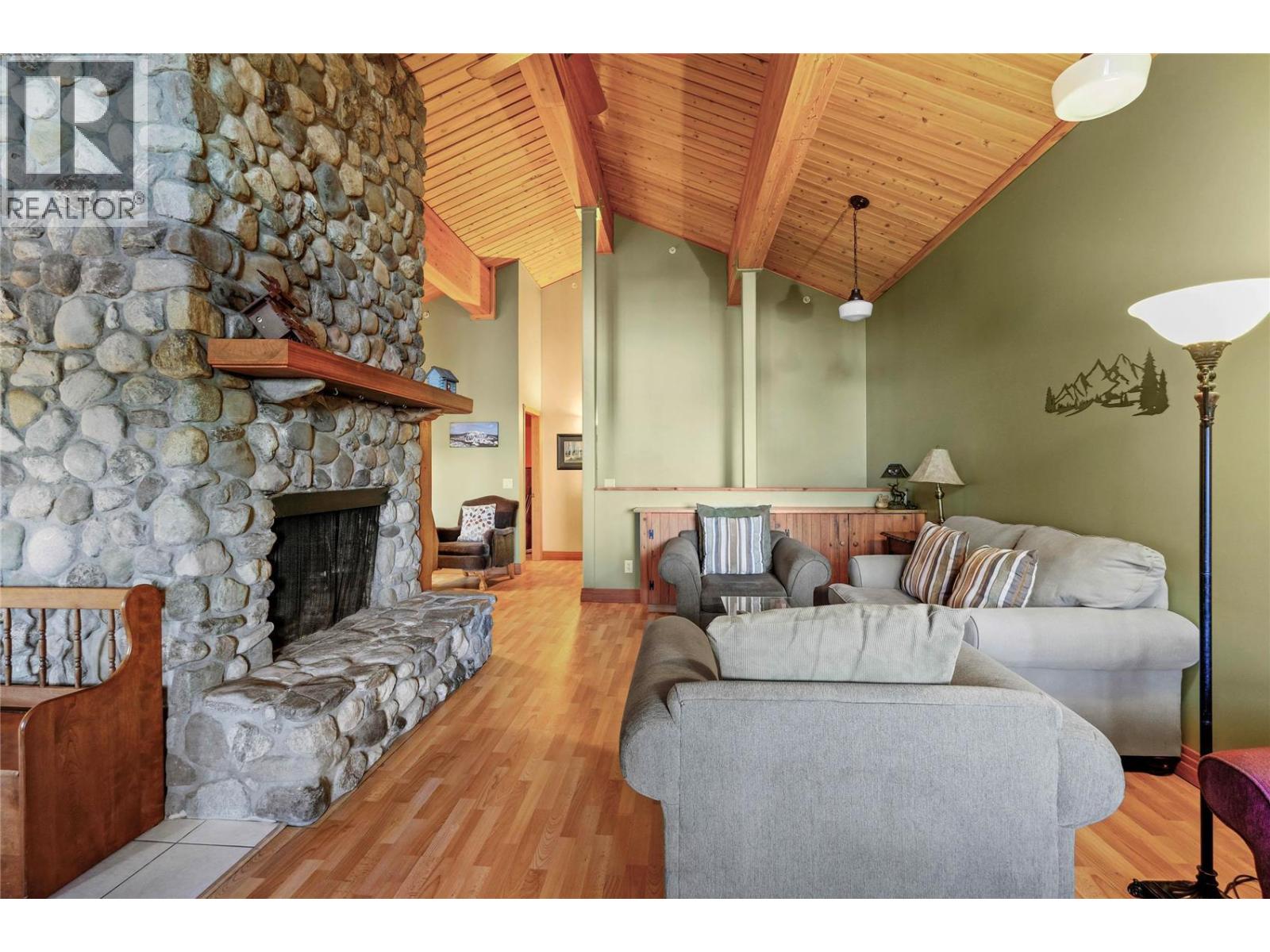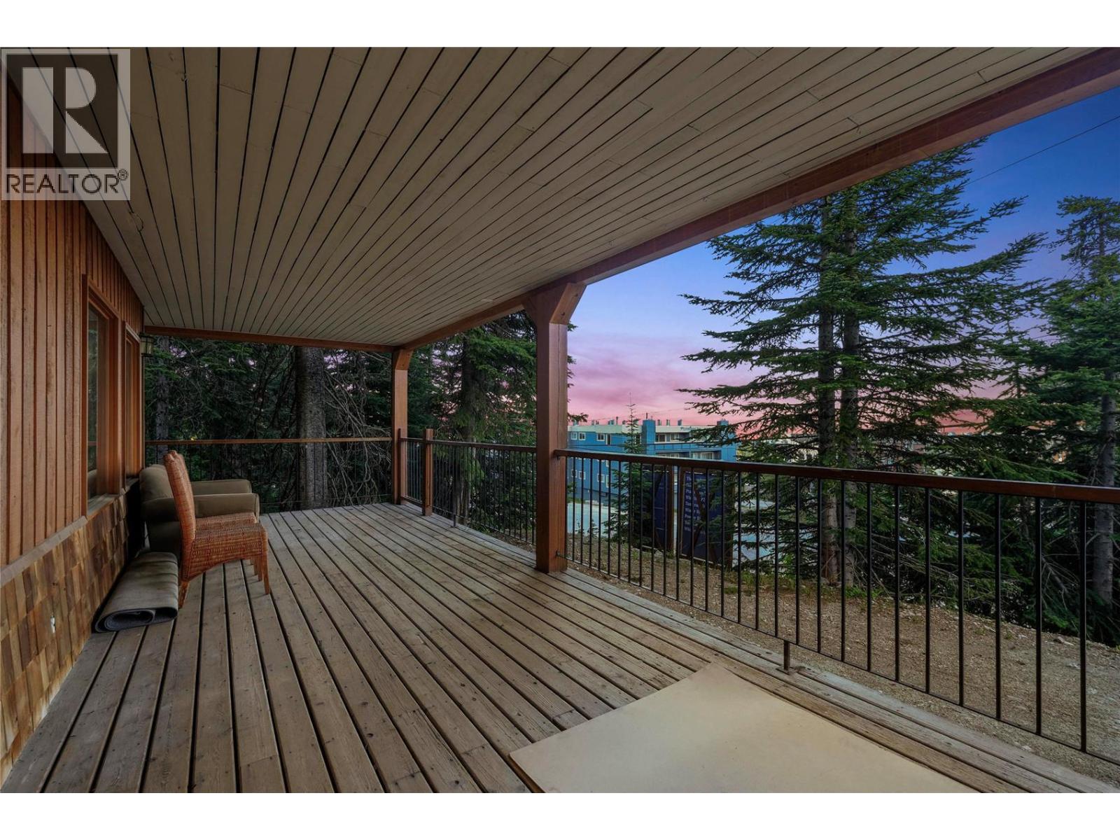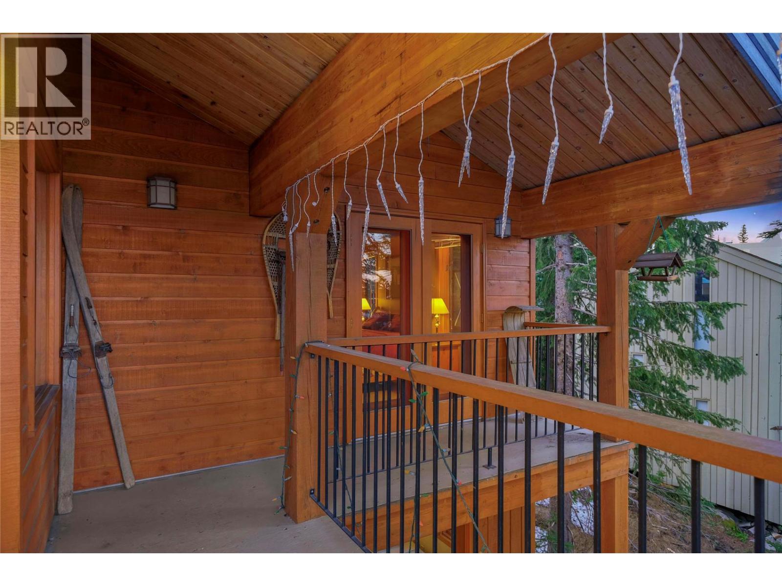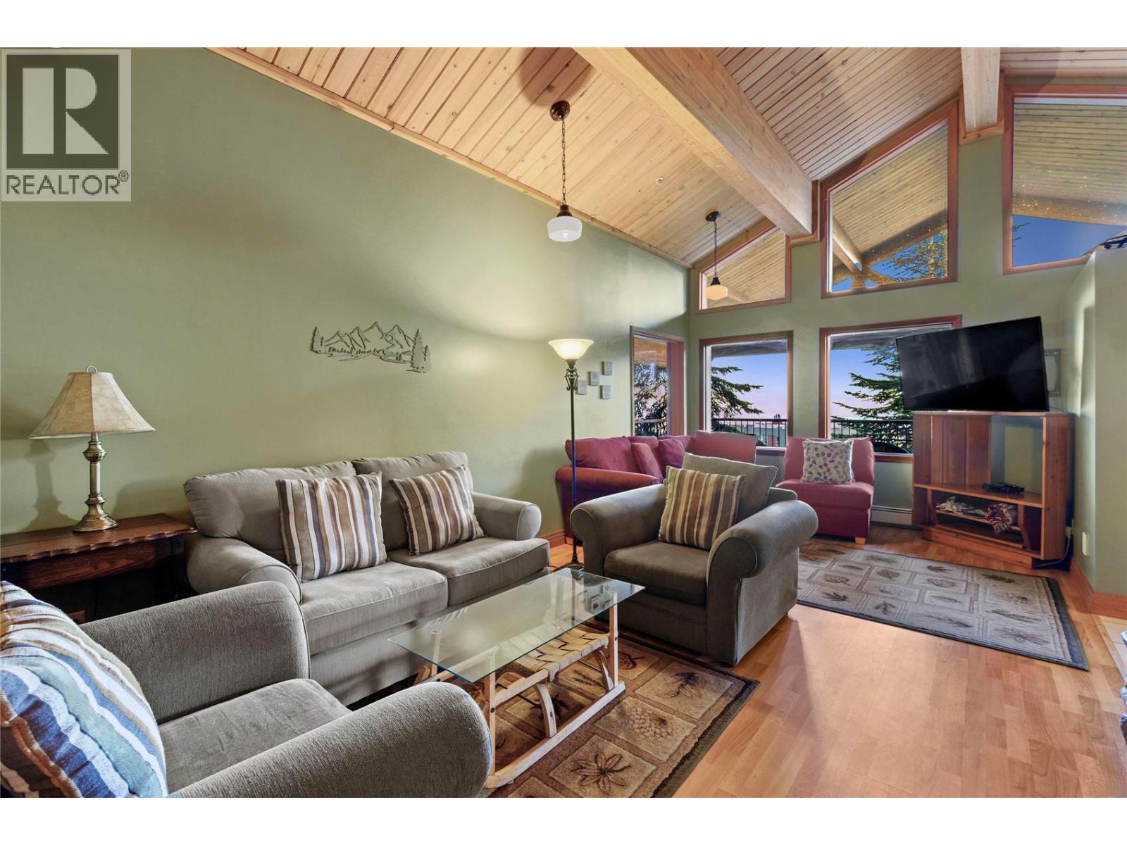 Spacious 2,948 sq. ft. ski-in/ski-out stand-alone chalet ideally positioned at the very top of the village at Big White Ski Resort, offering exceptional privacy on a rare 0.20-acre treed lot with ample parking. Enjoy breathtaking mountain views from dual balconies and unwind in the private hot tub after a day on the slopes. This classic alpine retreat showcases soaring vaulted ceilings, impressive timber construction, and a thoughtful layout with a bathroom for every bedroom. The upper level is a true showpiece, featuring a dramatic floor-to-ceiling stone fireplace anchoring the open-concept kitchen, dining, and living area—perfect for entertaining. Three upper-level bedrooms each offer their own ensuite, while an additional bedroom and bath are located on the main level. The spacious lock-off suite includes three bedrooms and a full bathroom, creating excellent flexibility for personal use or rental income. With strong short-term and medium-term rental potential, this property offers both lifestyle and investment appeal. Fully furnished with the essentials and ready for your personal touch. This is a rare opportunity to own a private mountain getaway in one of Big White’s most desirable ski-in/ski-out locations. View the virtual tour and book your private showing today. (id:58842)