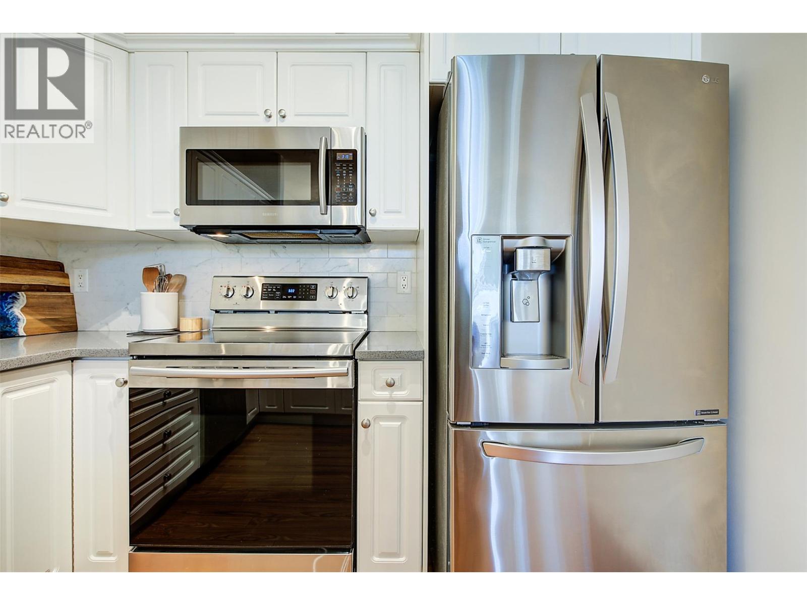 TOP FLOOR. QUIET SIDE. WALKING DISTANCE TO EVERYTHING! Enjoy penthouse living in the Lower Mission with this pristine 1 bedroom + den condo in a prime location! With approx 984 sqft of living space, 9’ vaulted ceilings & large windows bring an abundance of natural light into this unit without the afternoon heat on the cool side of the building. The kitchen has been refreshed with updated counters, sink, backsplash + SS appliances with an option for a sit up pennisula that opens to the dining room with modern lighting. The open great room is centred around a cozy fireplace & flows out to a spacious, covered balcony with peek-a-boo views of Black Mountain. The perfect spot for summer BBQ's after a day at the beach! The primary bedroom is oversized, while the den, complete with a window & adjacent laundry/storage, easily functions as a 2nd bedroom or home office. A 4-pc bath with tile floors & welcoming foyer with coat closet round out the layout. Modern paint colours makes this condo feel move-in ready in a well maintained, pet friendly (with restrictions) building that offers a guest suite, tons of visitor parking & new surveillance system. This unit has 2 PARKING STALLS (1 assigned underground, 1 unassigned outdoor) plus a storage locker! Walk to Bluebird Beach (650m), H2O pool & fitness centre, MNP Place (350m), sportsfields, golf, Mission Creek Greenway, Bright Jenny Coffee, numerous schools, parks & all the amenities the Lower Mission provides! FAST POSSESSION IS POSSIBLE! (id:58842)