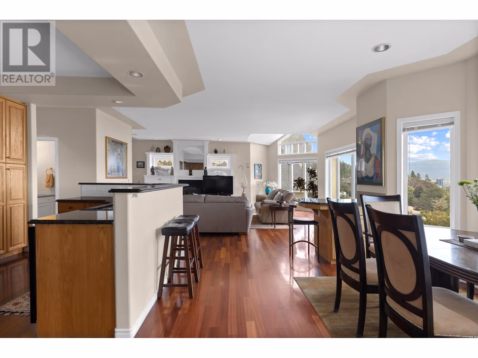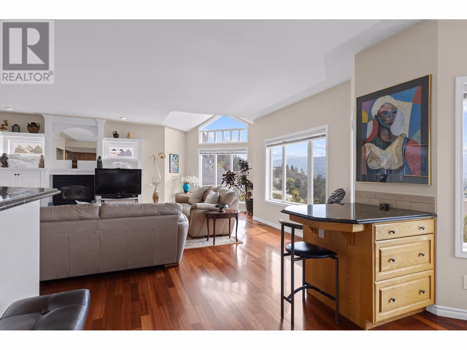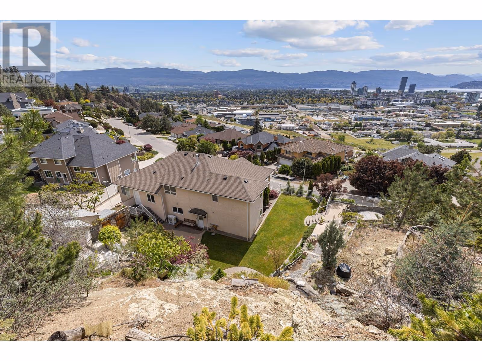 A Rare Gem on Mount Royal! Welcome to one the City’s most prestigious and centrally located neighbourhoods adjacent to Knox Mountain Park with 367 HA of natural beauty! Located minutes from downtown, yet worlds away with breathtaking panoramic views of the Kelowna skyline and Okanagan lake. This southwest-facing masterpiece offers ever-changing vistas through expansive windows and thoughtfully designed open-concept spaces. A unique front-to-back split layout spans four distinct levels, blending style and functionality throughout.The main level features a spacious great room, cozy dining nook, private office, enclosed den, and a formal dining area—perfect for both entertaining and everyday living. Upstairs, retreat to the luxurious primary suite, complete with a five-piece ensuite. The lower levels offer versatile living with two additional bedrooms and a full bath, while the walk-out guest suite includes two more bedrooms, a generous family room, and a kitchenette—ideal for visitors or extended family. Step outside to a private, park-like oasis on .88 acres, with beautifully landscaped pathways and artistic rock walls leading to a secluded observation deck with natural gas firepit and an area pre-wired for a hot tub. The rear yard features a custom built 50ft waterfall - bringing both visual and audible beauty to this natural paradise. Extensive storage in crawl space. Experience the ultimate in privacy, comfort, and natural beauty—this is Mount Royal living at its finest. (id:58842)