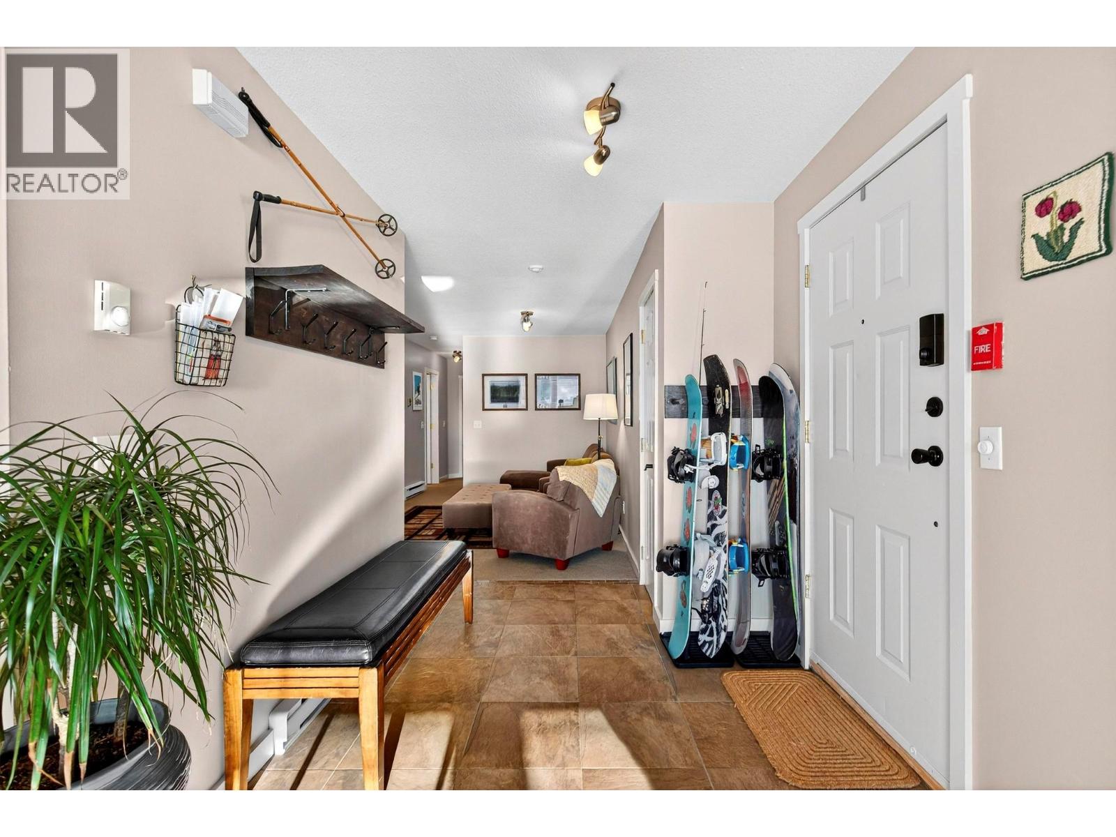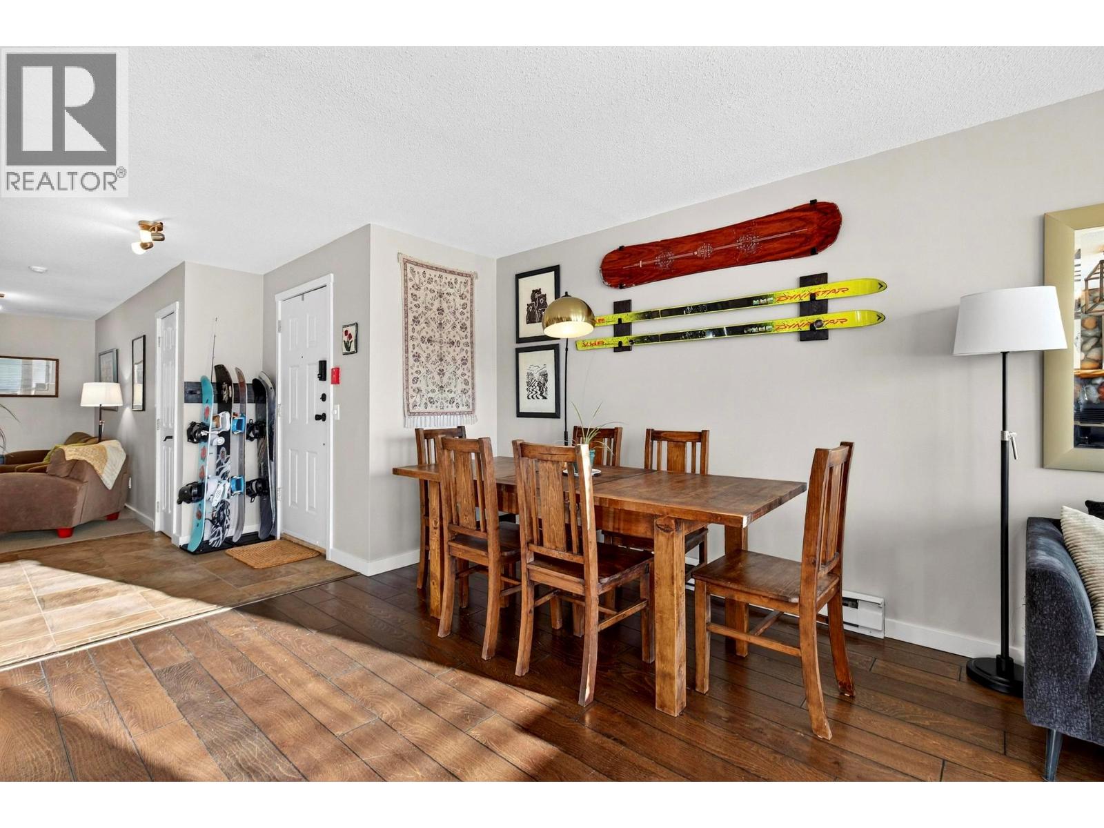 A warm and inviting mountain retreat perfectly designed for both personal enjoyment and short-term rental success. This beautifully updated condo is Airbnb-able, true ski-in/ski-out access, and shared hot tub amenities through the Winter Ridge strata partnership. Step into a bright, open living space flooded with natural light from the wall of west-facing windows. The spacious layout features rich wood flooring, charming mountain decor, and a cozy gas fireplace set into a stunning river-rock surround, creating the perfect apres-ski atmosphere. The dining area comfortably hosts large groups, making this an ideal space for families and guests. The kitchen has stainless steel appliances, warm wood cabinetry, a generous peninsula with bar seating, and plenty of prep space. Whether you're cooking for guests or hosting friends, the flow of this kitchen-to-living space feels effortless. From the living room, step out onto the private deck and take in the expansive mountain and valley views, a true Big White highlight. This is the perfect spot for morning coffee or watching the sun set over the snow-covered rooftops. The bedroom is spacious and comfortable with good storage, and the unit includes a well-kept bathroom and convenient in-suite laundry. Located just minutes from the Village, this complex sits in a quiet, elevated area with excellent ski access. (id:58842)
