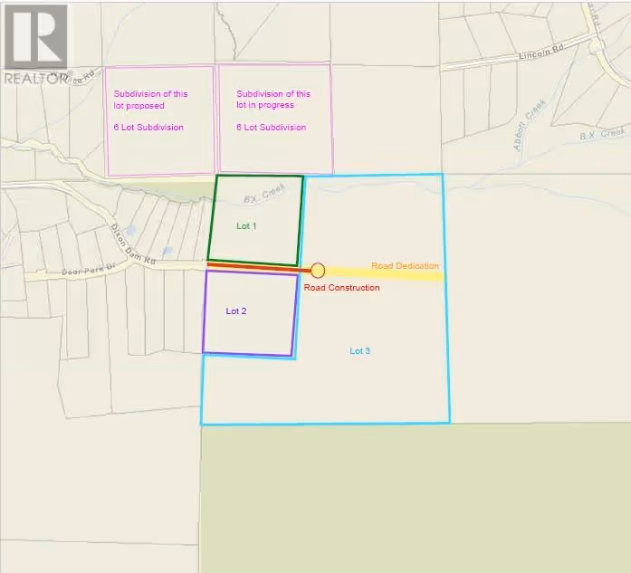 170+ acres of prime acreage development. Gently sloped property ideal for gorgeous views. At the end of Dixon Dam Rd ensuring privacy. Numerous walking and riding trails throughout the property and running along the edge of the property is the comforting light sound of BX Creek. Enjoy the walking trails around the creek and be assured by its steady and easygoing flow that water is available. Extensive trail networks through out the property allow for access and viewing of properties development potential. The Seller had plans for a small 2 phase subdivision of two 18(+/-) acre lots however the properties Official Community Plan is for 5 acre lots (34 lot max). Adjacent to the property are two 6 lot subdivisions of 5(+/-) acre lots being developed as well as a close proximity property with a 27 lot 5(+/-) acre subdivision being proposed. The value per acre of this property is the best on the market right now. This is a real opportunity to purchase a private acreage with both immediate and future potential. This is a rare 170+ acres with many drivable roads and walking trails, you can see with your own eyes the tremendous value you are getting and astounding natural beauty. By appointment only, there is a large locked gate at the driveway with enough concrete blocks to give the appearance of the entrance to a fortress. Buyers must be accompanied by an agent at all times. (id:58842)