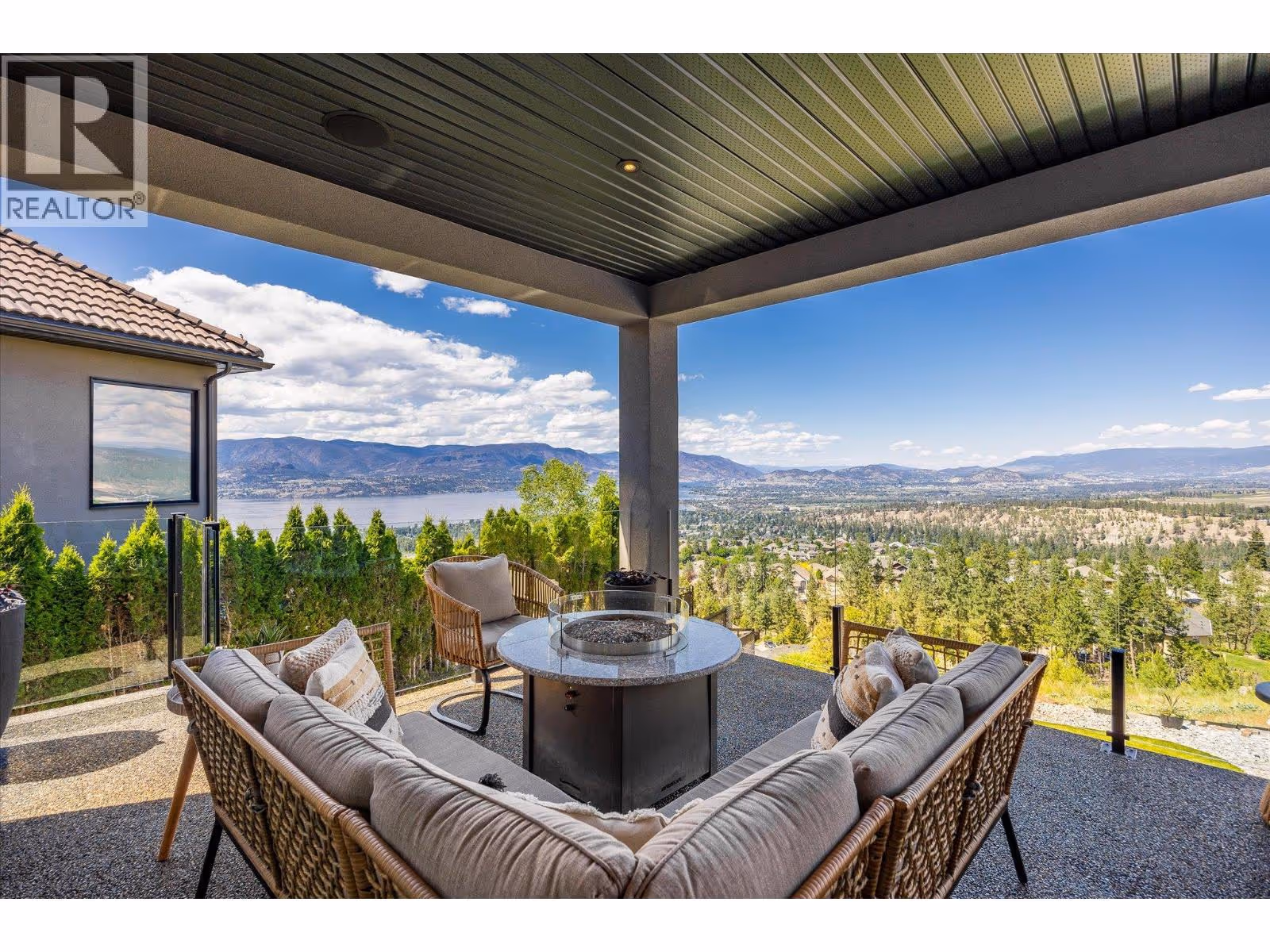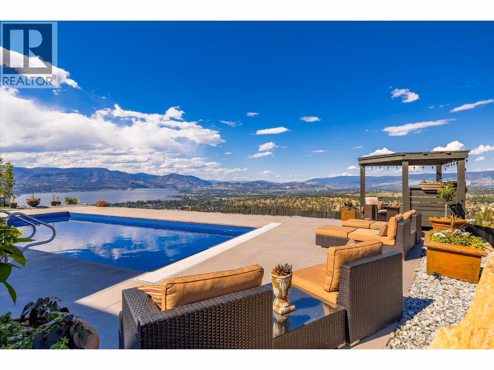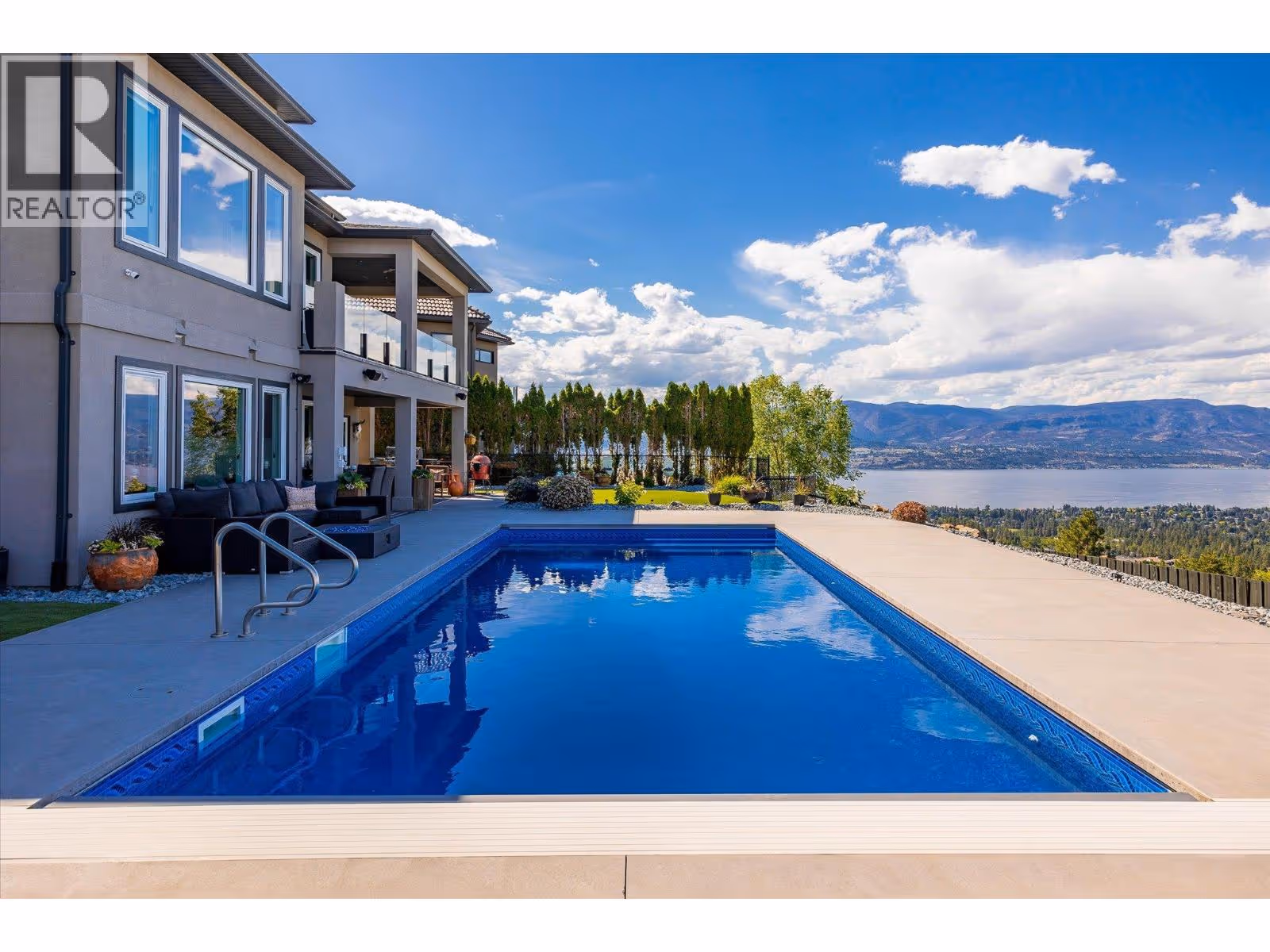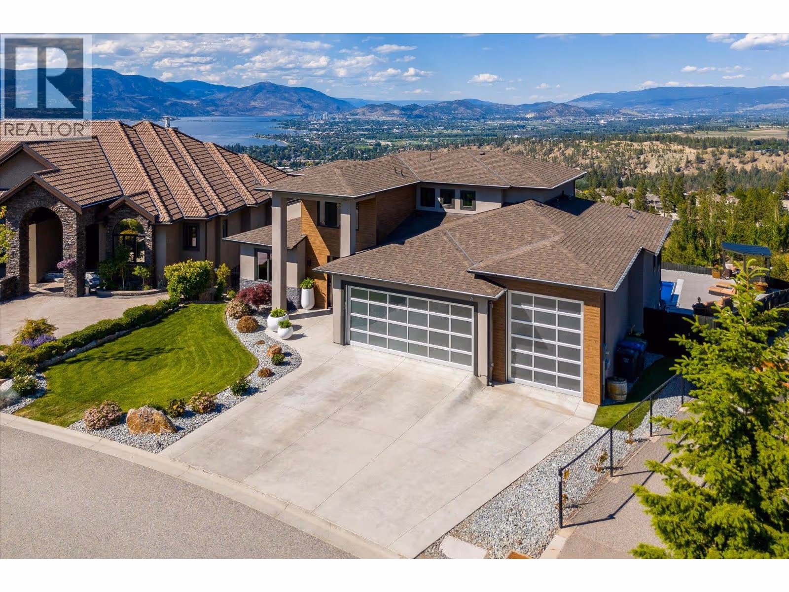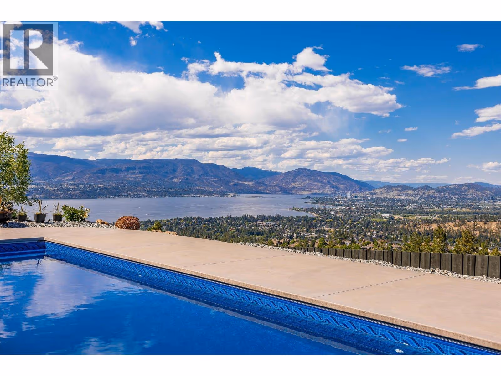 Welcome to this fully updated, exquisite 5 bedroom + den, 4 bathroom home, where no detail has been overlooked. As you step through the grand entrance, you are greeted by soaring vaulted ceilings and a chef's kitchen, complete with top-of-the line appliances and a butler's pantry. The heart of this home showcases breathtaking 180-degree vistas, seeing all of Kelowna, creating a mesmerizing backdrop for everyday living. The opulent primary suite is tucked away in a private corner of the main floor, offering a tranquil sanctuary with stunning lake views and a spa- like ensuite. Two additional generously sized bedrooms are located upstairs, providing ample space and privacy for family and guests. The lower walk-out level is an entertainer's paradise, featuring a sophisticated whiskey tasting room, an exquisite wine cellar, a stylish bar, a spacious rec room, and a state-of-the-art theatre room. This level seamlessly transitions to a private backyard and pool area, where the panoramic views are simply unmatched. Completing this magnificent property are four garage spots, including a double garage and a tandem garage, equipped with EV charging and ample space for a boat or RV. With plenty of parking, convenience and luxury are ensured at every turn. This home combines elegance, functionality, and breathtaking scenery, making it a true masterpiece. (id:58842)