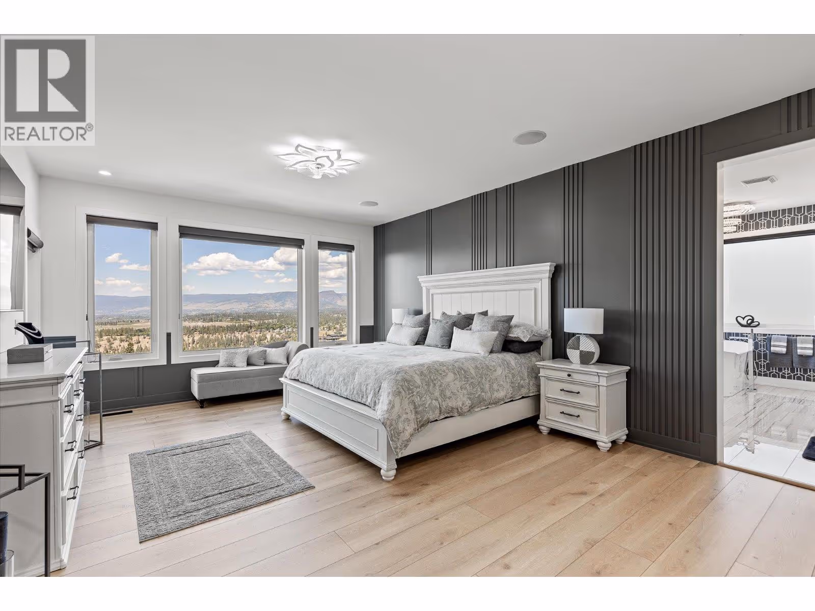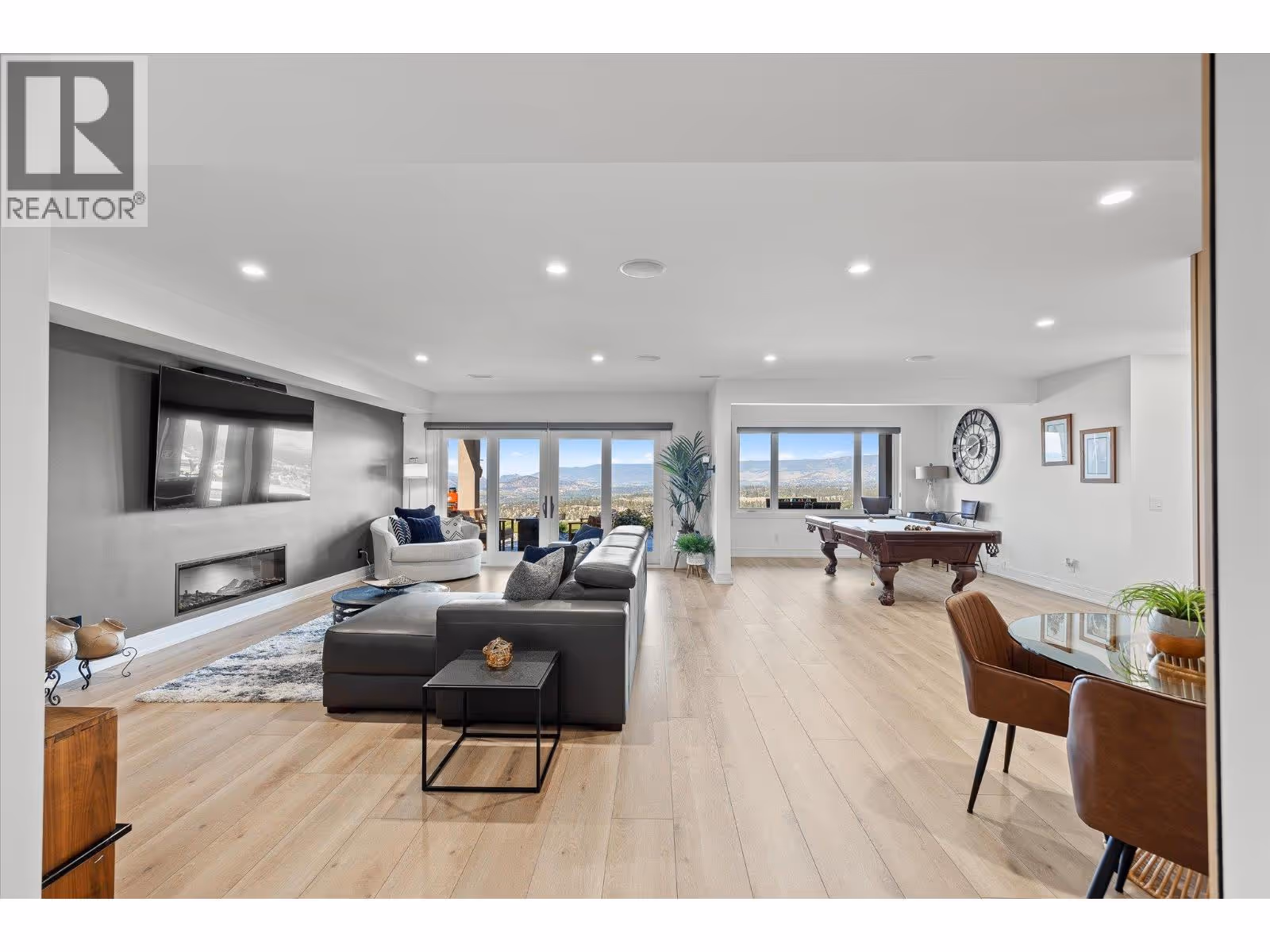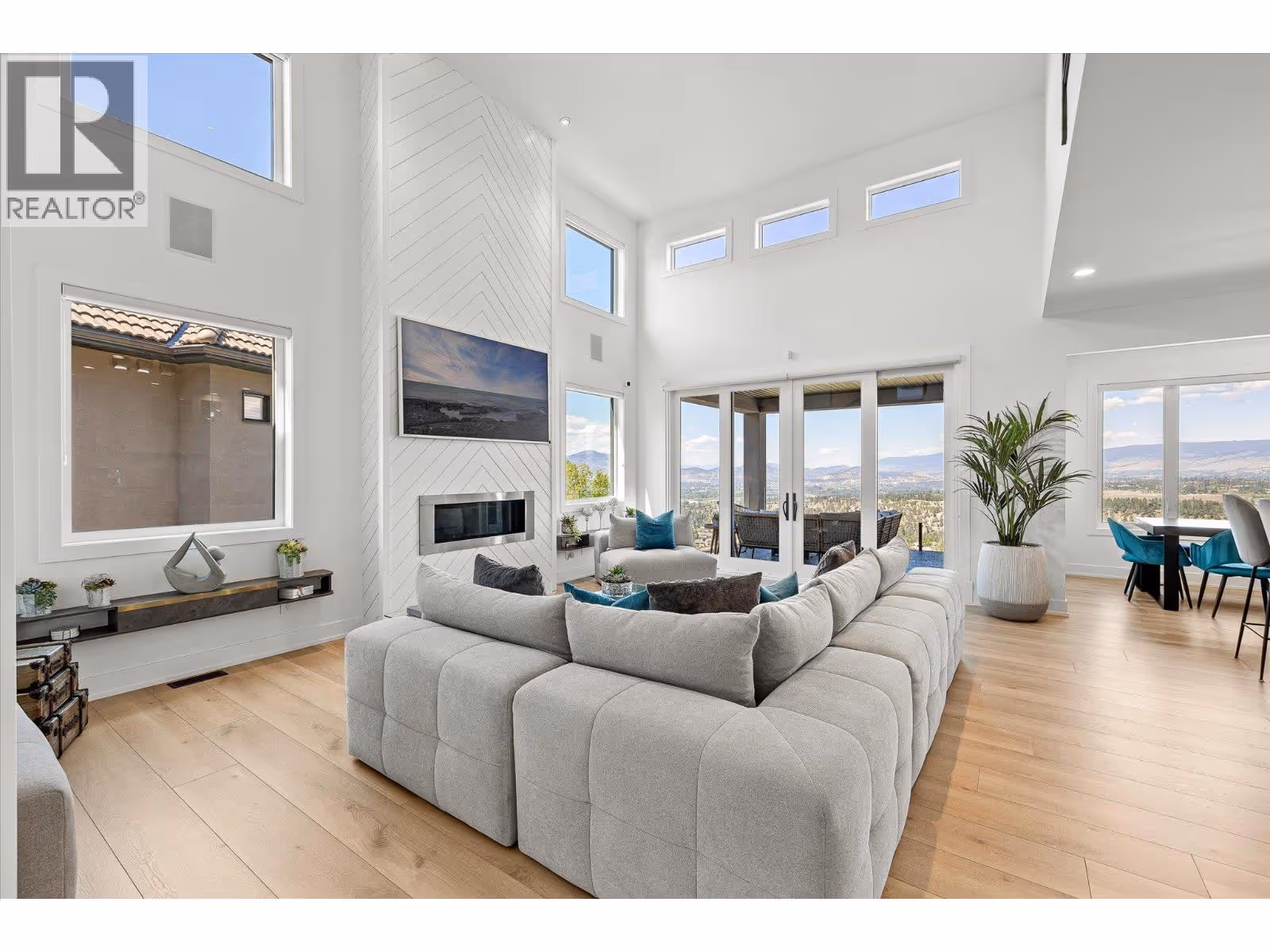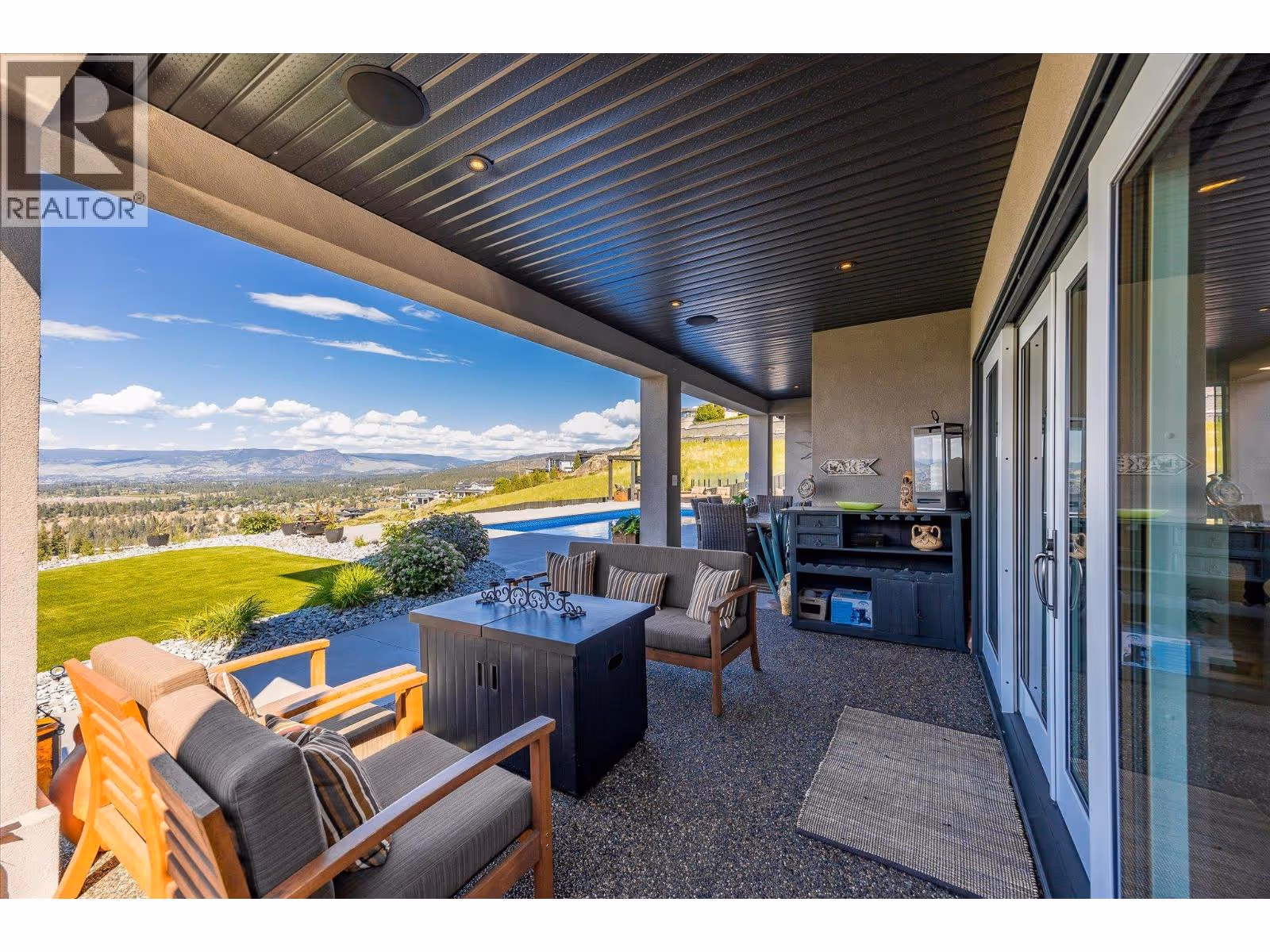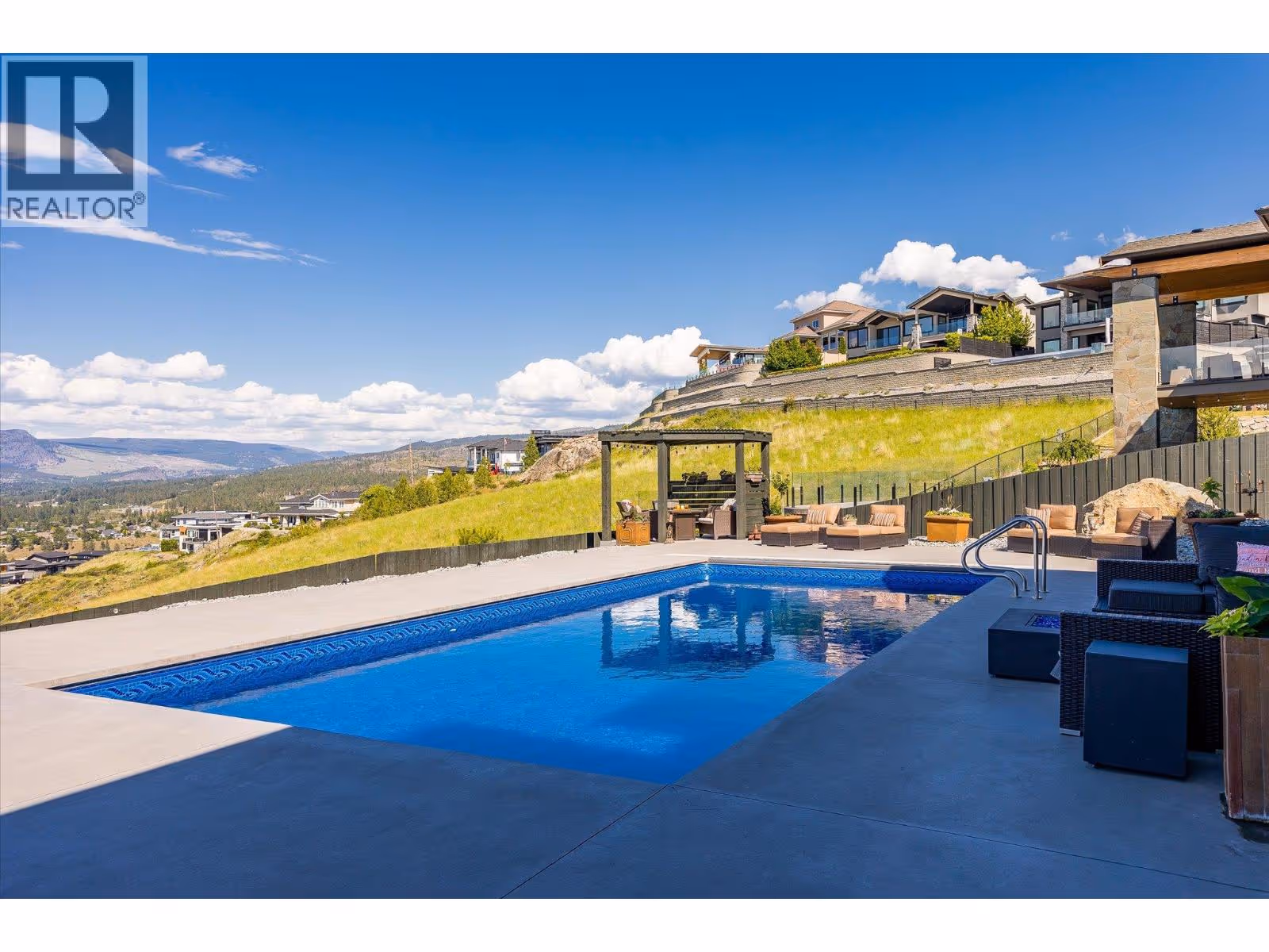 Welcome to this fully updated, exquisite 5 bedroom + den, 4 bathroom home, where no detail has been overlooked. As you step through the grand entrance, you are greeted by soaring vaulted ceilings and a chef's kitchen, complete with top-of-the line appliances and a butler's pantry. The heart of this home showcases breathtaking 180-degree vistas, seeing all of Kelowna, creating a mesmerizing backdrop for everyday living. The opulent primary suite is tucked away in a private corner of the main floor, offering a tranquil sanctuary with stunning lake views and a spa- like ensuite. Two additional generously sized bedrooms are located upstairs, providing ample space and privacy for family and guests. The lower walk-out level is an entertainer's paradise, featuring a sophisticated whiskey tasting room, an exquisite wine cellar, a stylish bar, a spacious rec room, and a state-of-the-art theatre room. This level seamlessly transitions to a private backyard and pool area, where the panoramic views are simply unmatched. Completing this magnificent property are four garage spots, including a double garage and a tandem garage, equipped with EV charging and ample space for a boat or RV. With plenty of parking, convenience and luxury are ensured at every turn. This home combines elegance, functionality, and breathtaking scenery, making it a true masterpiece. (id:58842)