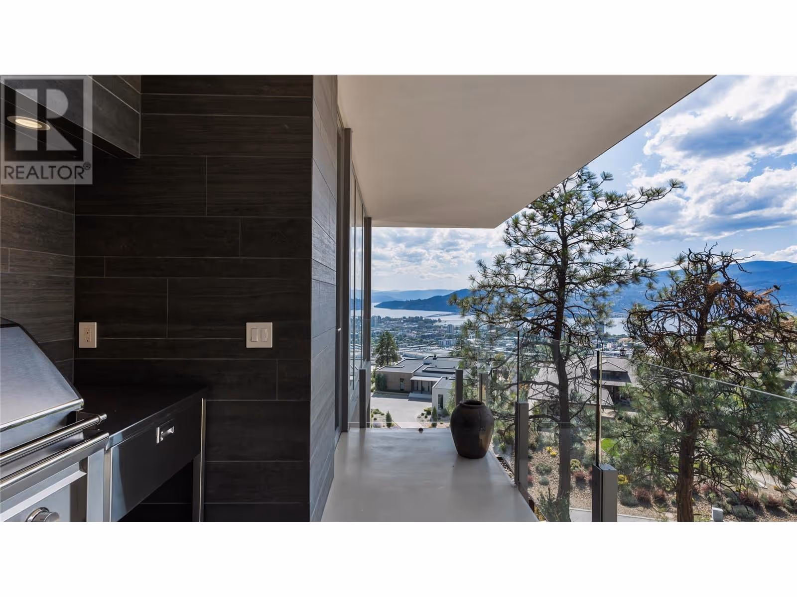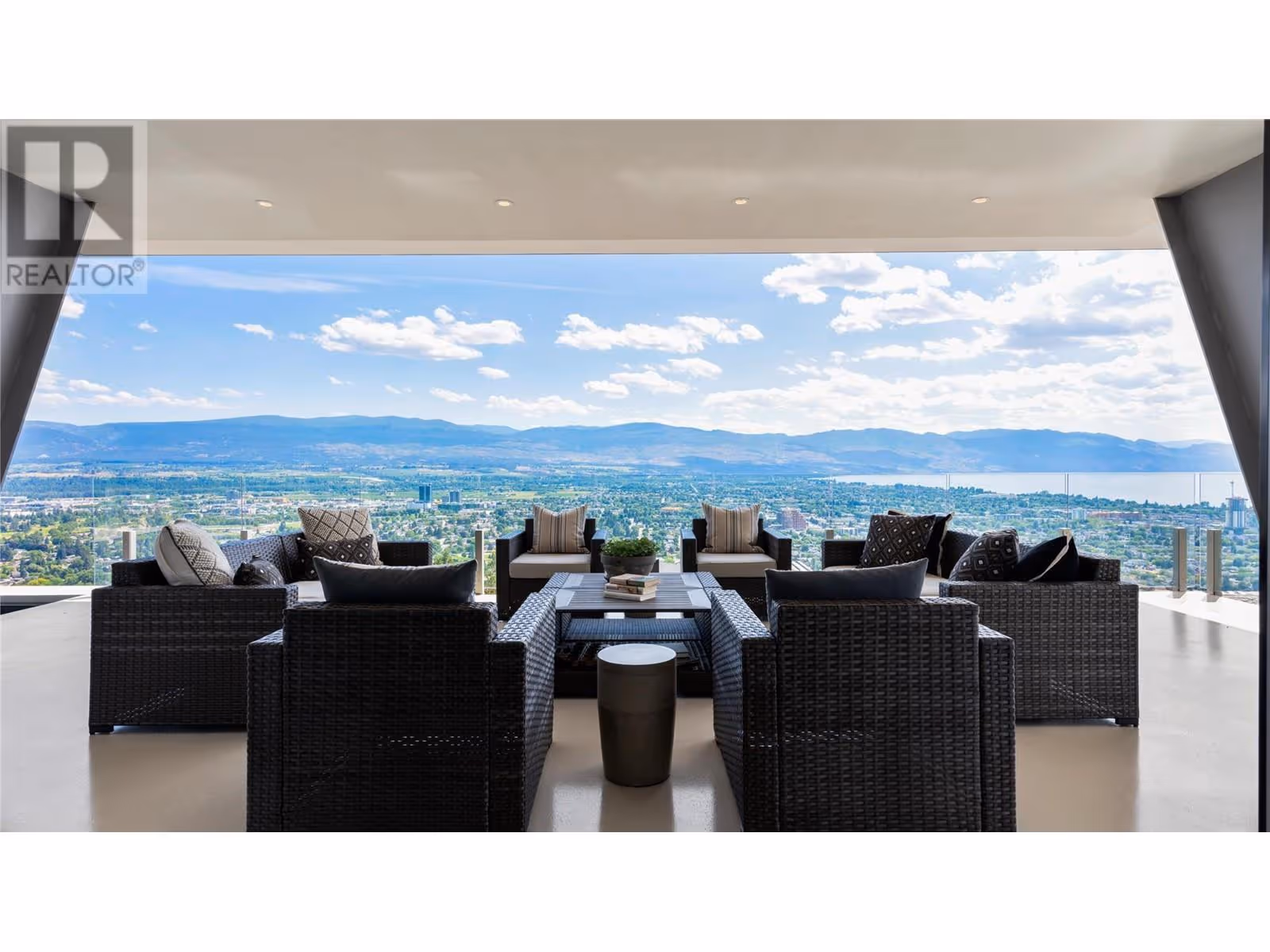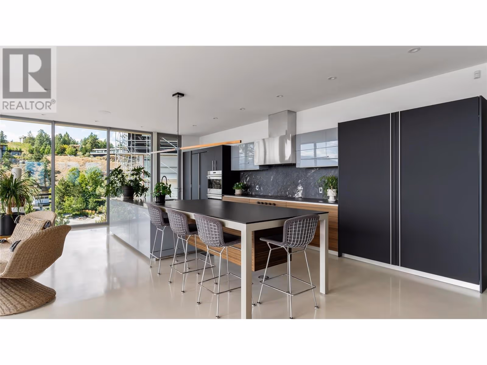 Welcome to this architectural home with world class attention to detail, in Kelowna’s exclusive enclave of Highpointe. The grand entryway greets with lush landscaping and corten steel water feature to enhance the luxurious Italian tile and polished concrete of the foyer. Immediately you are captivated by breathtaking views of the city and lake through the floor-to-ceiling windows. The main living space contains the great room which opens onto the kitchen, finished with custom Italian cabinetry and integrated Wolf & Sub-Zero appliances. The expansive patio & pool deck stretches the length of the home, providing limitless outdoor living. The primary suite is designed to take full advantage of the views, and flows seamlessly to the pool deck. Finishing this level are two more stunningly appointed bedrooms, and a large flex room perfect for a games room, bar/lounge, or gym - also with access to the pool deck. Downstairs is a stylish lounge with wet bar perfect for enjoying music and movies, plus an additional bedroom, bathroom, kitchenette, and recreation area. The entire home features radiant heated polished concrete flooring. The garage features a car elevator, which accesses the 2,690sqft finished lower level garage space, which could be customized to meet virtually any use, complete with independent heating and air filtration. This home was constructed mainly with concrete and steel, Incorporating extensive steel beams and cantilevered spaces. This masterpiece stands apart. (id:58842)