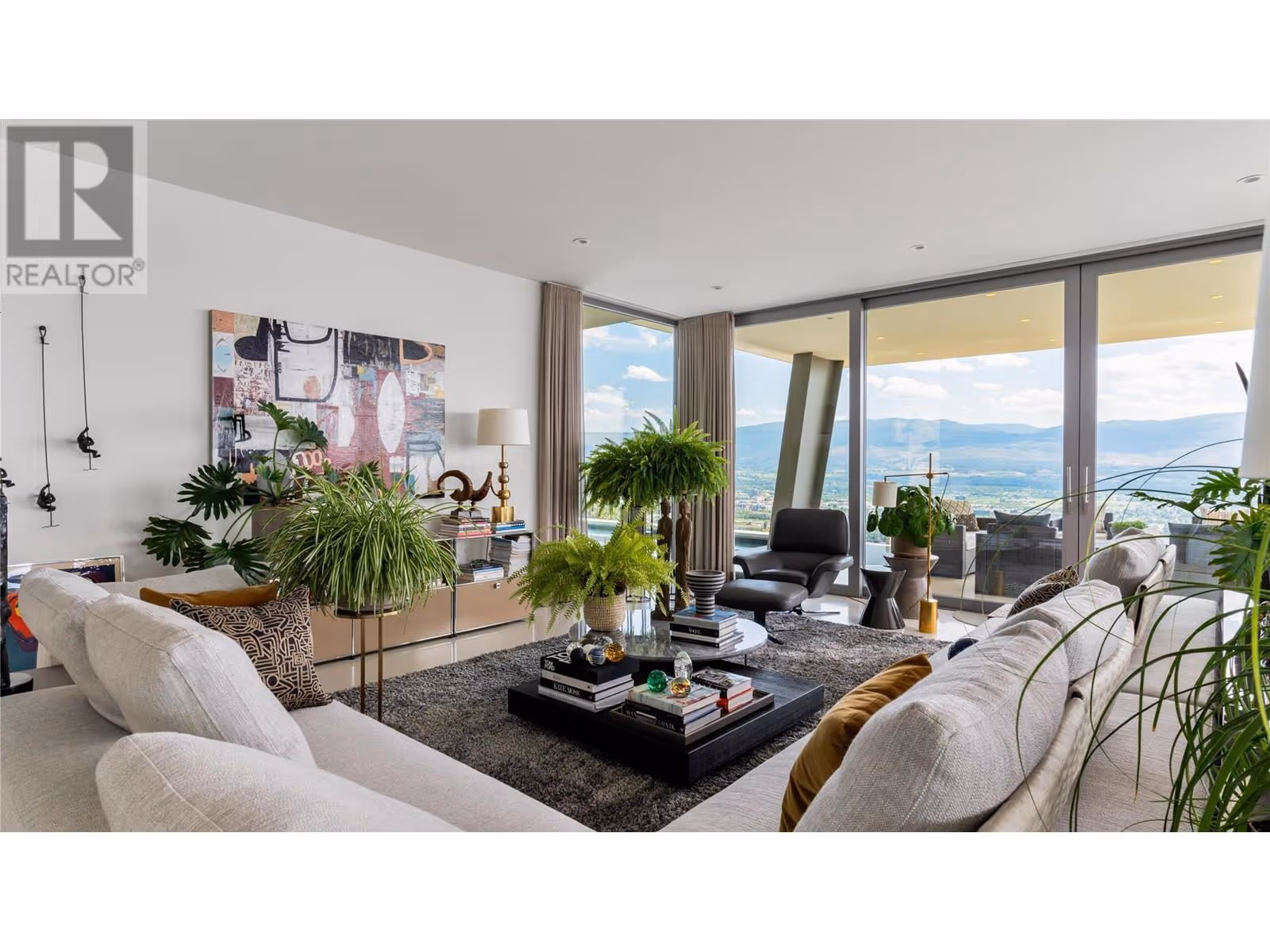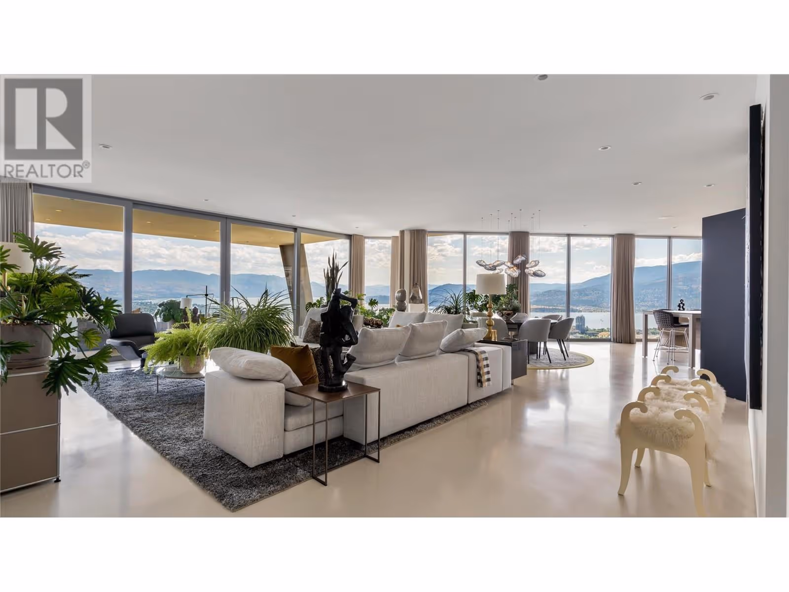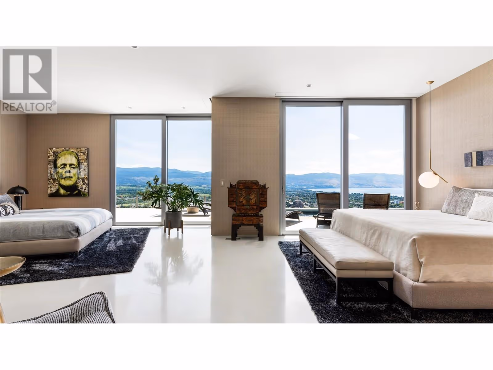 Welcome to this architectural home with world class attention to detail, in Kelowna’s exclusive enclave of Highpointe. The grand entryway greets with lush landscaping and corten steel water feature to enhance the luxurious Italian tile and polished concrete of the foyer. Immediately you are captivated by breathtaking views of the city and lake through the floor-to-ceiling windows. The main living space contains the great room which opens onto the kitchen, finished with custom Italian cabinetry and integrated Wolf & Sub-Zero appliances. The expansive patio & pool deck stretches the length of the home, providing limitless outdoor living. The primary suite is designed to take full advantage of the views, and flows seamlessly to the pool deck. Finishing this level are two more stunningly appointed bedrooms, and a large flex room perfect for a games room, bar/lounge, or gym - also with access to the pool deck. Downstairs is a stylish lounge with wet bar perfect for enjoying music and movies, plus an additional bedroom, bathroom, kitchenette, and recreation area. The entire home features radiant heated polished concrete flooring. The garage features a car elevator, which accesses the 2,690sqft finished lower level garage space, which could be customized to meet virtually any use, complete with independent heating and air filtration. This home was constructed mainly with concrete and steel, Incorporating extensive steel beams and cantilevered spaces. This masterpiece stands apart. (id:58842)