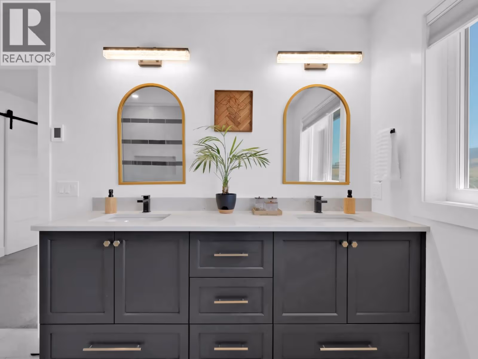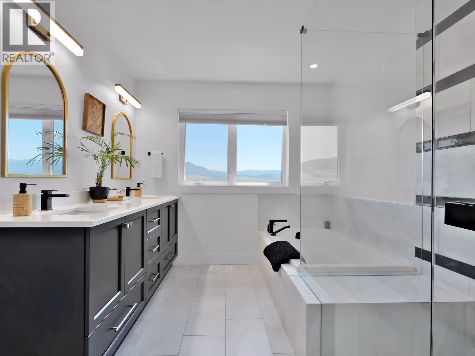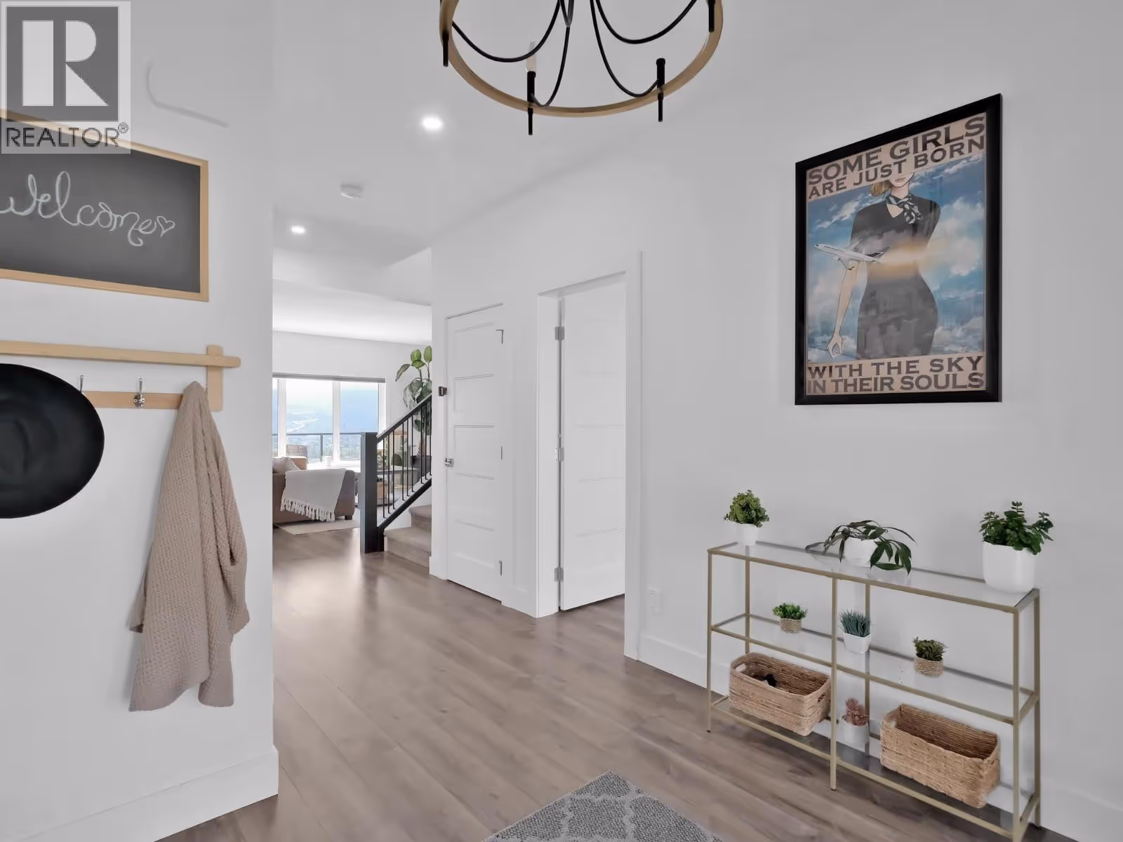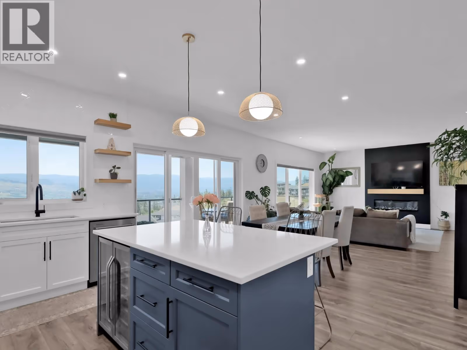 Discover this beautifully designed home located just minutes from UBCO, the airport, and only a 15-minute drive to downtown Kelowna. The bright and open-concept main level features a bedroom/den, a stunning two-toned kitchen with quartz countertops, walk-in pantry, and a large island perfect for entertaining. The spacious great room includes a cozy gas fireplace and opens to a generous deck with both covered and uncovered areas to enjoy the mountain views. Upstairs, you’ll find three bedrooms, two bathrooms, a secondary living area, and a full laundry room with built-in storage. The luxurious primary suite offers a soaker tub, double vanity, and ample storage. All bathrooms, including those in the suite, feature heated floors for added comfort. The lower level boasts a high-end, LEGAL 1-bedroom walk-out suite complete with quartz counters, a private covered patio, bar fridge, walk-in pantry, and a spacious walk-in closet. Great for multi generational living or as a mortgage helper. An attached heated double garage adds convenience, and a brand-new kids’ park just down the street on Acadia makes this the perfect family-friendly location. (id:58842)