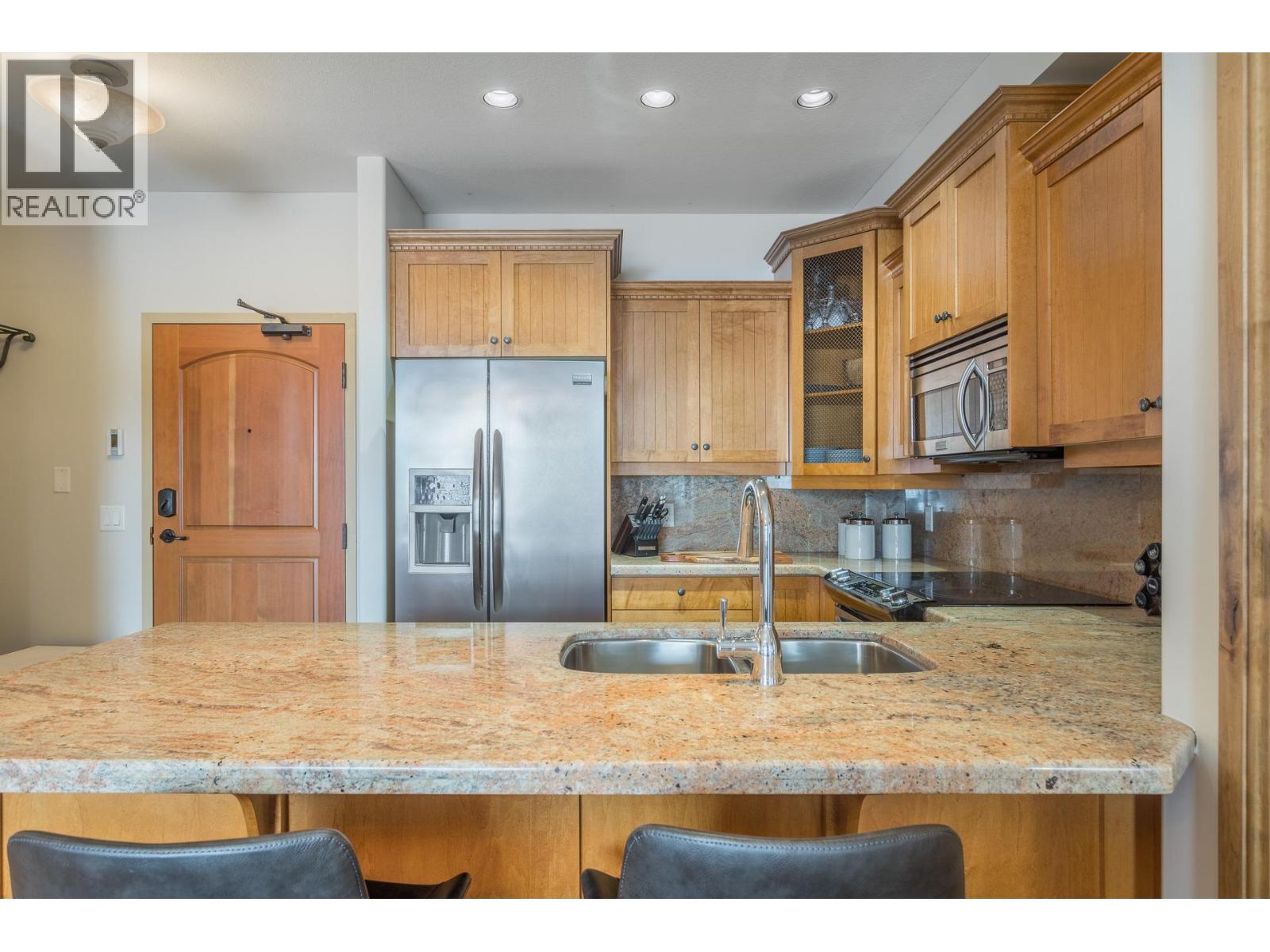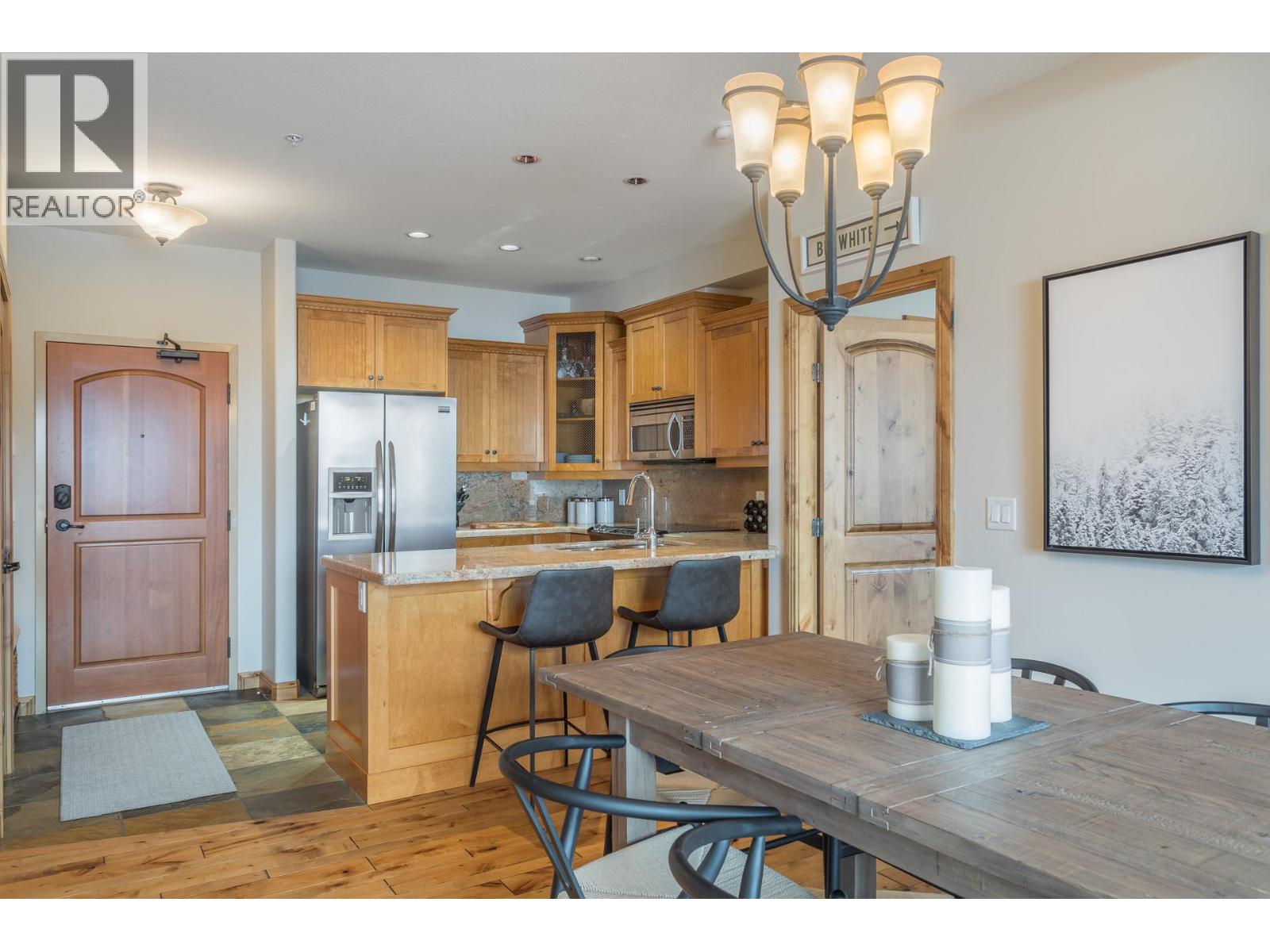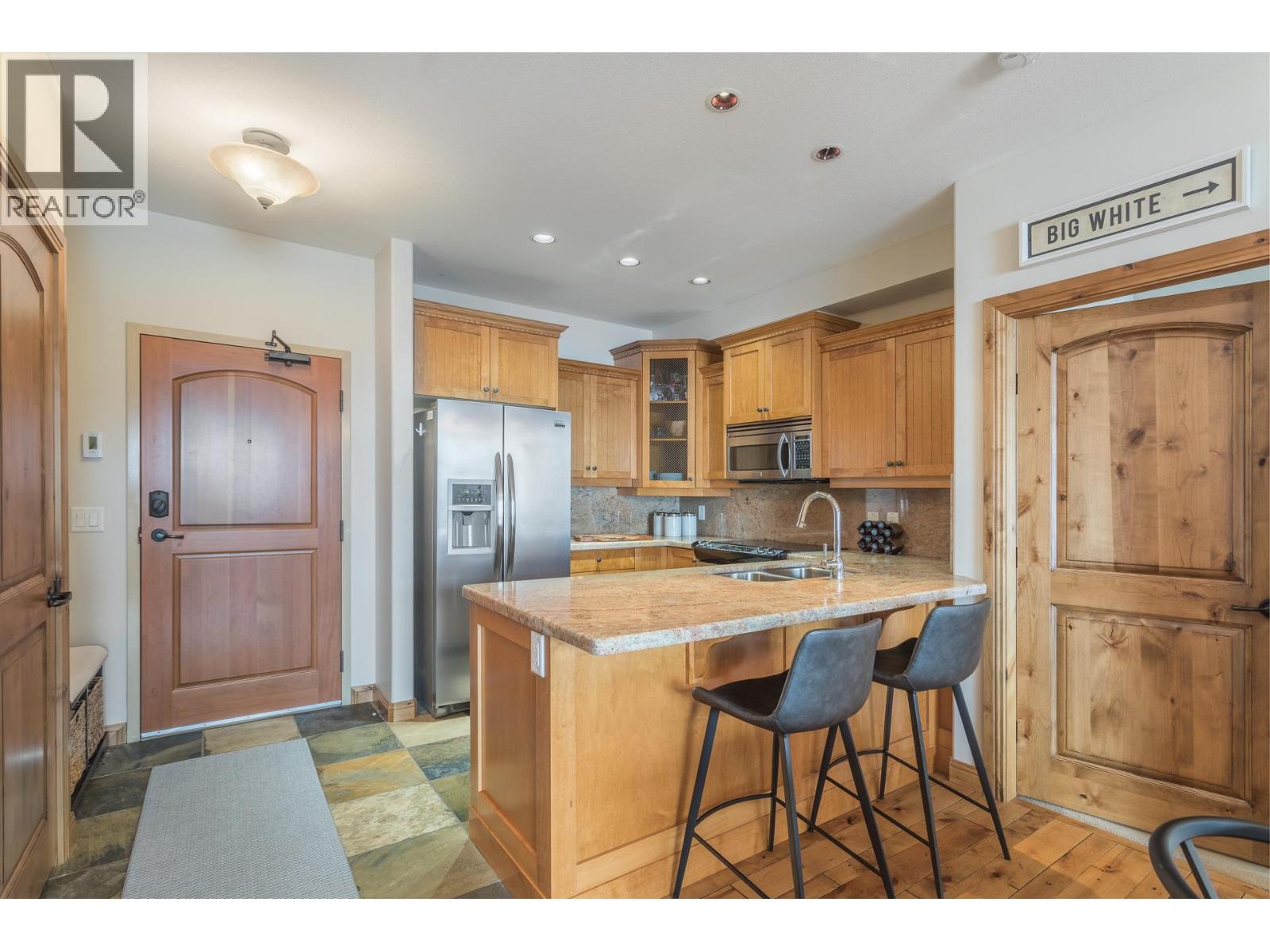 Welcome to your very own TOP FLOOR alpine retreat at Big White Ski Resort with your own PRIVATE HOT TUB! This 2 bedroom, 2 bathroom condo blends chalet charm with investor-friendly benefits, the Aspens offers true ski in/out access and sweeping mountain views that create a serene year round backdrop. The bright and welcoming open kitchen with excellent storage has granite counters and a sit up bar for entertaining. This leads into the dining and spacious living room anchored by a stone faced gas fireplace with built in storage and a large window that pours in natural light. A private balcony off the living room features a dedicated hot tub, a true highlight and perfect for apres ski soaks and Summer nights under the stars that extend your living space outdoors. The generously sized primary and second bedroom, sit on opposite ends of the unit for privacy, and the ensuite offers a glass door shower and ample storage, while the overall layout keeps entertaining and everyday living effortless. There is in-suite stacked laundry and a dedicated ski locker that keeps gear ready for the next run, with easy access to village restaurants shopping & The Market. There is NO GST on this home, short term rentals are permitted and Big White is exempt from foreign buyer and spec taxes, offering flexibility and peace of mind. Enjoy a lifestyle retreat that also performs as an income ready investment for ski enthusiasts and investors. (id:58842)