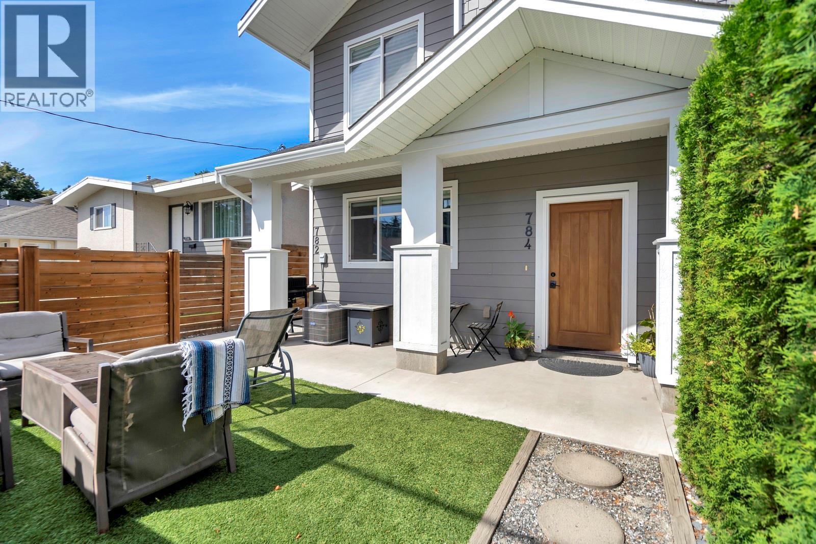Bright and Affordable Living on Glenwood! Located at the front of the complex, this 2 bedroom 2 bathroom townhome offers 1,208 sq.ft. in one of Kelowna’s most walkable areas. Perfect for first time buyers, small families or investors, this home blends comfort, style and convenience. The kitchen features quartz counters, island seating and stainless steel Samsung appliances. Vinyl flooring flows through the open concept main level, where natural light fills the living and dining areas. Built in 2018, the home has modern finishes, an electric fireplace and smart storage. Upstairs, the primary bedroom includes a walk in closet and 3 piece ensuite with tiled shower. The second bedroom has a built in closet and access to a full bathroom with tub and shower combo. Outside, enjoy a private patio with synthetic turf, gas BBQ hookup and water connection, ideal for entertaining or relaxing. The garage provides covered parking with 10 foot doors and 12 foot ceilings. Just a five minute walk to Kelowna General Hospital and beaches, and minutes to shops, conveniences and downtown. The street is being upgraded with new sidewalks, drainage, trees and added parking, all set for completion this fall. Low strata fees and pet friendly bylaws for both dogs and cats make ownership easy. Also available is 782 Glenwood, a 3 bedroom 2.5 bathroom unit listed at $625,000. Schedule your showing today and see why Glenwood is such a desirable place to call home! (id:58842)