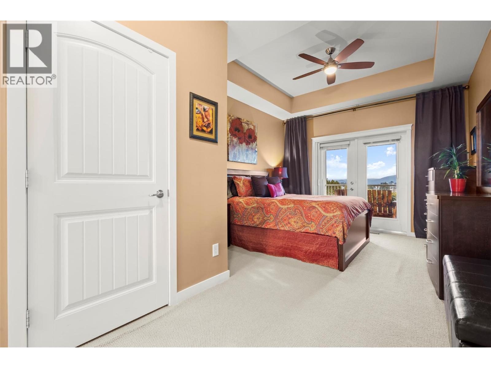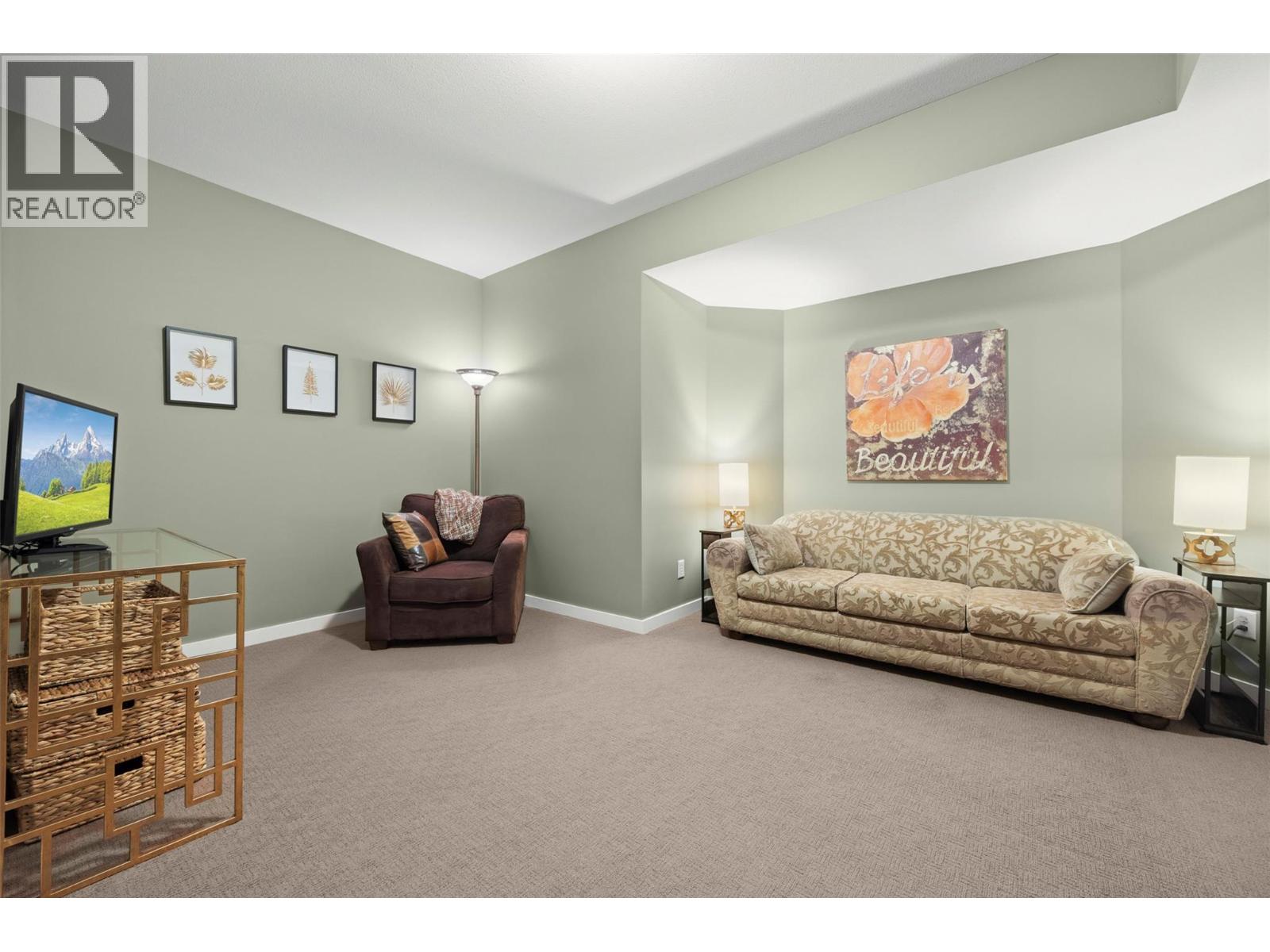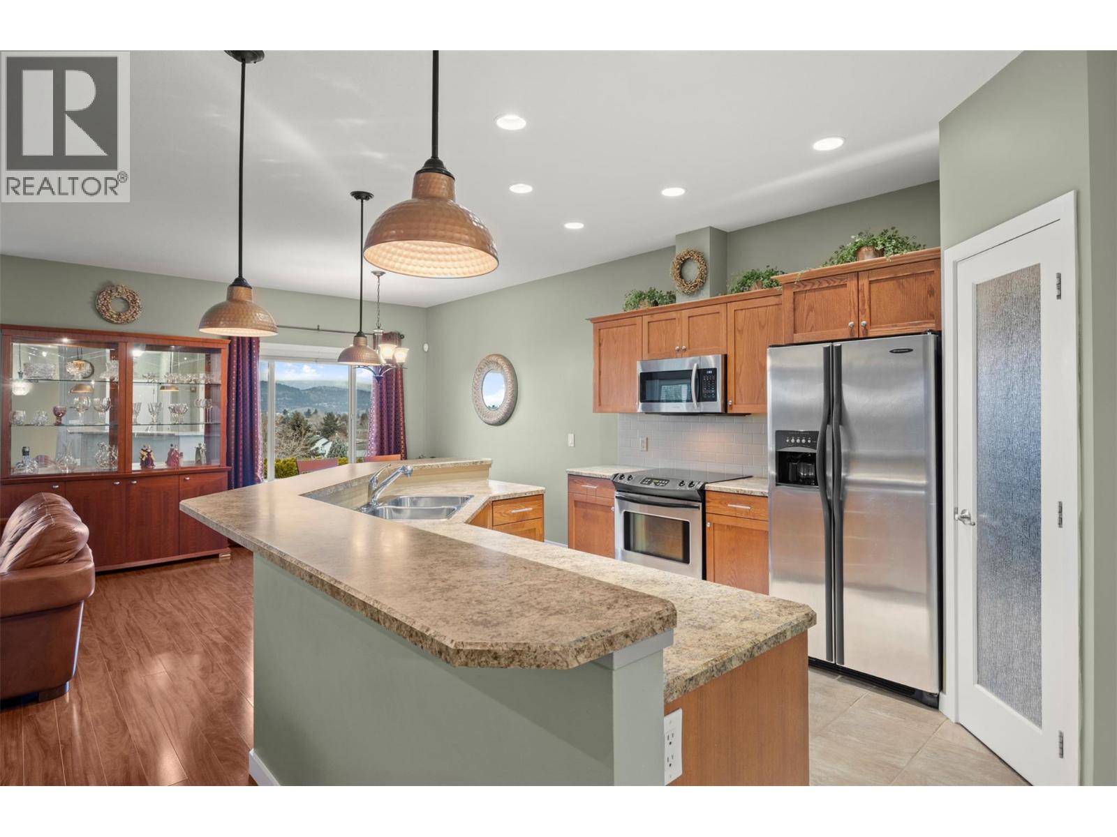 Walkout rancher half-duplex in The Ridge offering mountain views and a spacious 2,700+ sq ft layout with 4 bedrooms, 3 bathrooms, and potential for a 5th bedroom. Flat driveway parking for two plus an oversized double garage with an 18’ door. The open-concept main level features a bright kitchen, dining, and living area that opens to a covered view deck with gas BBQ hookup. The main floor also includes a primary suite with ensuite and walk-in closet, a guest bedroom or office, full bath, pantry and laundry. The fully finished walkout level offers generous family and recreation space, an additional guest bedroom, full bath, office/den, and a private patio with landscaped yard. Pet-friendly (2 pets: one dog + one cat, or two dogs or two cats - no size restrictions), no age restrictions, and quick possession available. Ideally located within 400 m of transit and under 1 km to schools, the YMCA, shopping, parks, trails, and the Big White shuttle, with easy access to UBCO and the airport. (id:58842)